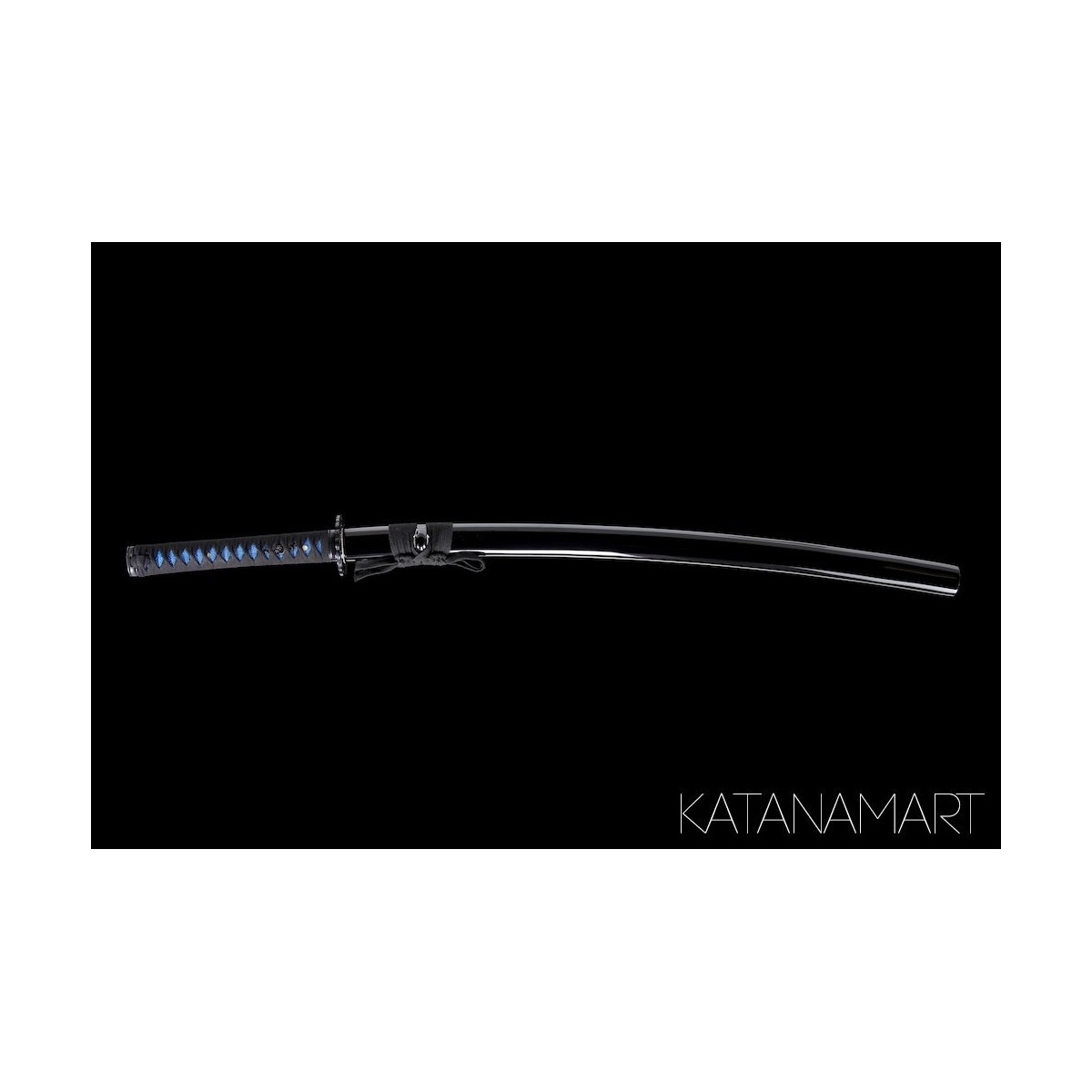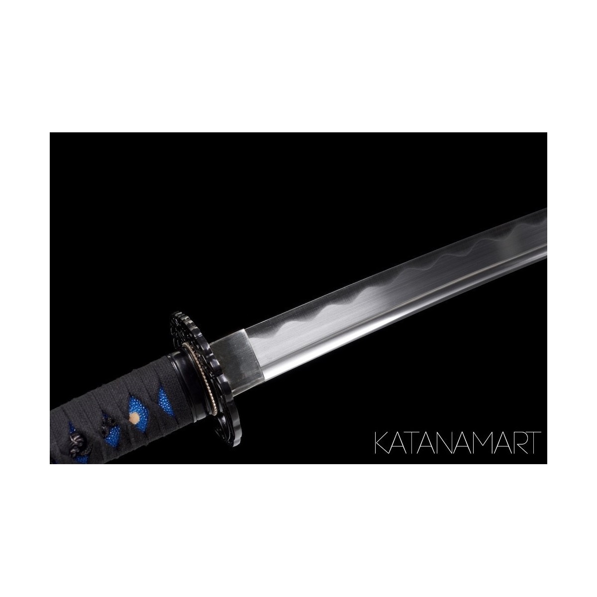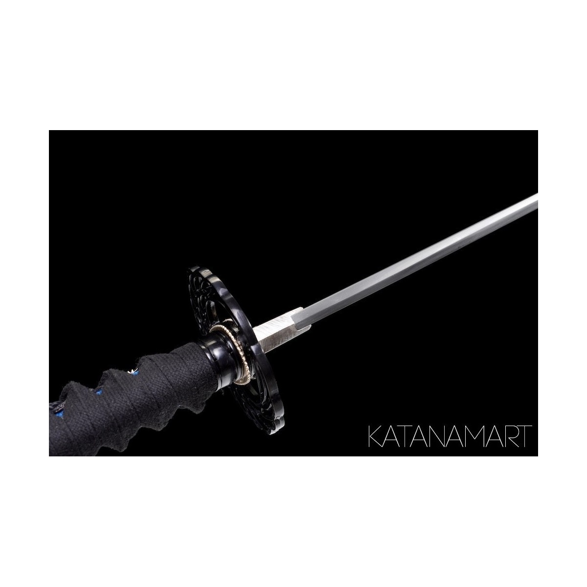 Die Klinge dieser Katana besteht aus 1045 High Carbon Steel (hoher Kohlenstoffgehalt), das sich durch gute Härte und Flexibilität auszeichnet. Sie ist voll tang (durchgehender Klingenkern) und somit stabil genug, um als funktionelles Trainingsschwert verwendet zu werden. Ein eingearbeiteter bohi (Hohlkehle) reduziert das Gewicht und sorgt für ein angenehmes Handling – ein entscheidender Vorteil für Einsteiger.