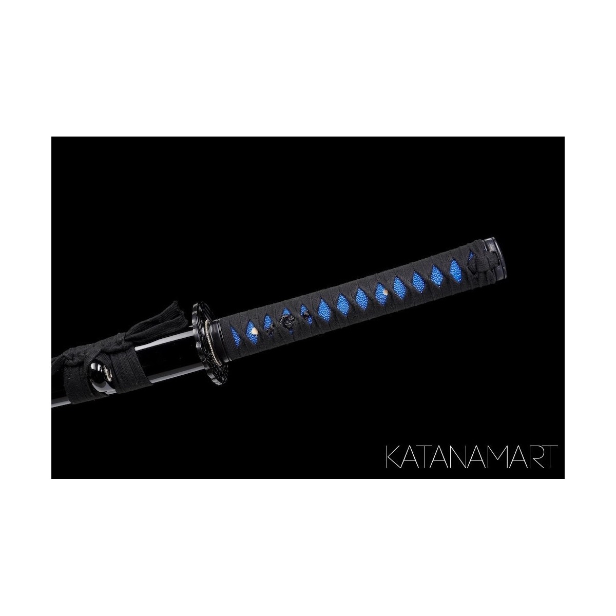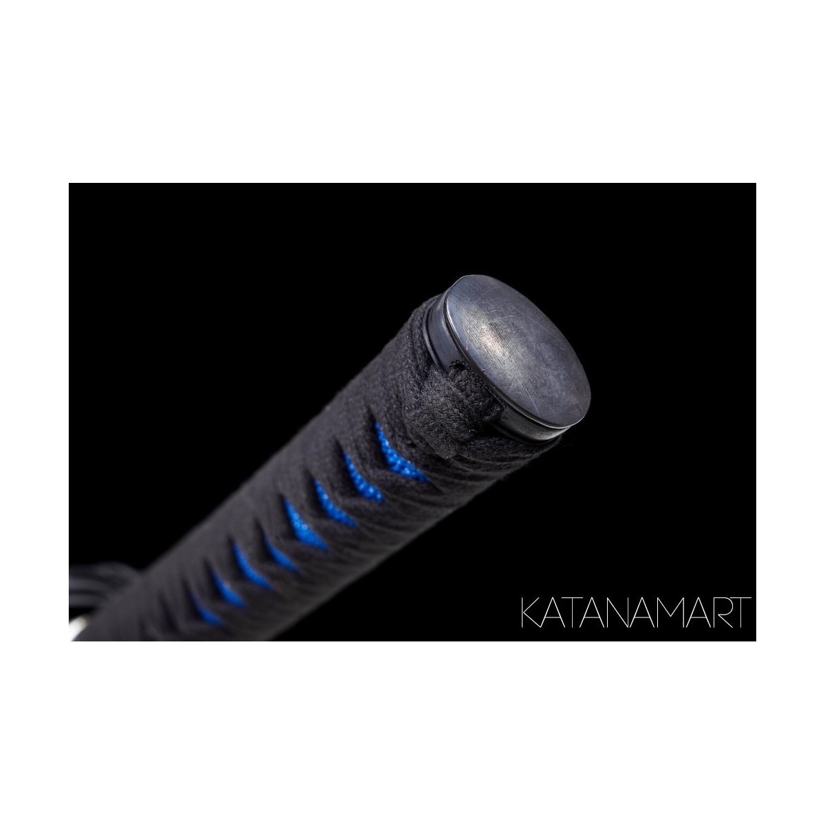 - Tsuka: traditionell mit schwarzer Baumwolle (ito) im hinerimaki-Stil umwickelt, darunter echte samegawa (Rochenhaut) in Blau.