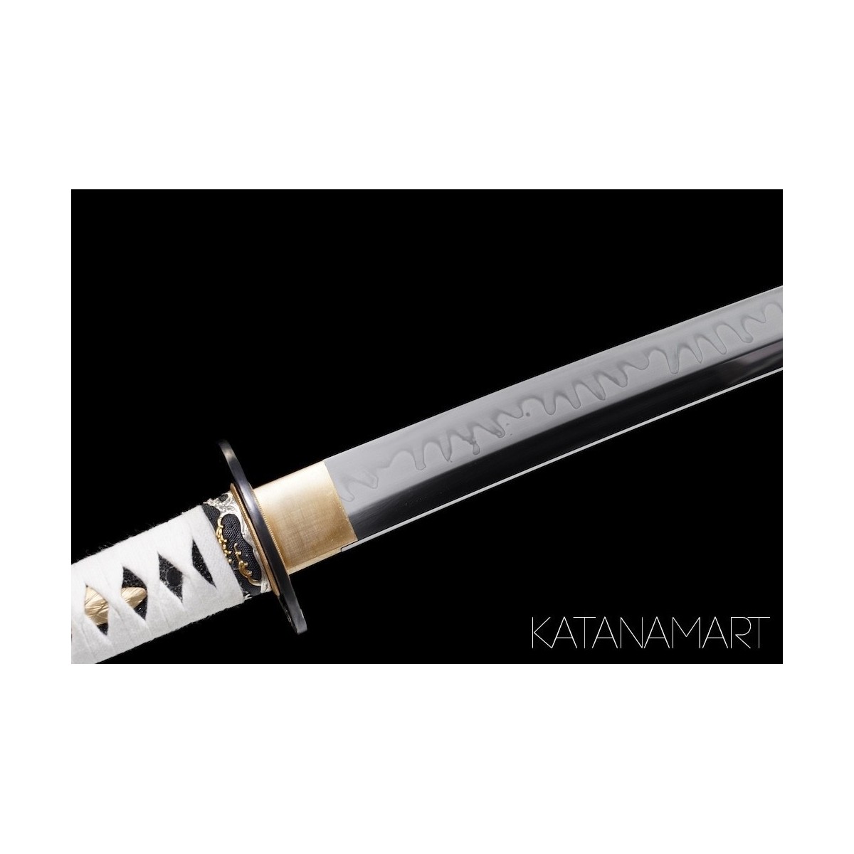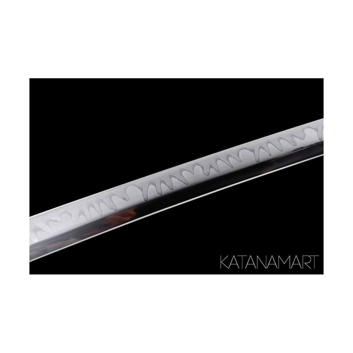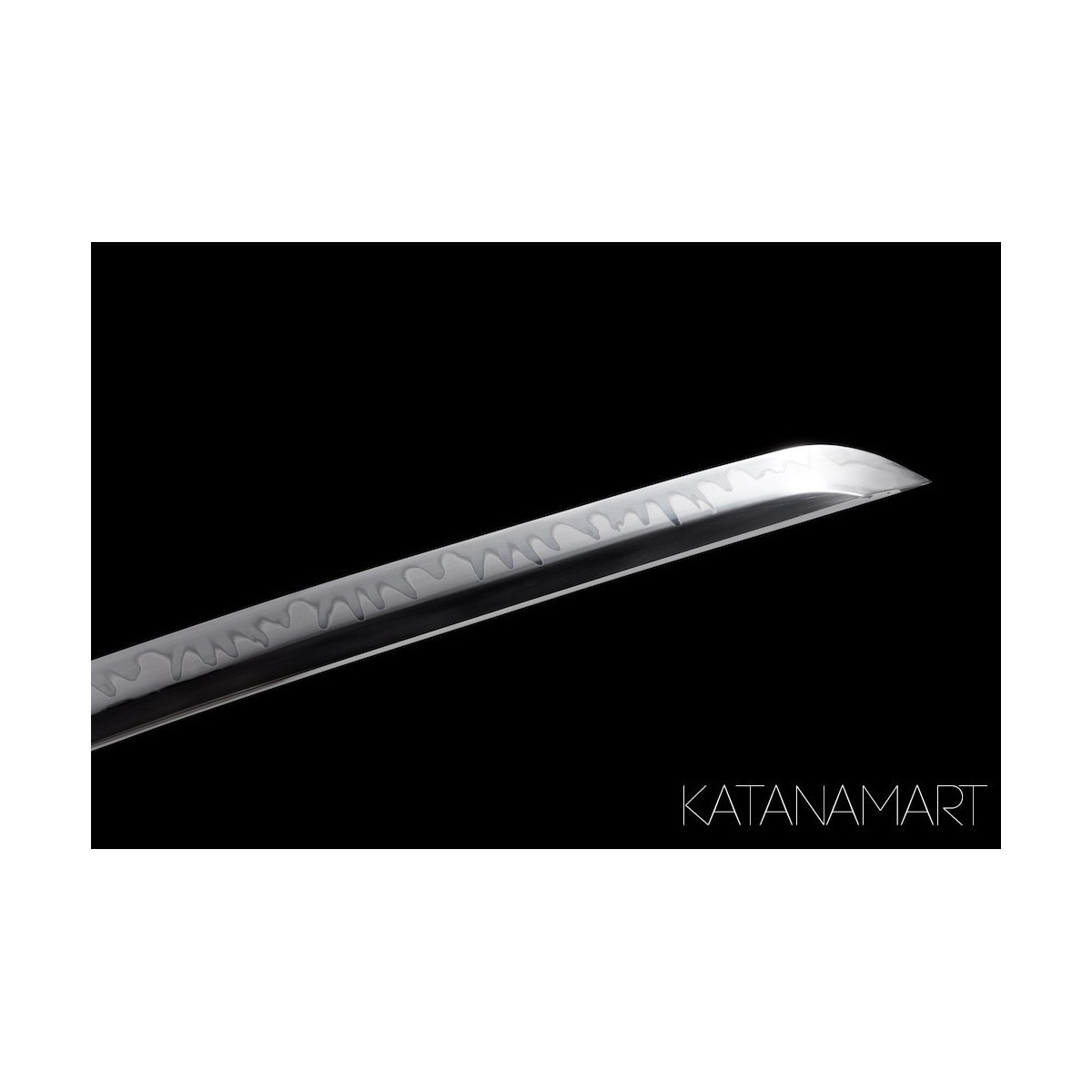 Gefertigt aus 1095 High Carbon Steel, wird die Klinge der Sakamoto Katana durch eine sorgfältige Lehmbeschichtung differenziert gehärtet. Das Ergebnis ist ein klar sichtbarer Togari-Gunome Hamon, der in scharfen Wellen verläuft und die ganze Kraft traditioneller japanischer Schmiedekunst widerspiegelt. Durch die Handpolitur wird dieser Hamon noch deutlicher hervorgehoben, wodurch die Klinge nicht nur funktional, sondern auch optisch ein Highlight ist.