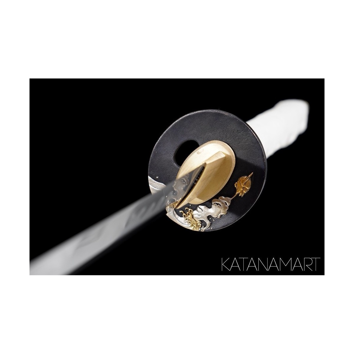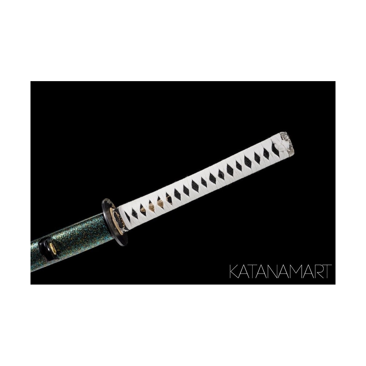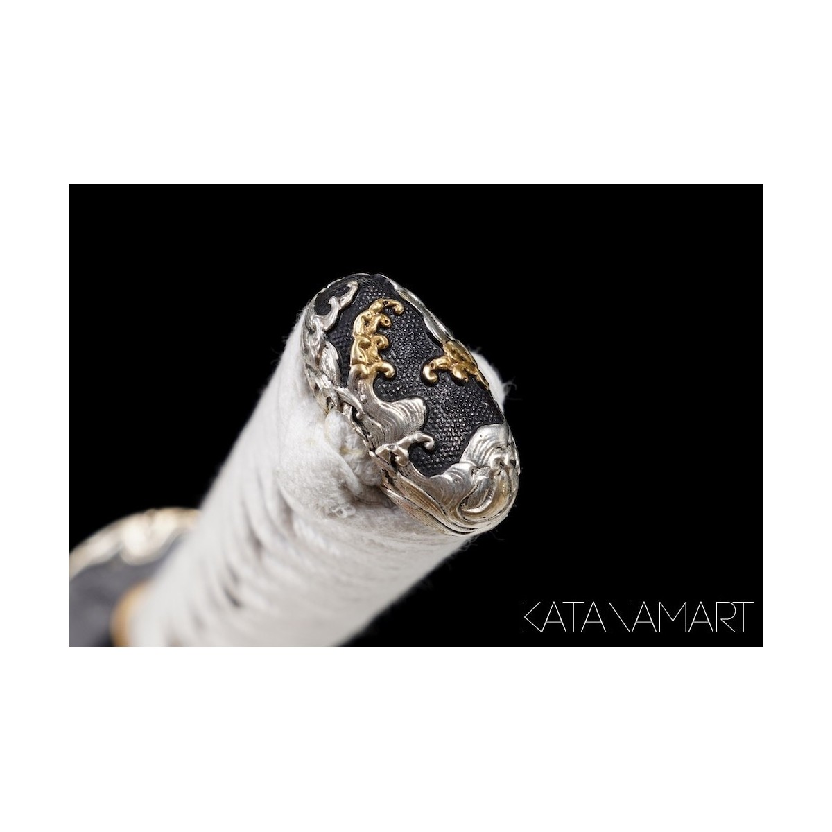 - Tsuka: weißes Baumwollband im Hinerimaki-Stil, mit echter Rochenhaut unterlegt.