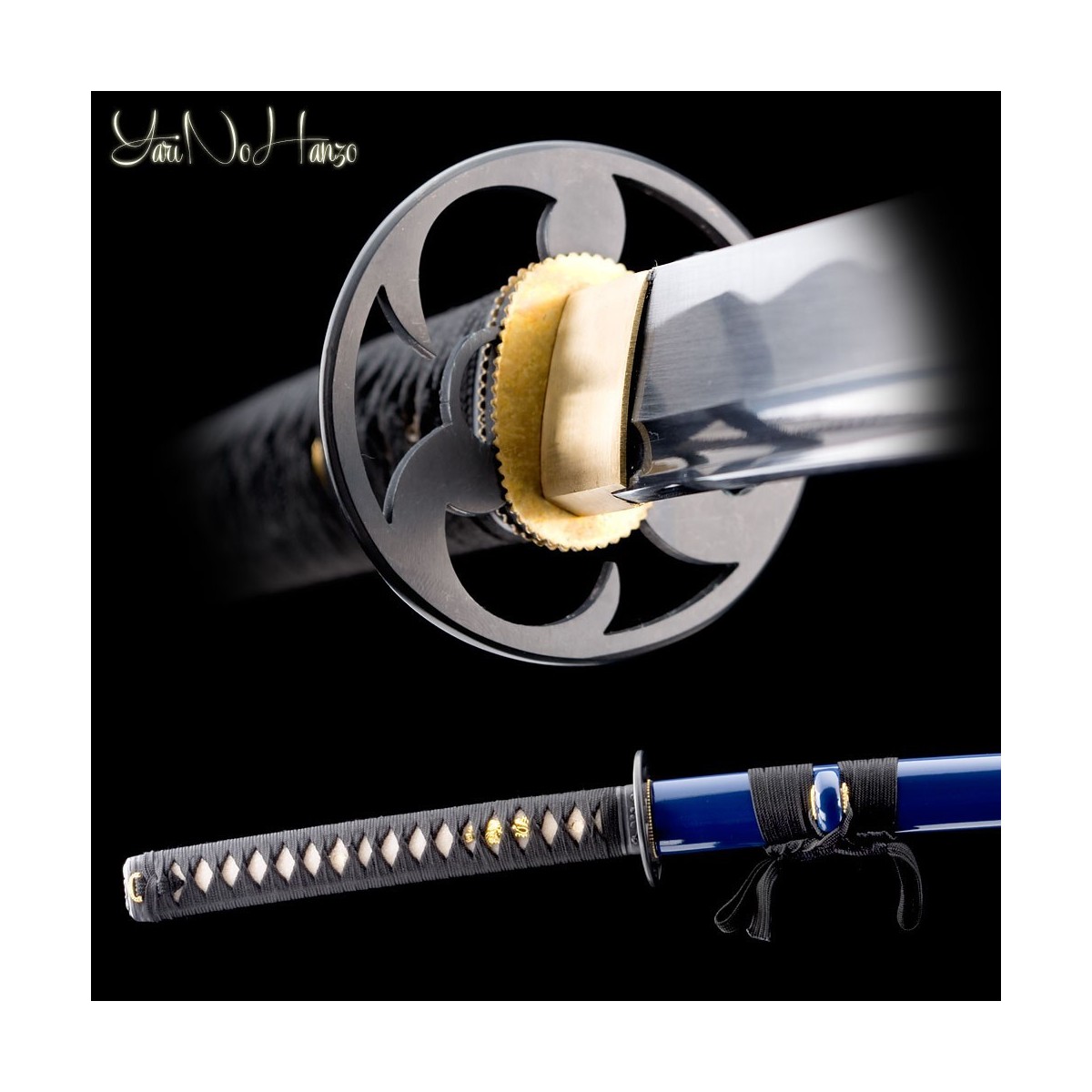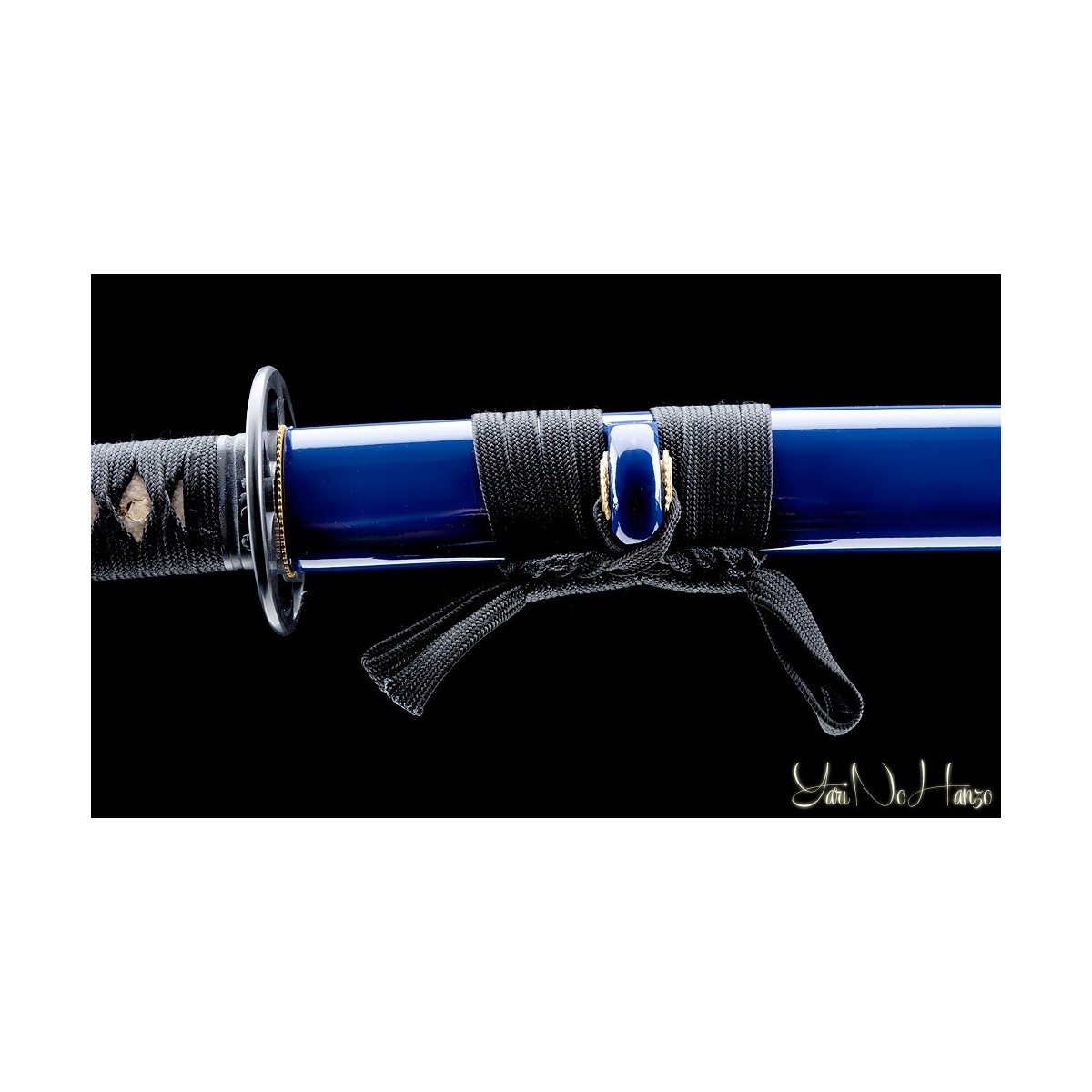 - Blaue hochglanzlackierte Saya (Scheide) aus Holz, schwarzes Tsuka-Ito (Griffwicklung) und Tsuba aus Eisen.