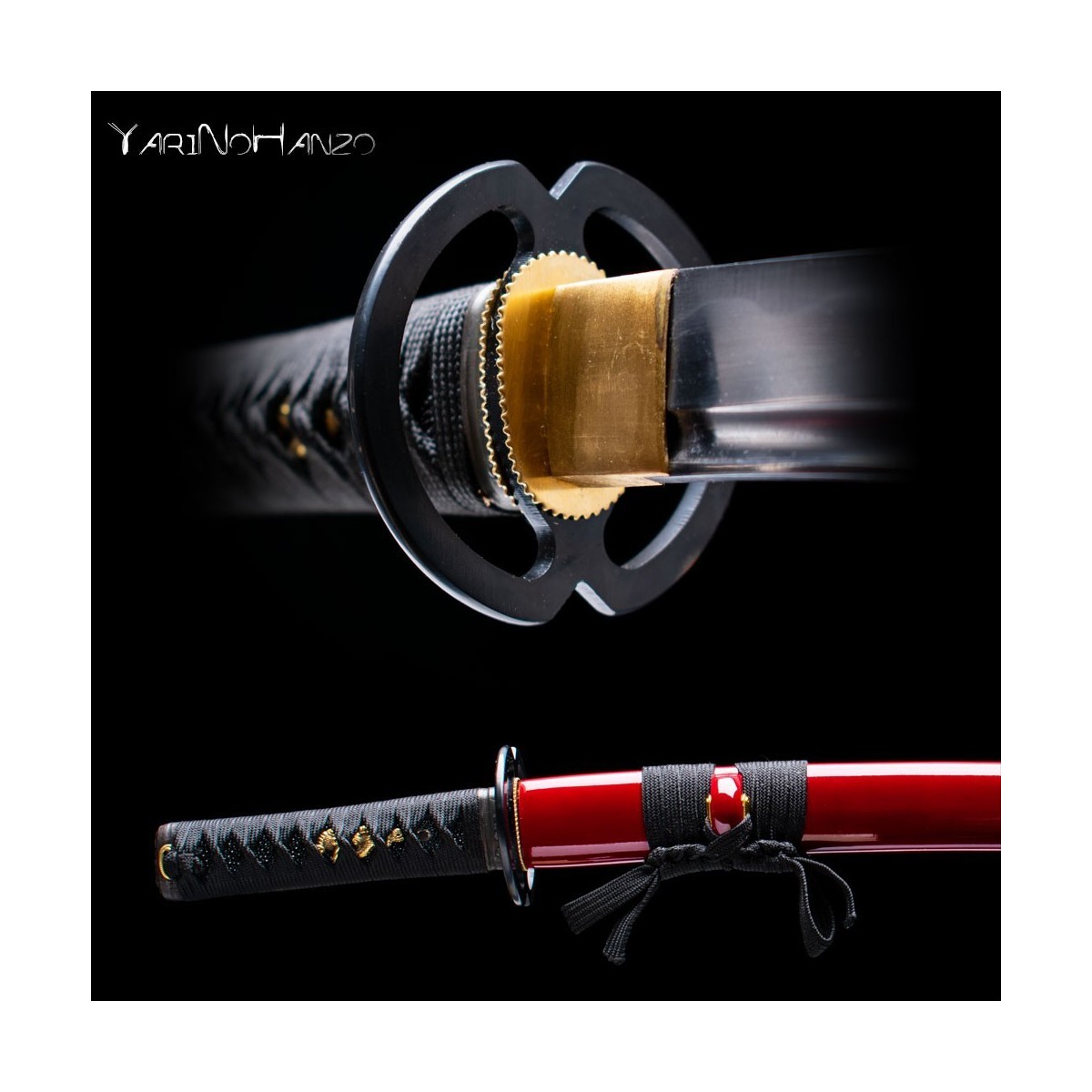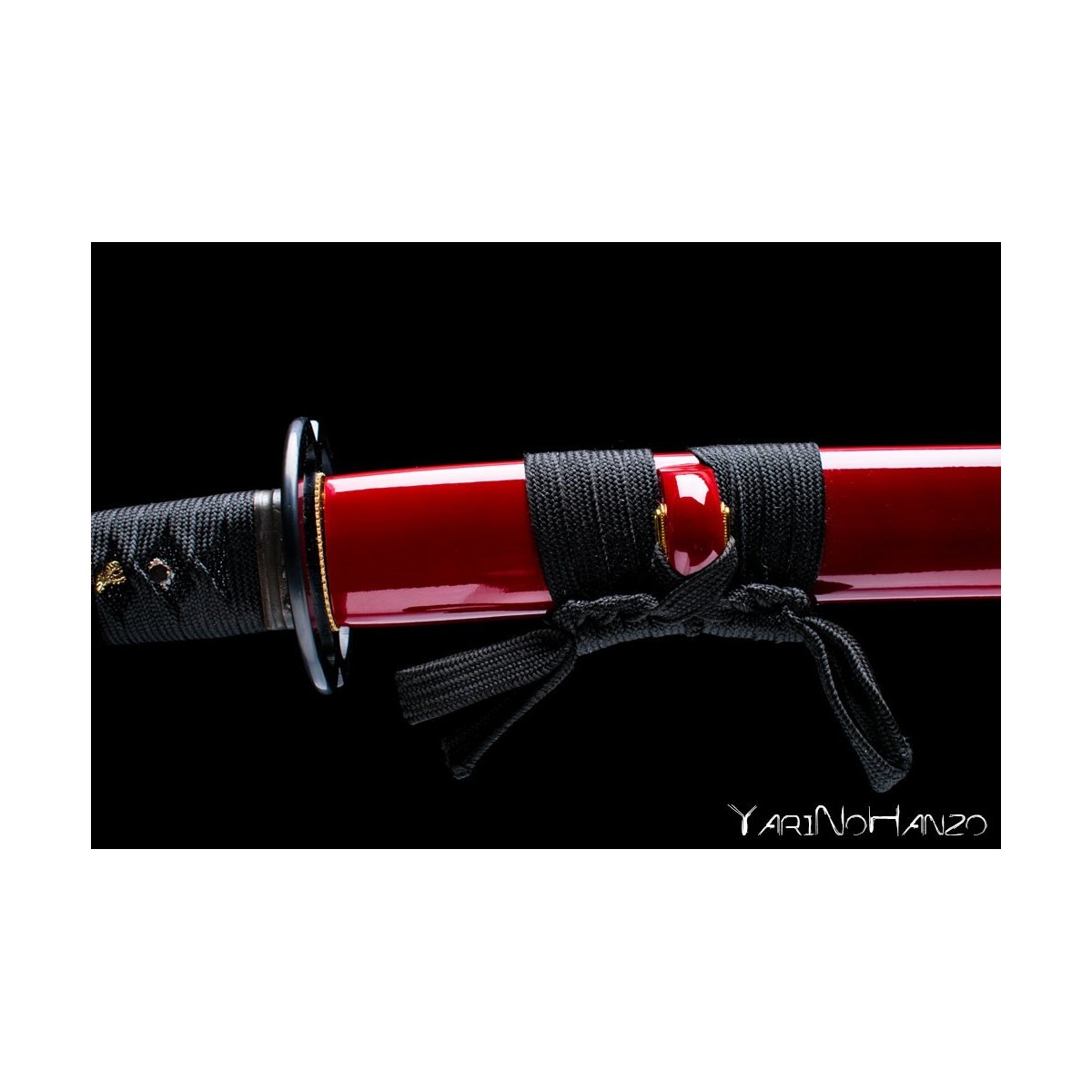- Dunkelrote hochglanzlackierte Saya (Scheide), schwarzes Tsuka-Ito (Griffwicklung) und Tsuba aus Eisen.