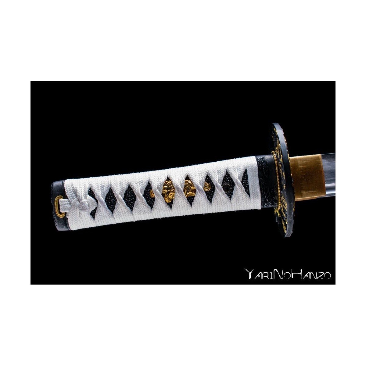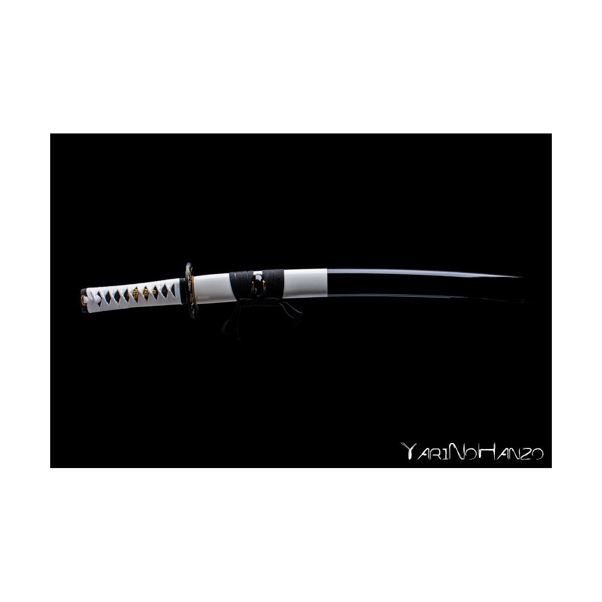 - Schwarz-weisse hochglanzlackierte Saya (Scheide) aus Holz, weisses Tsuka-Ito (Griffwicklung) mit schwarzer Rochenhaut (Same).