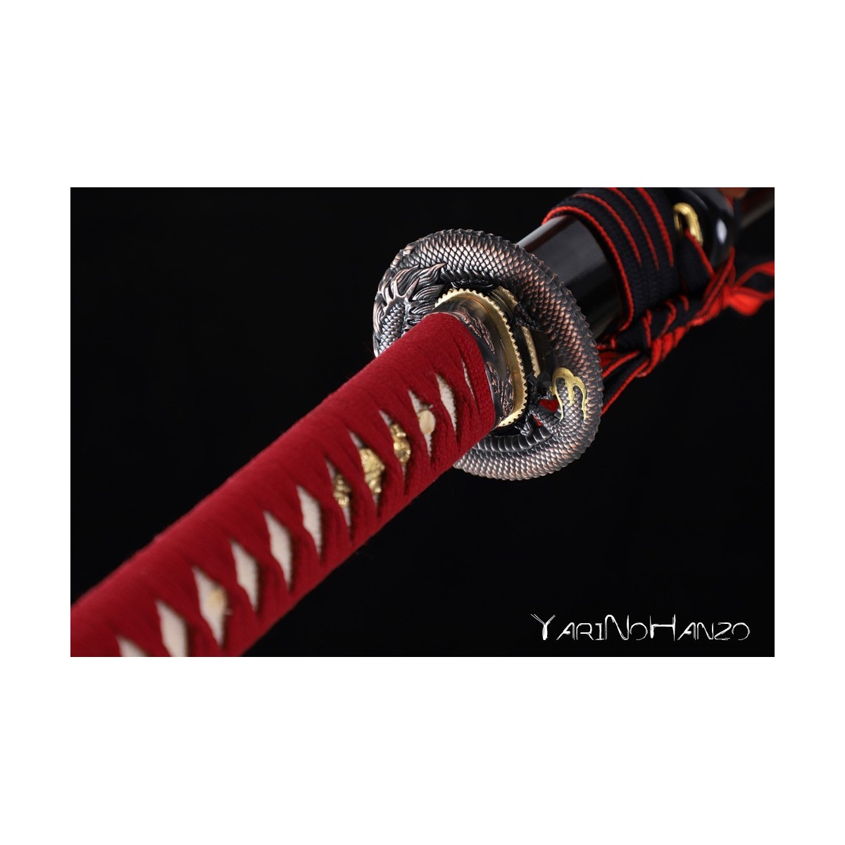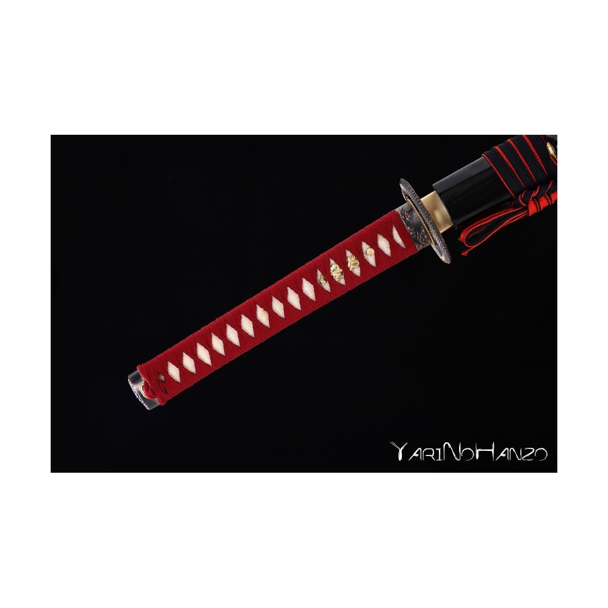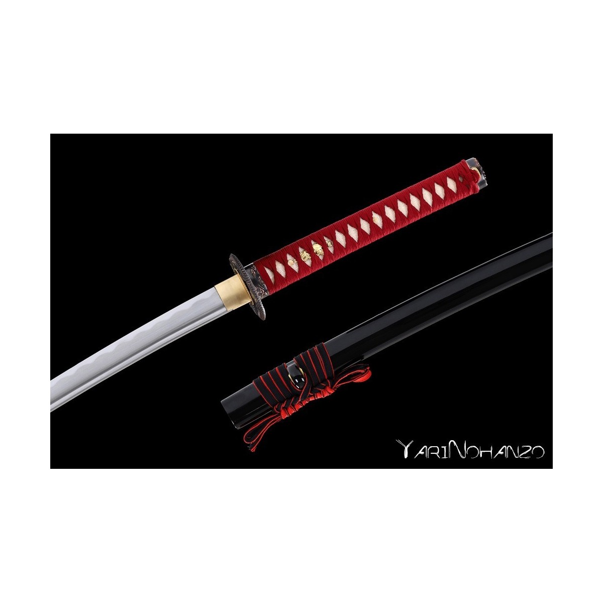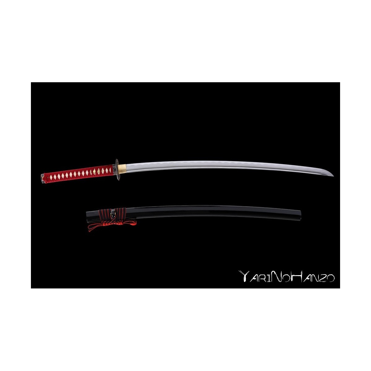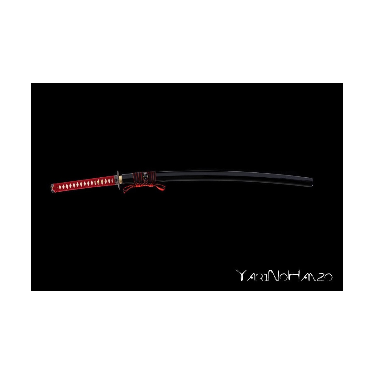 - Schwarze hochglanzlackierte Saya (Scheide) aus Holz, rotes Tsuka-Ito (Griffwicklung).
