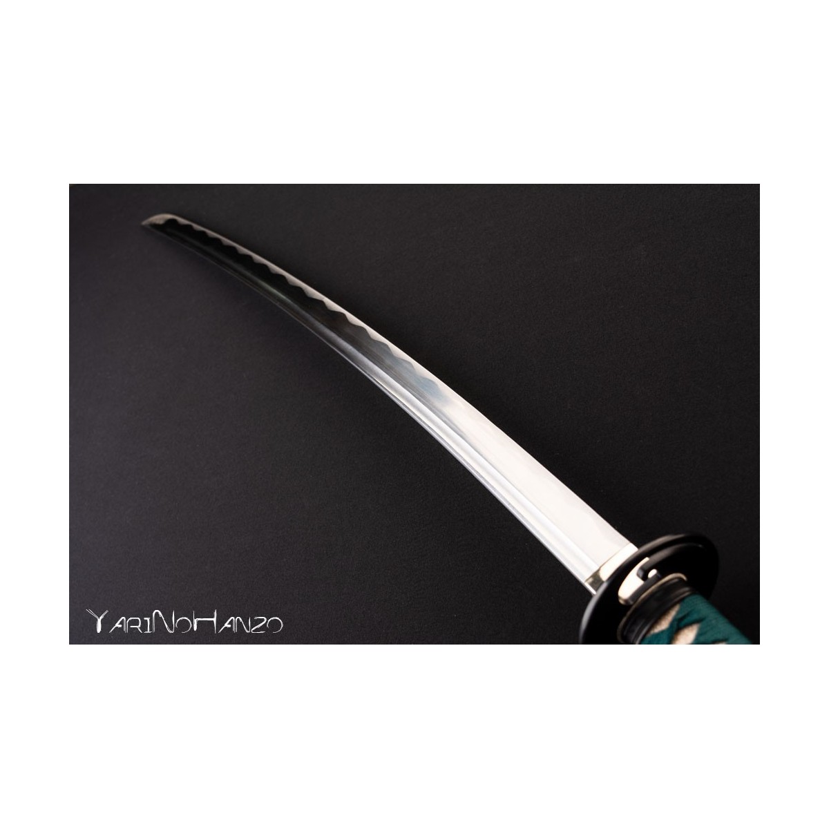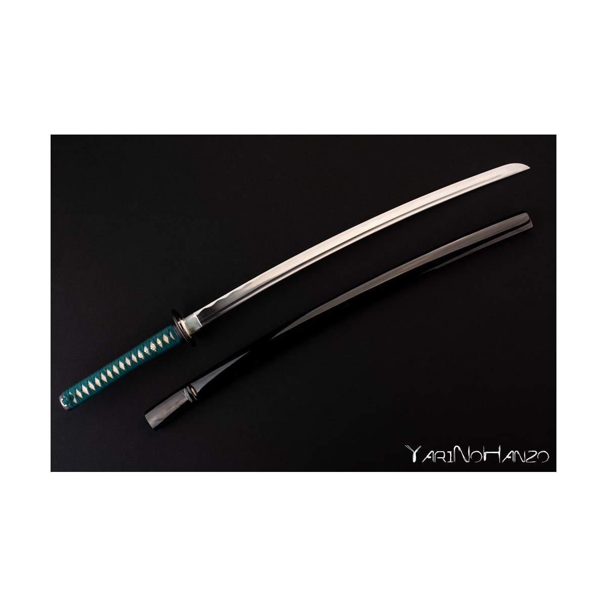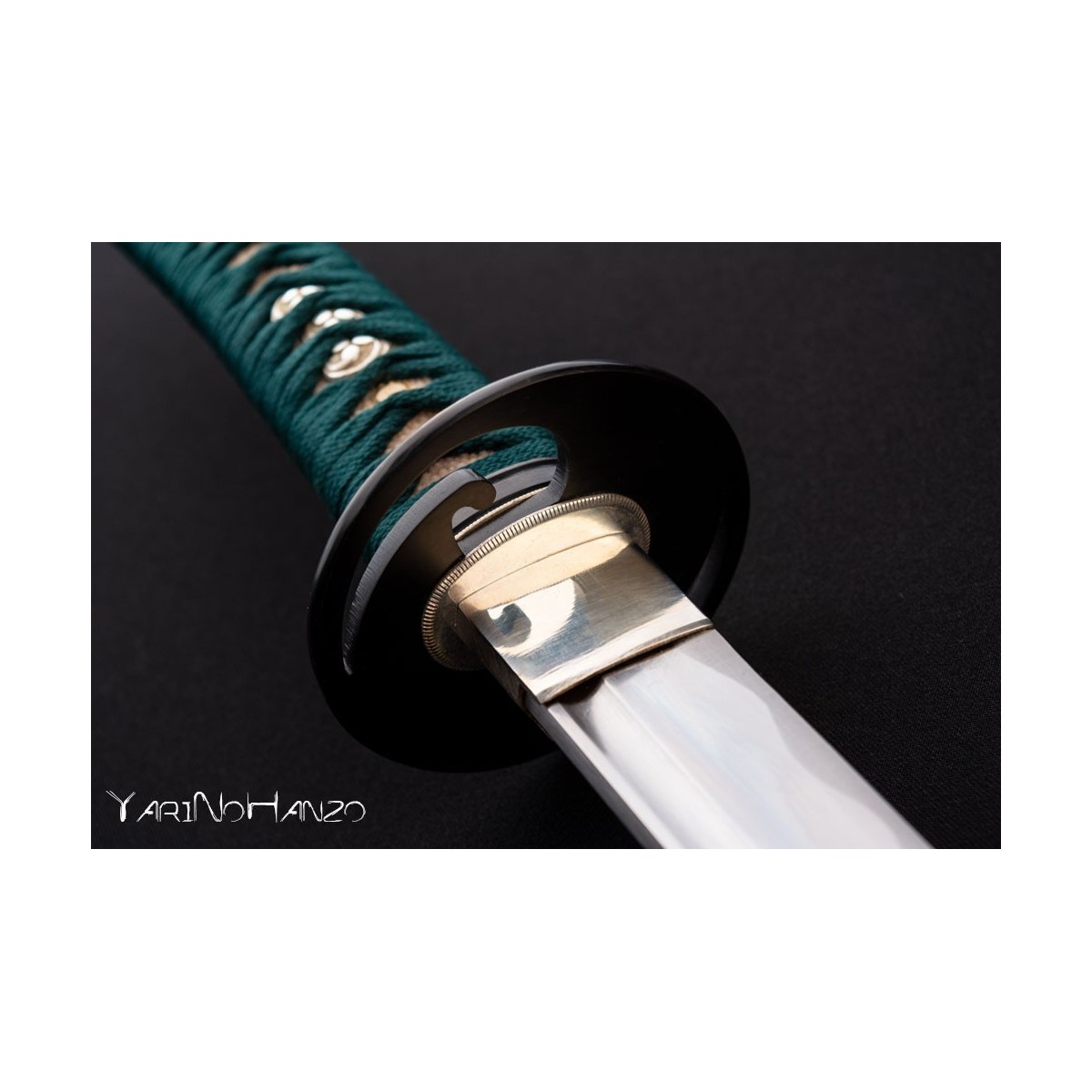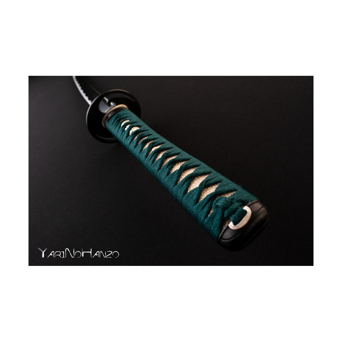 - Schwarze hochglanzlackierte Saya (Scheide) aus Holz, dunkelgrünes Tsuka-Ito (Griffwicklung) und Tsuba aus Eisen.