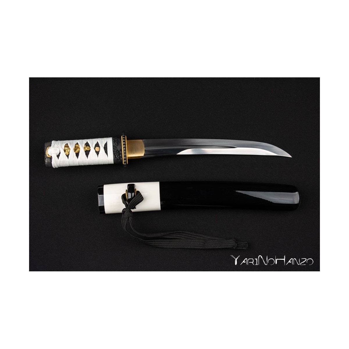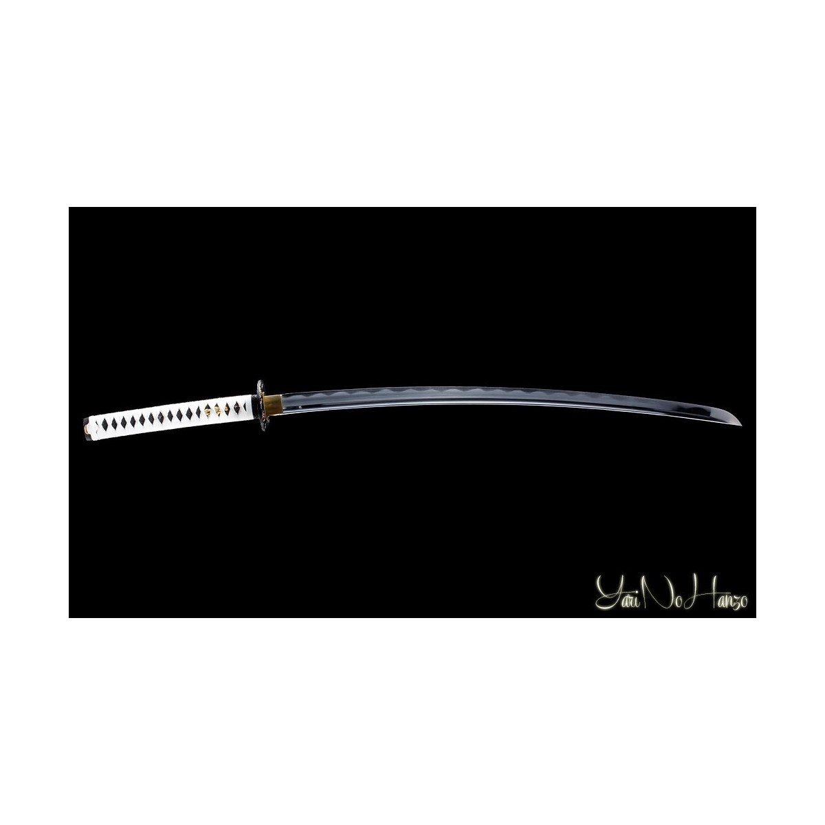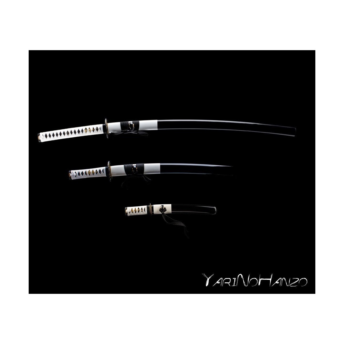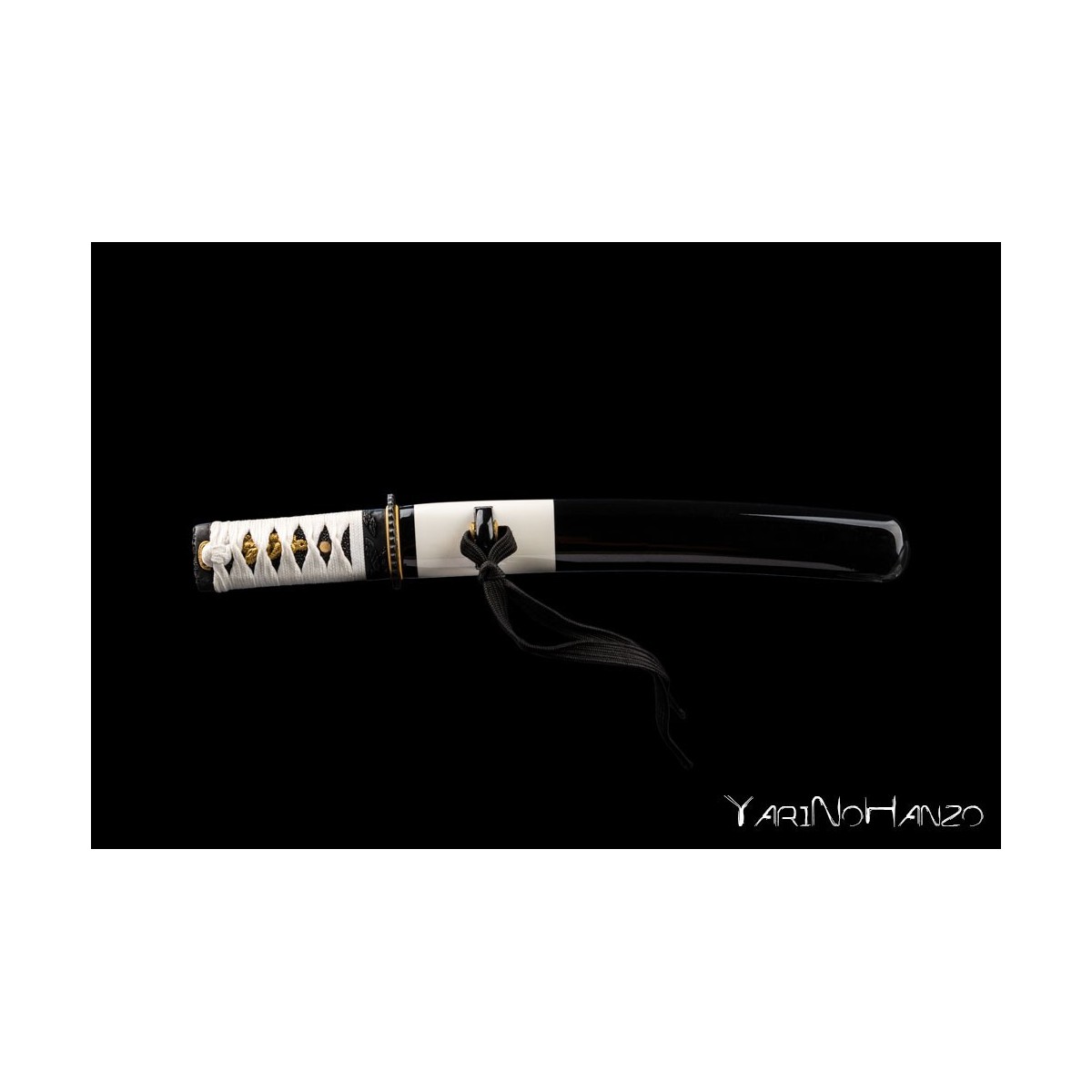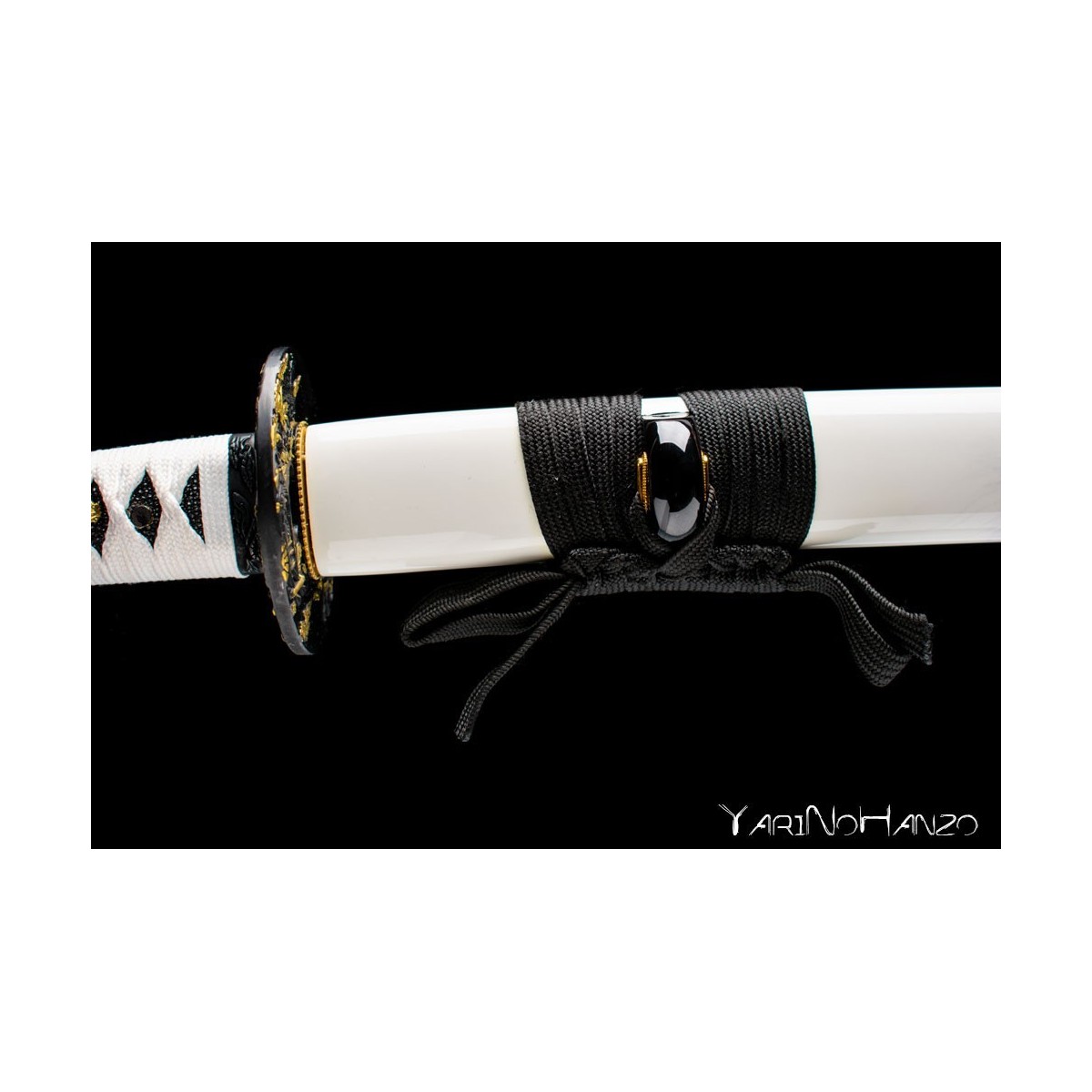 - Schwarz-weisse hochglanzlackierte Saya (Scheide) aus Holz, weisses Tsuka-Ito (Griffwicklung) mit schwarzer Rochenhaut (Same).