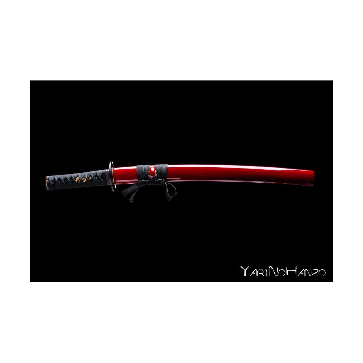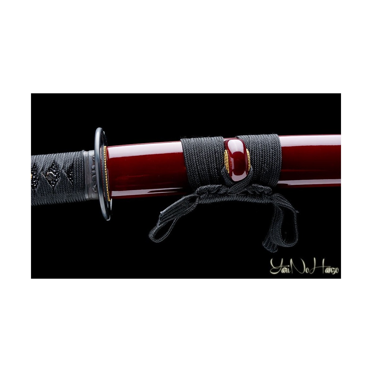 - Dunkelrote hochglanzlackierte Saya (Scheide), schwarzes Tsuka-Ito (Griffwicklung) und Tsuba aus Eisen.