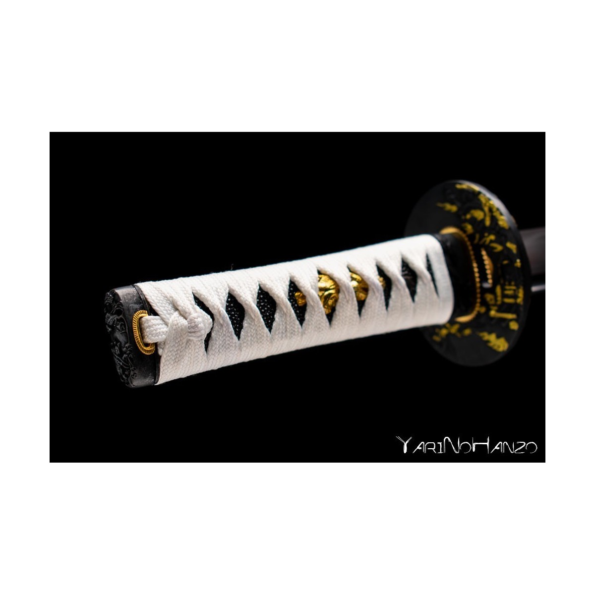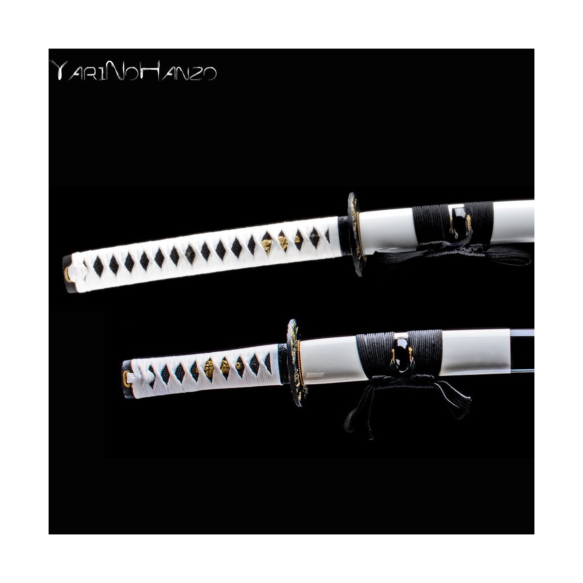 - Schwarz-weisse hochglanzlackierte Saya (Scheide) aus Holz, weisses Tsuka-Ito (Griffwicklung) mit schwarzer Rochenhaut (Same).