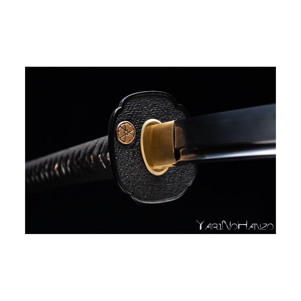 - Schwarzes Tsuka-Ito (Griffwicklung) aus Seide und traditionelle Mokko-Tsuba (Schwertstichblatt).