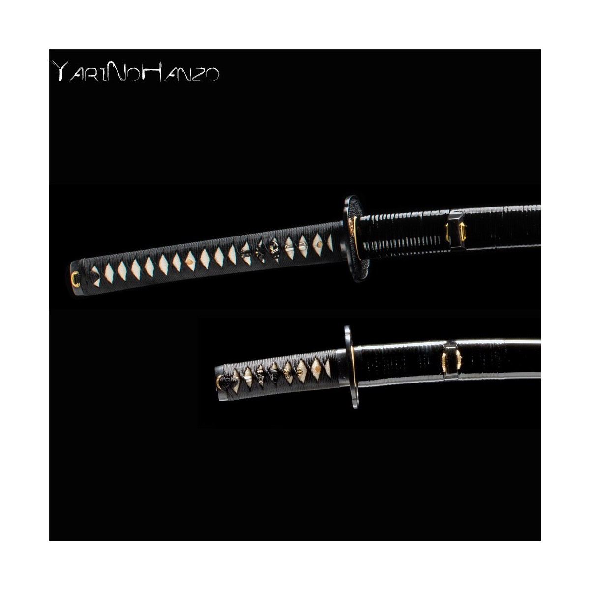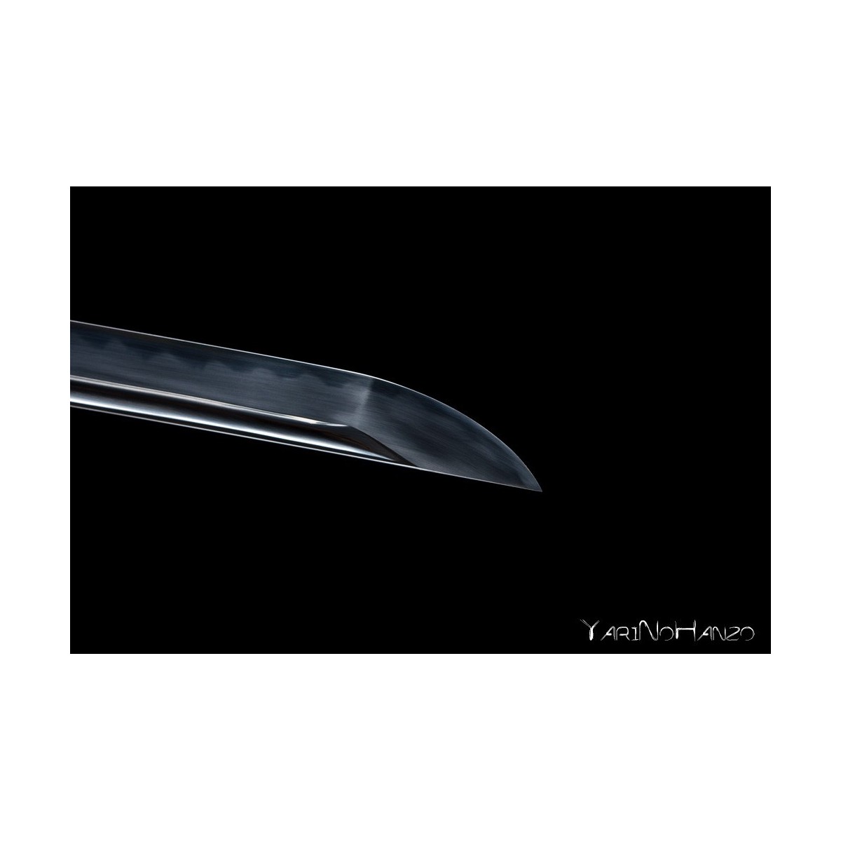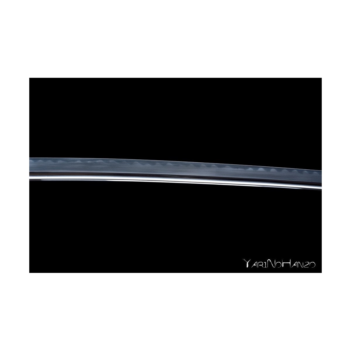 - Scharfe Maru-Kitae-Klinge mit Bo-Hi (Kanal) handgeschmiedet aus 1095 hoch kohlenstoffhaltigem Stahl, selektiven Härtung Ton und echte Gunome-Choji-Hamon (Begriffsklärung (Ha = Schneide, Mon = Muster)).