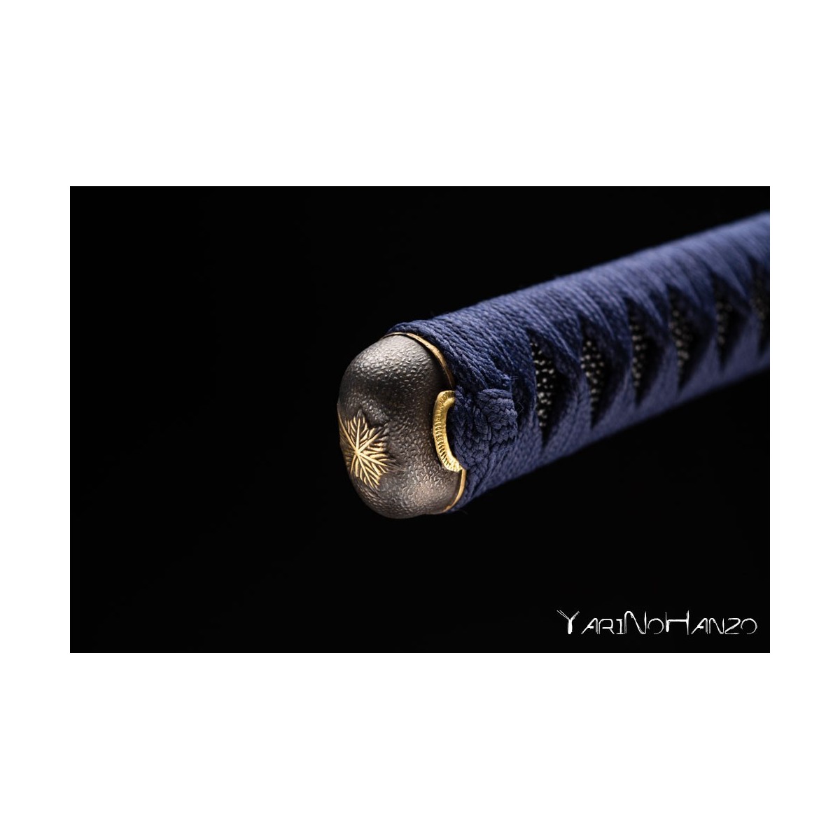 - Blaues Tsuka-Ito (Griffwicklung) , echte schwarze Rochenhaut (Same) und dekorative Tsuba (Schwertstichblatt).