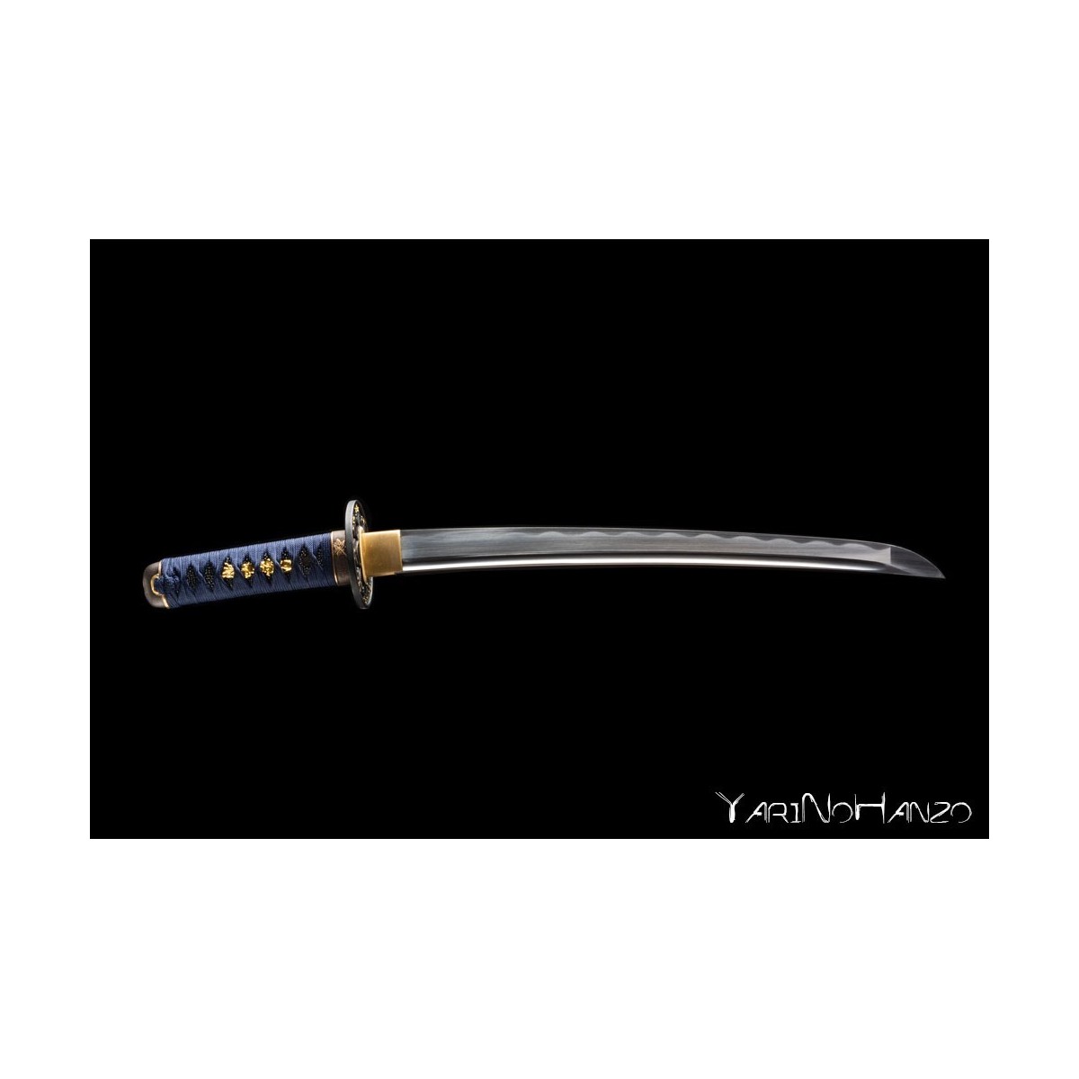 - Blaues Tsuka-Ito (Griffwicklung), echte schwarze Rochenhaut (Same) und dekorative Tsuba (Schwertstichblatt).