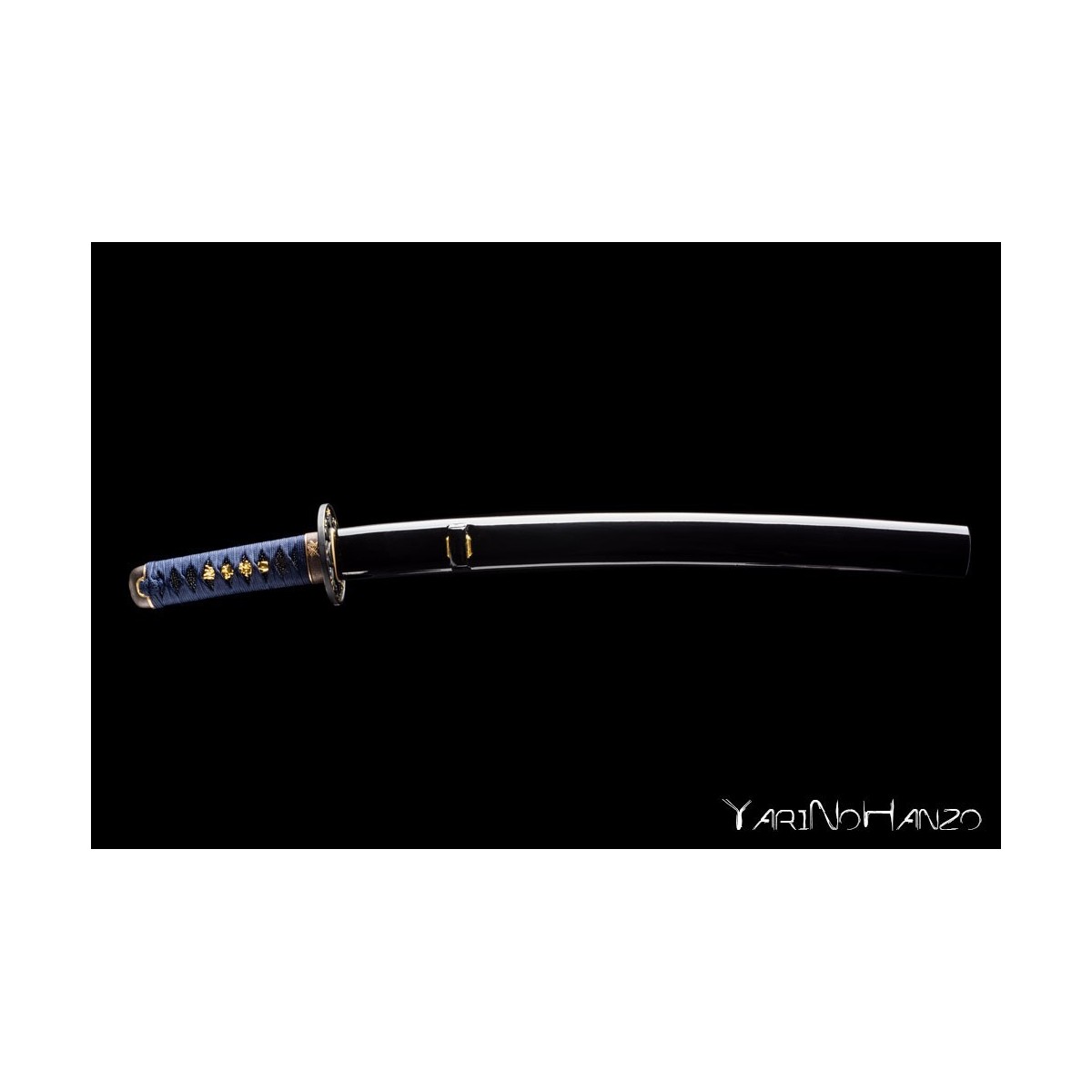 - Schwarze hochglanzlackierte Saya (Scheide) aus Holz und echtes blaues Kakucho-Sageo.