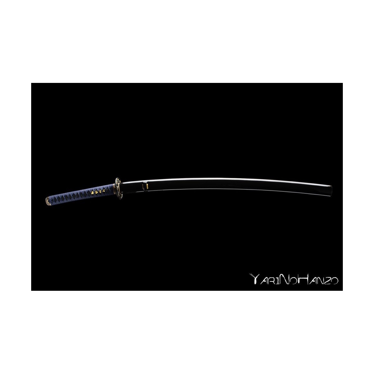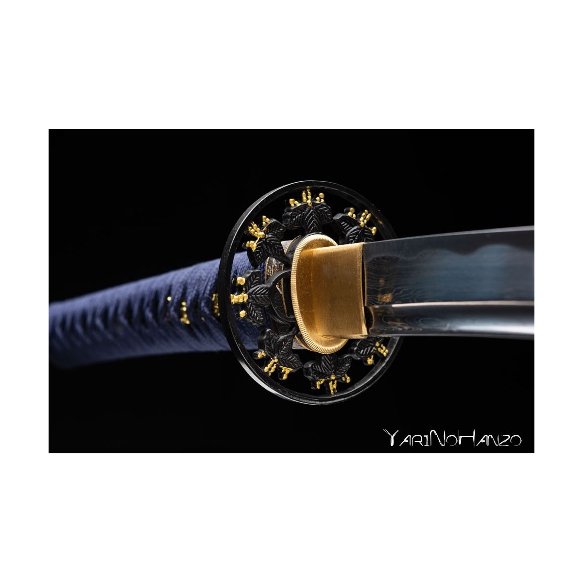 - Blaues Tsuka-Ito (Griffwicklung), echte schwarze Rochenhaut (Same) und dekorative Tsuba (Schwertstichblatt).