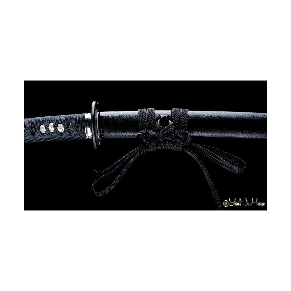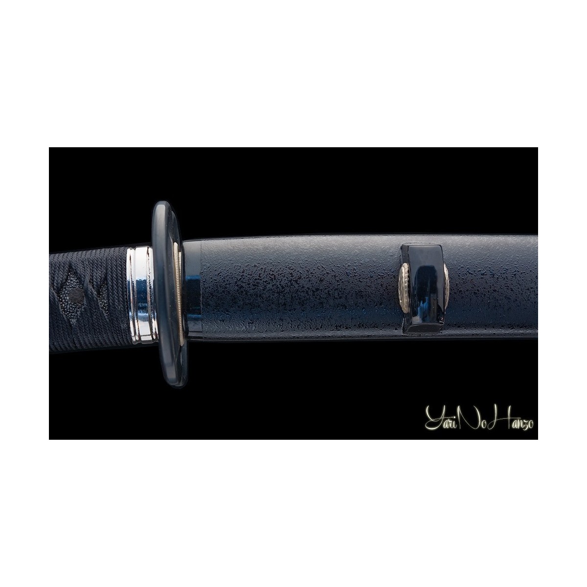 - Schwarzes Tsuka-Ito (Griffwicklung) aus Seide, echte schwarze Rochenhaut, traditionelle Musashi-Tsuba (Schwertstichblatt) und Koshirae Higo versilbert.