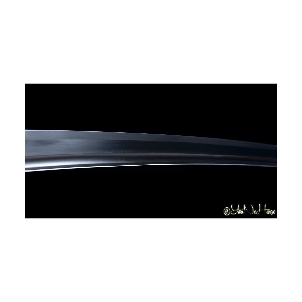 - Maru-Kitae-Klinge mit Bo-Hi (Kanal) handgeschmiedet aus 1060 Kohlenstoffstahl-lehmbeschichtete Differentialhärtung 60/45 HRC, und echte Suguha-Hamon (Begriffsklärung (Ha = Schneide, Mon = Muster)).
