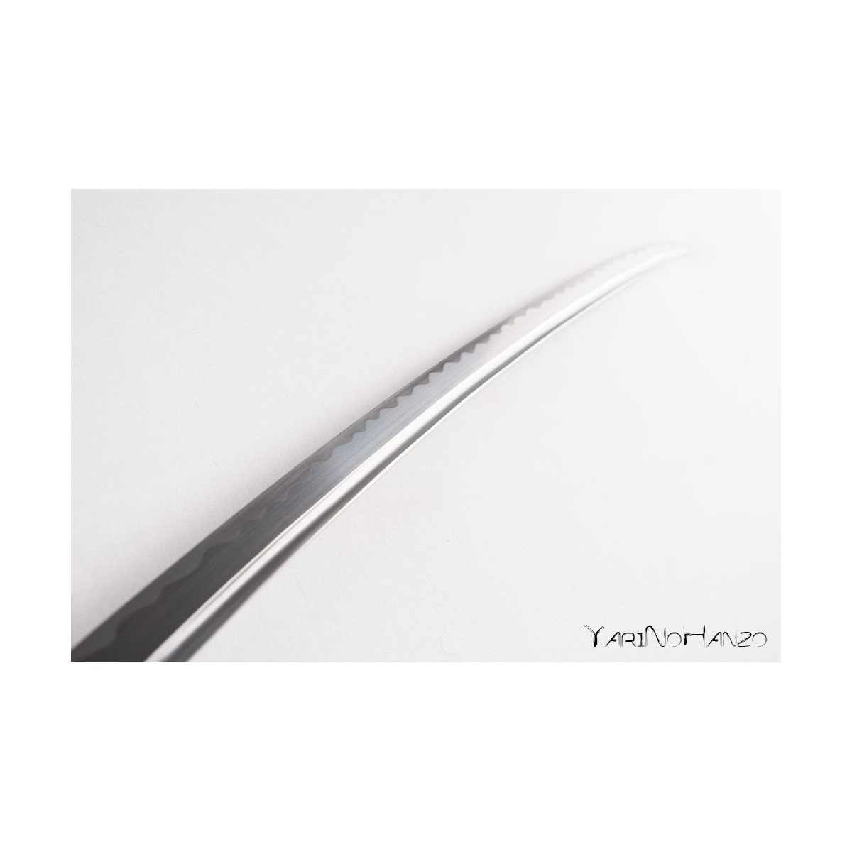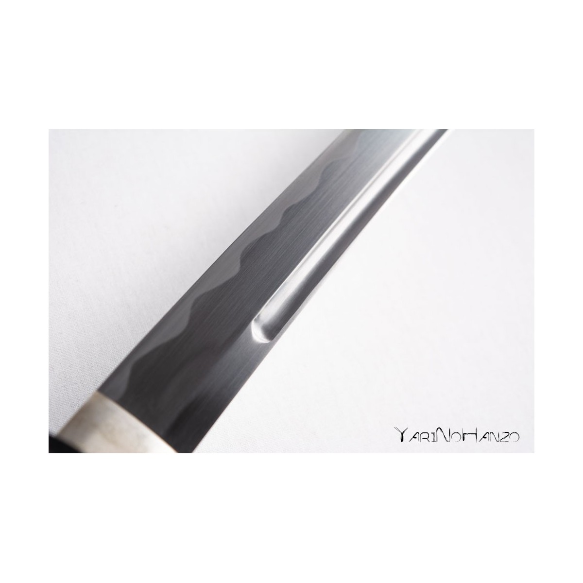 - Stumpfe Maru-Kitae-Klinge mit Bo-Hi (Kanal) handgeschmiedet aus 1060 hoch kohlenstoffhaltigem Stahl und Notare-Hamon (Begriffsklärung (Ha = Schneide, Mon = Muster)) durch Ätzen erhalten.