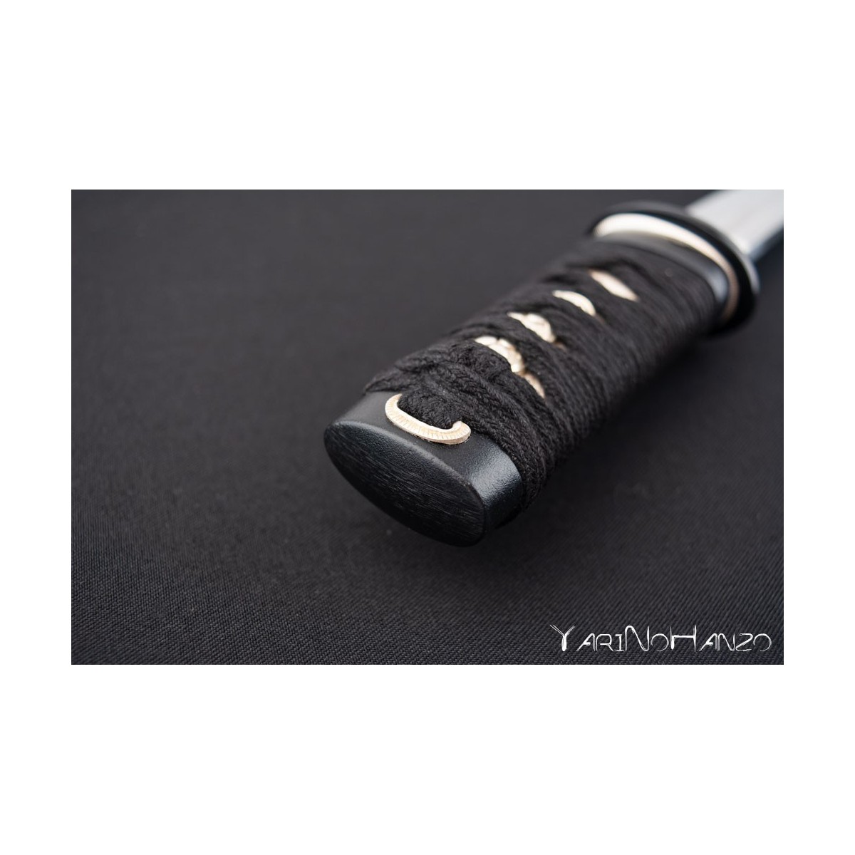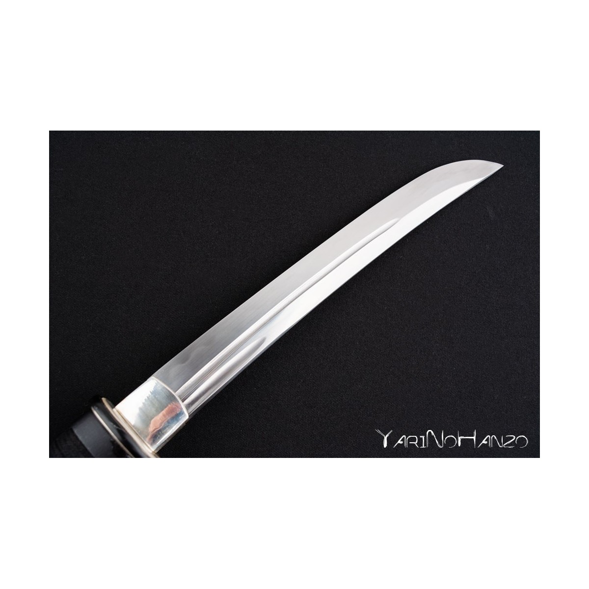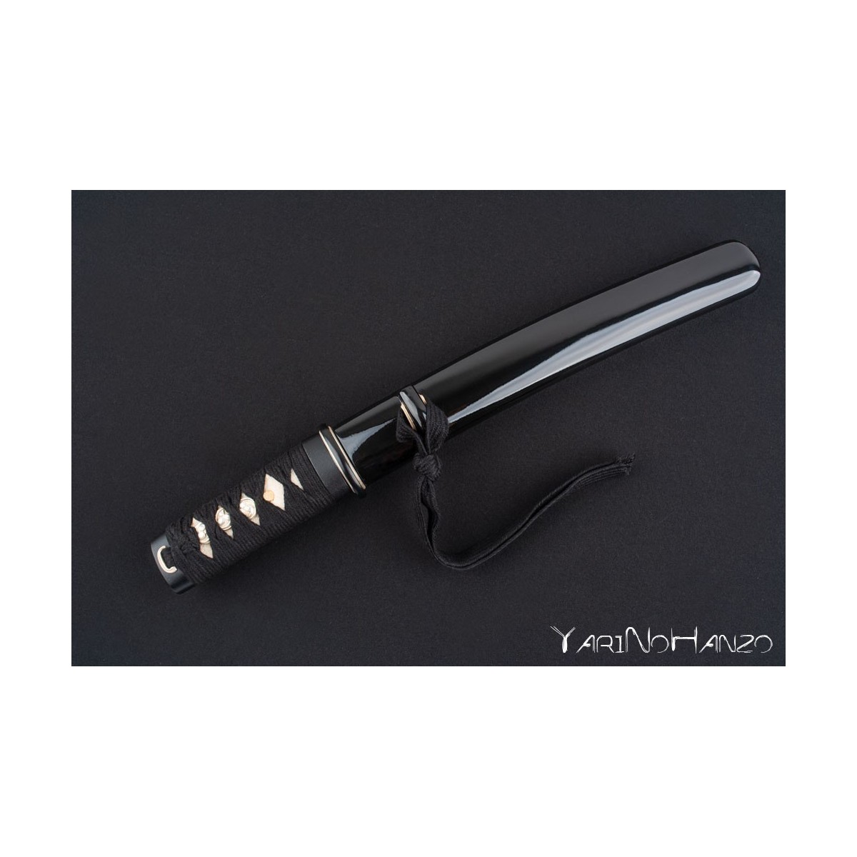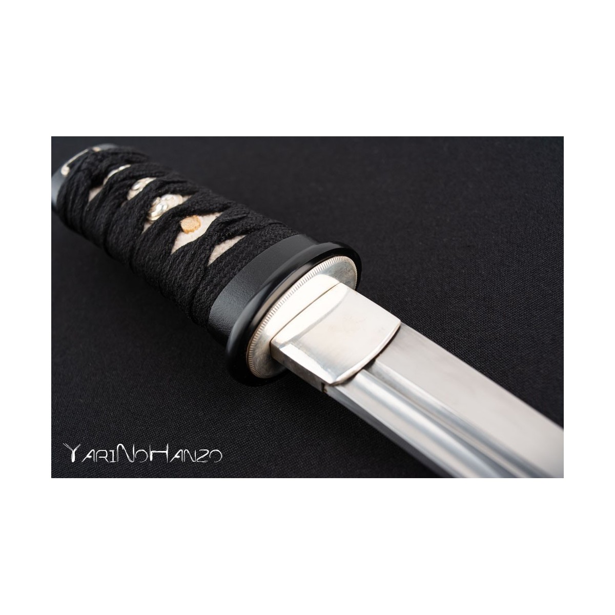 • Saya aus schwarz lackiertem Holz, Tsuka Ito aus schwarzer Baumwolle (abwechselnd Tsukamaki), weißem Samegawa (Rochenhaut) und eiserner Tsuba