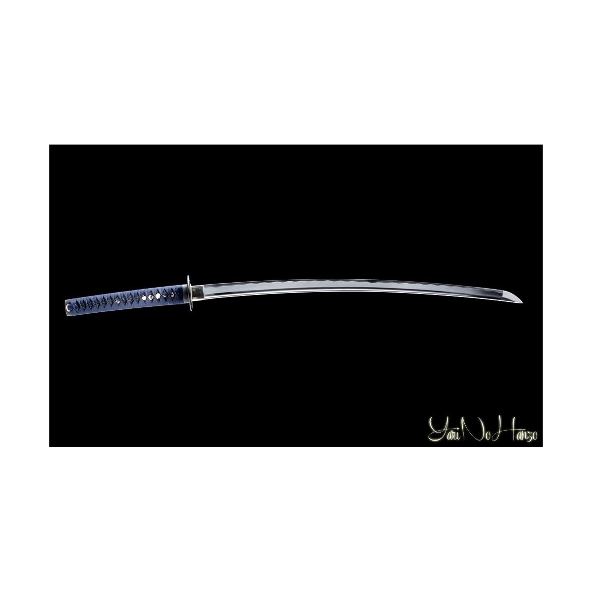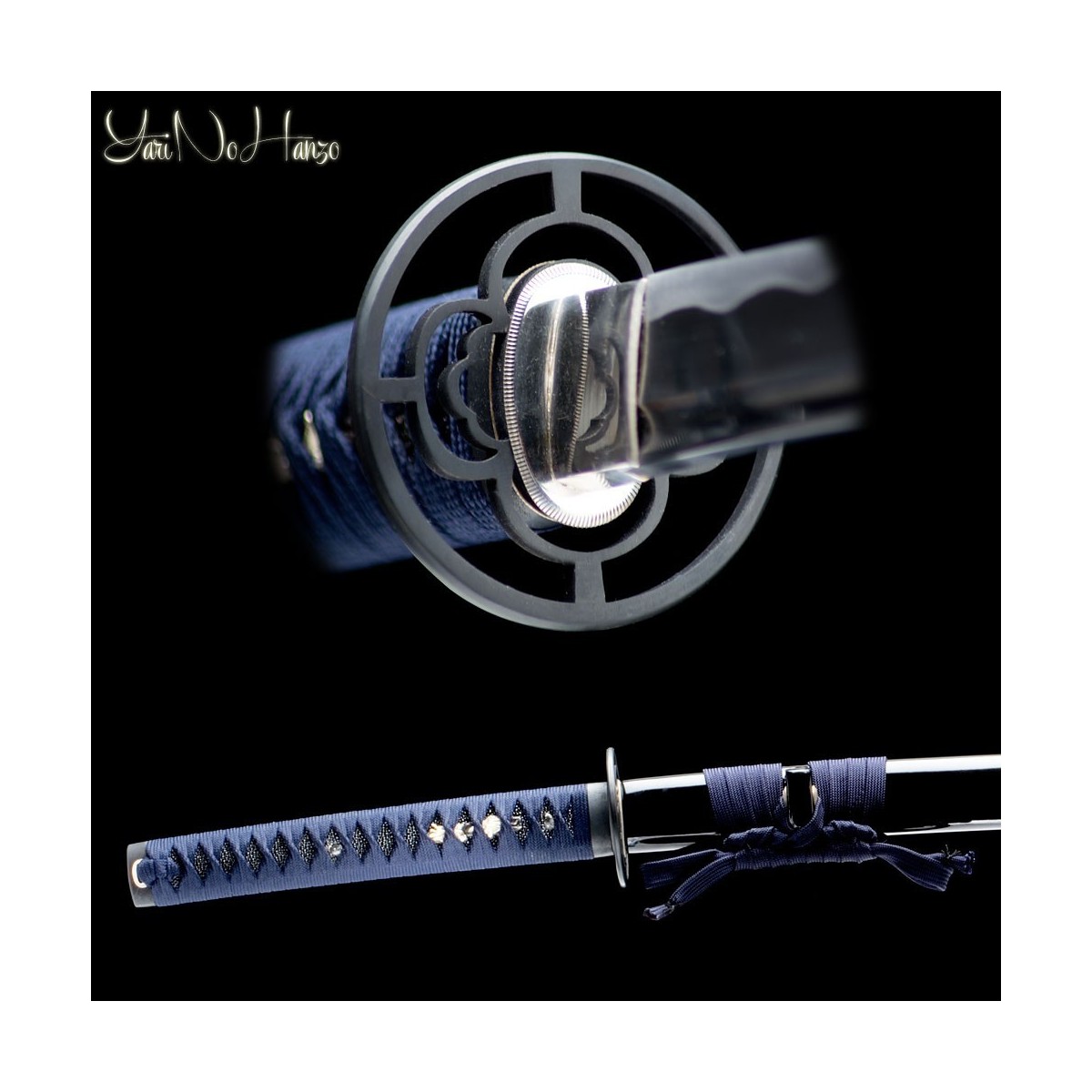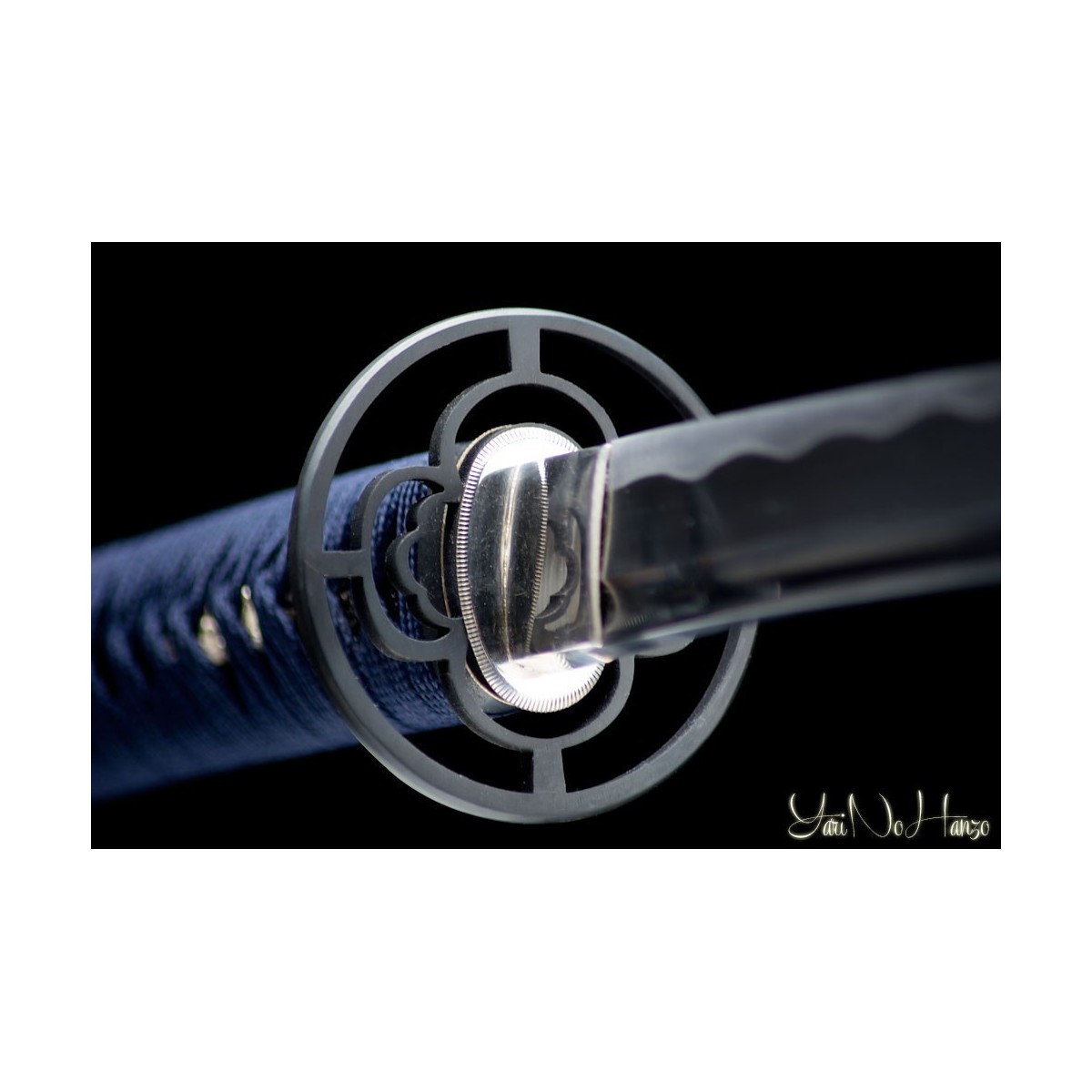 - Dunkelblaues Tsuka-Ito (Griffwicklung), schwarze echte Rochenhaut (Same) und Tsuba (Schwertstichblatt ) aus Eisen.
