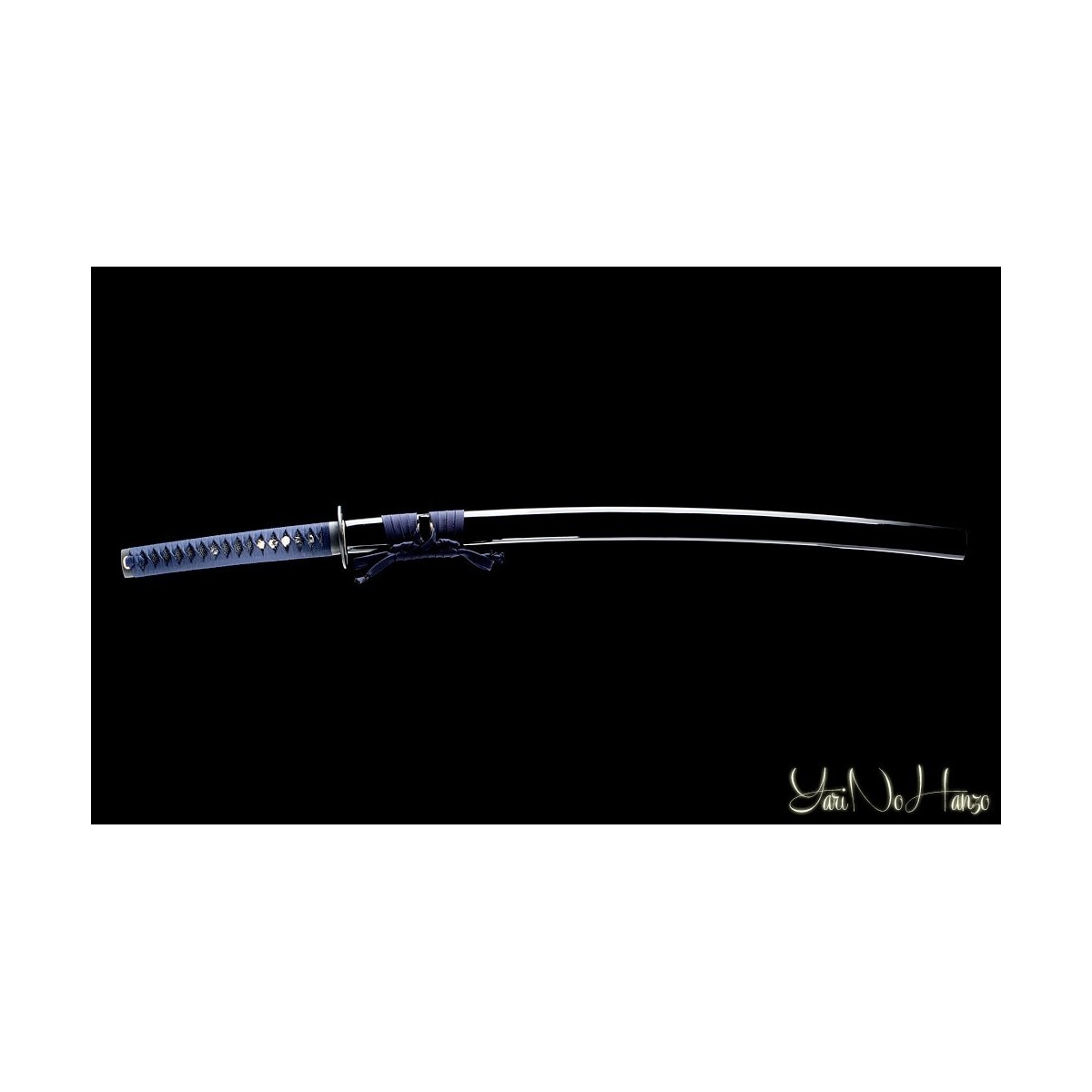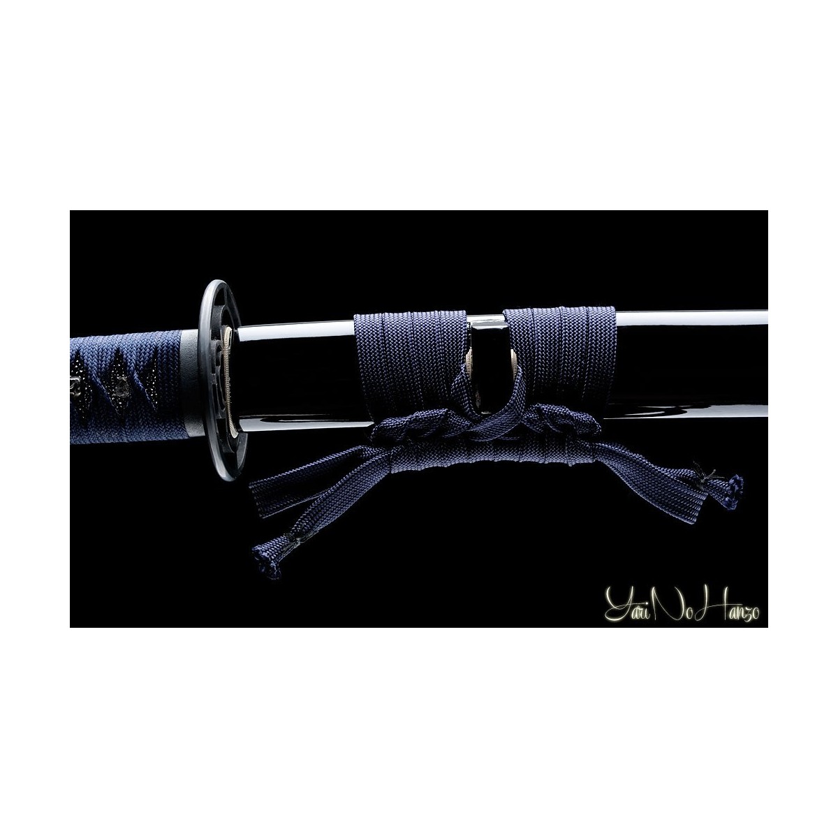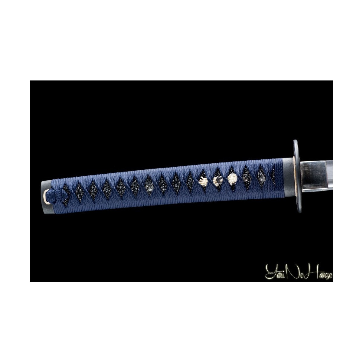 - Dunkelblaues Tsuka-Ito (Griffwicklung), schwarze echte Rochenhaut (Same) und Tsuba (Schwertstichblatt ) aus Eisen.