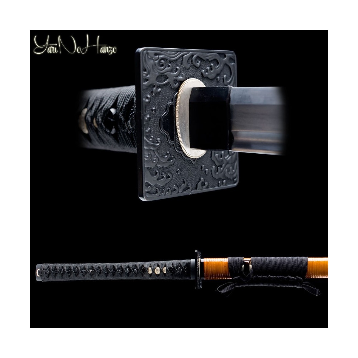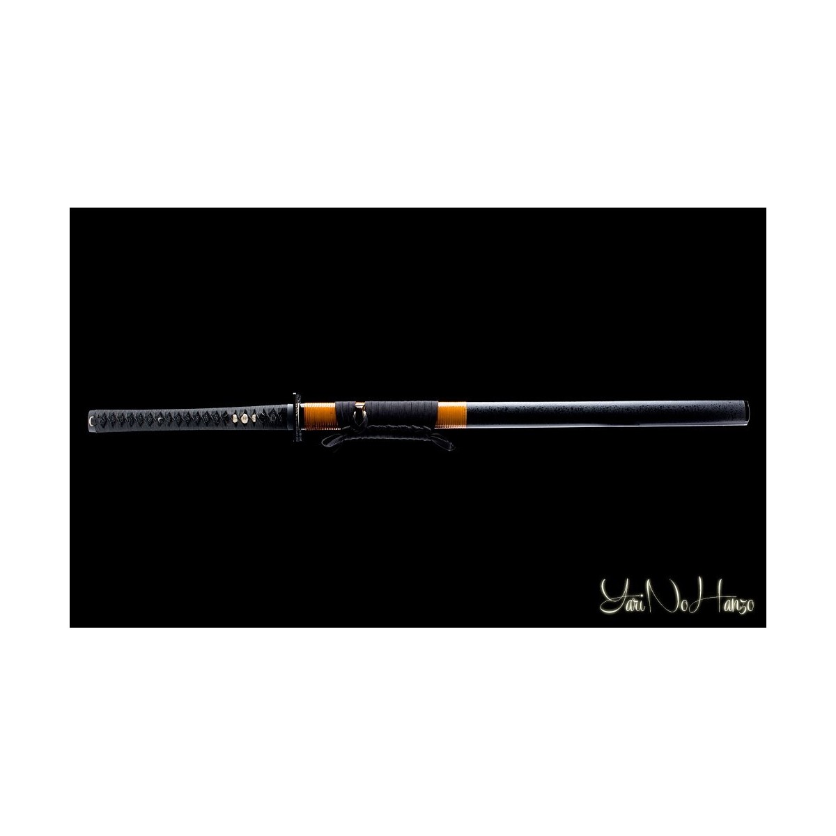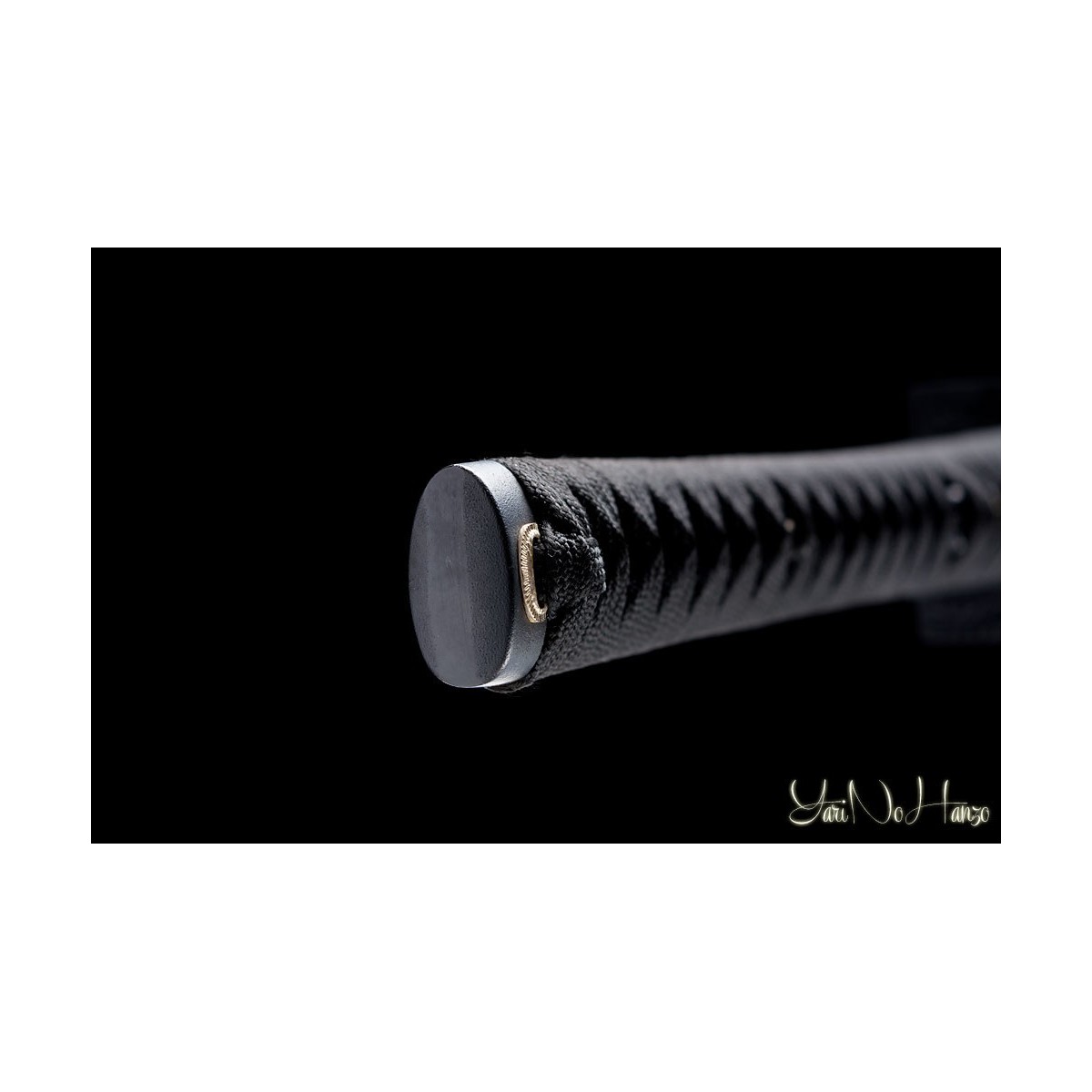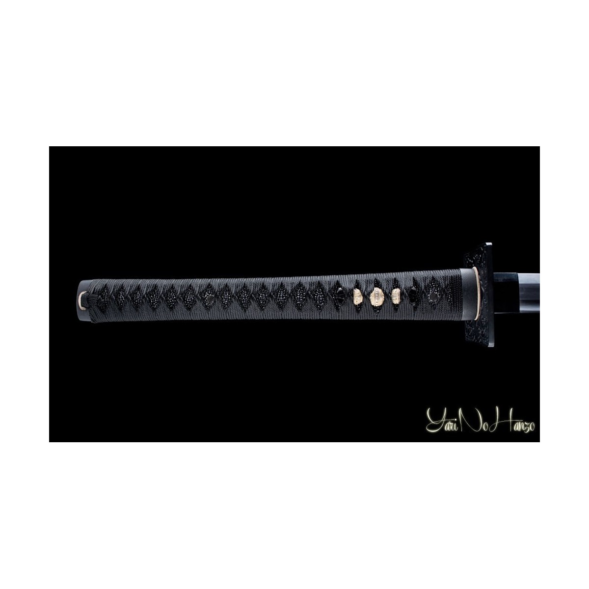 - Schwarzes Tsuka-Ito (Griffwicklung), echte schwarze Rochenhaut (Same) und Tsuba Hokei (Schwertstichblatt)