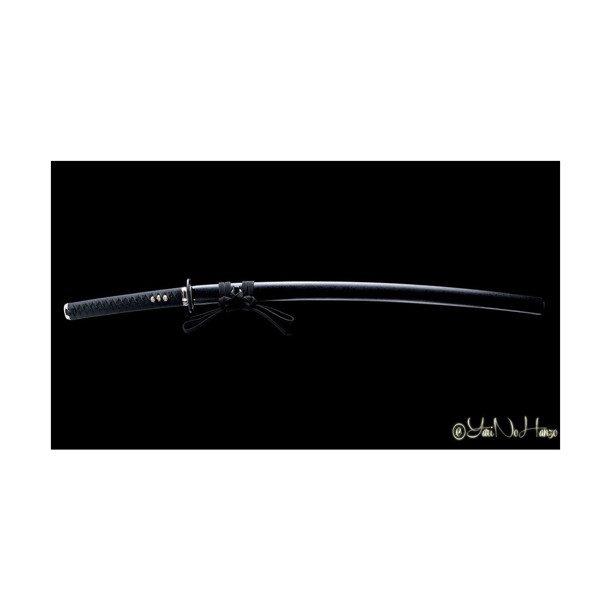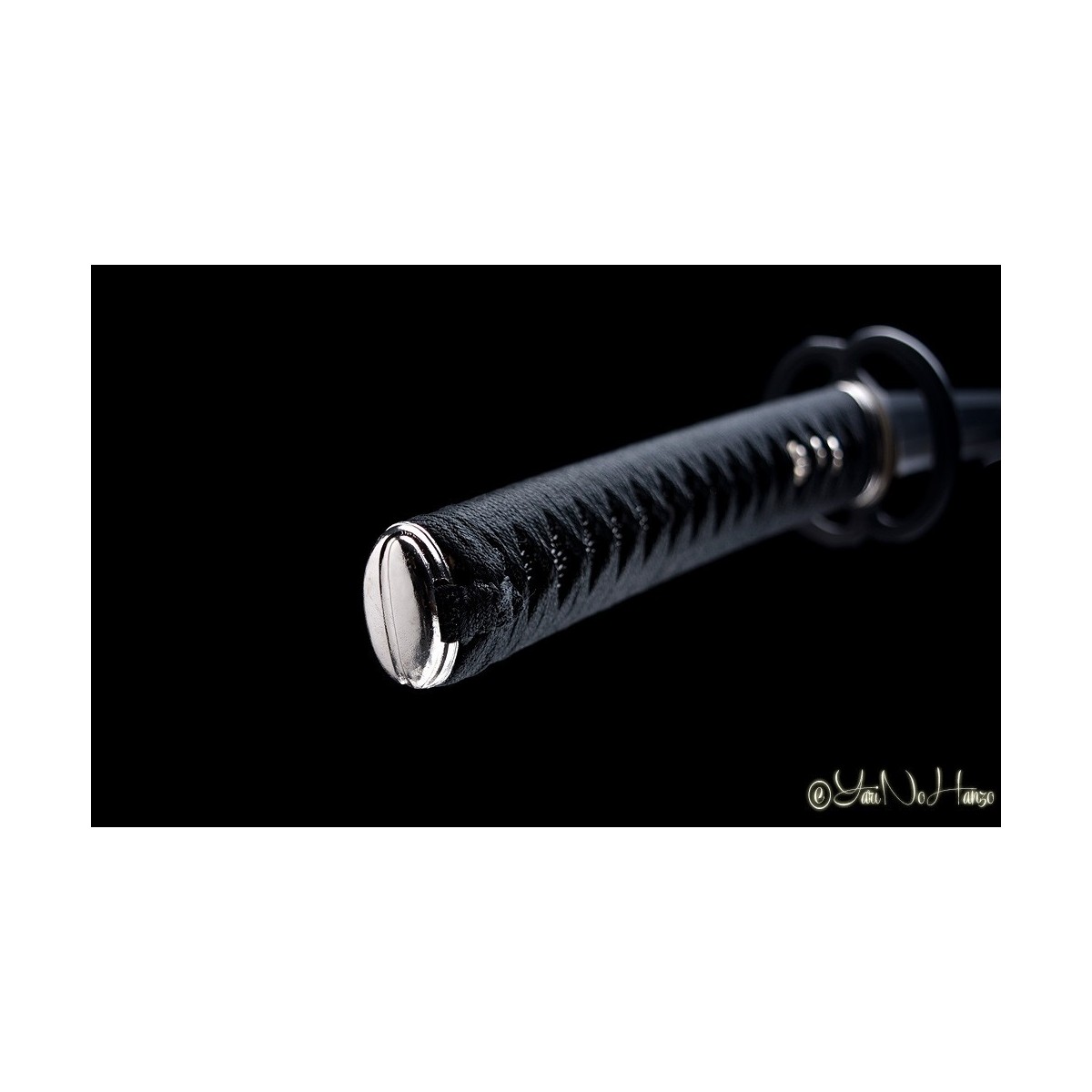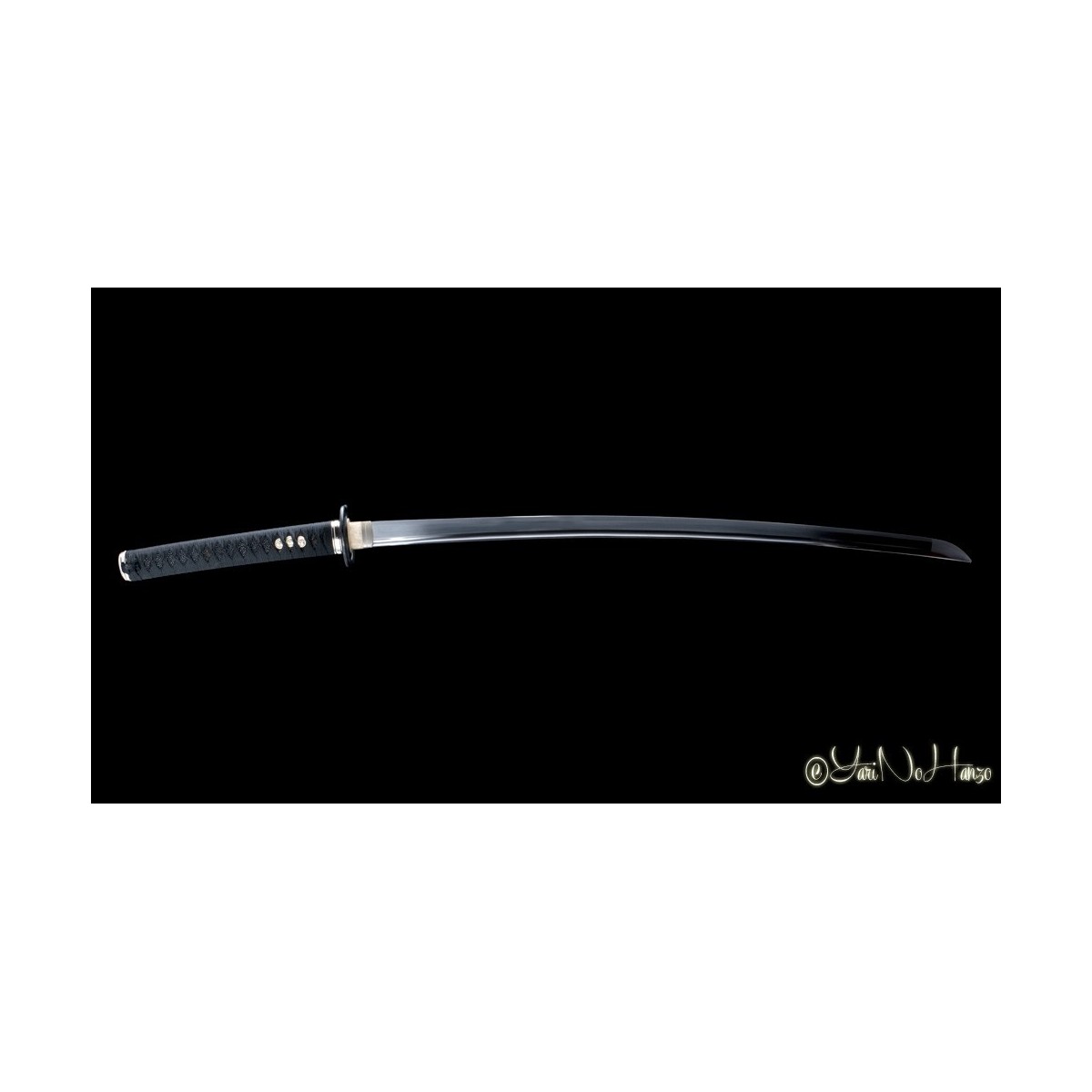 - Schwarzes Tsuka-Ito (Griffwicklung) aus Seide, echte schwarze Rochenhaut, traditionelle Musashi-Tsuba (Schwertstichblatt) und Koshirae Higo versilbert.