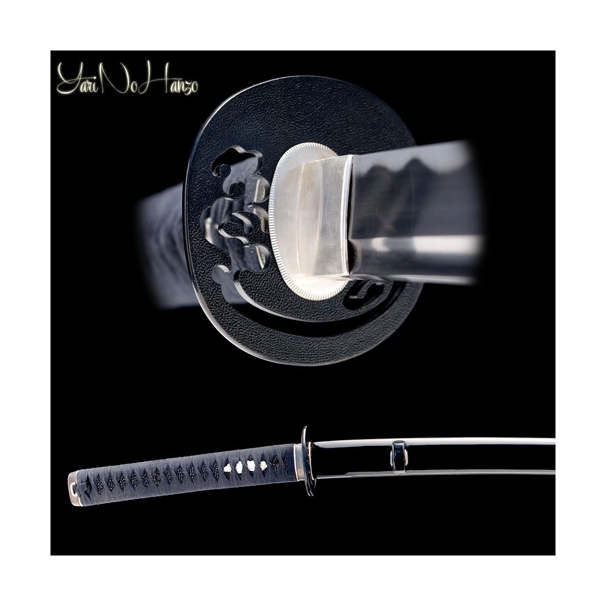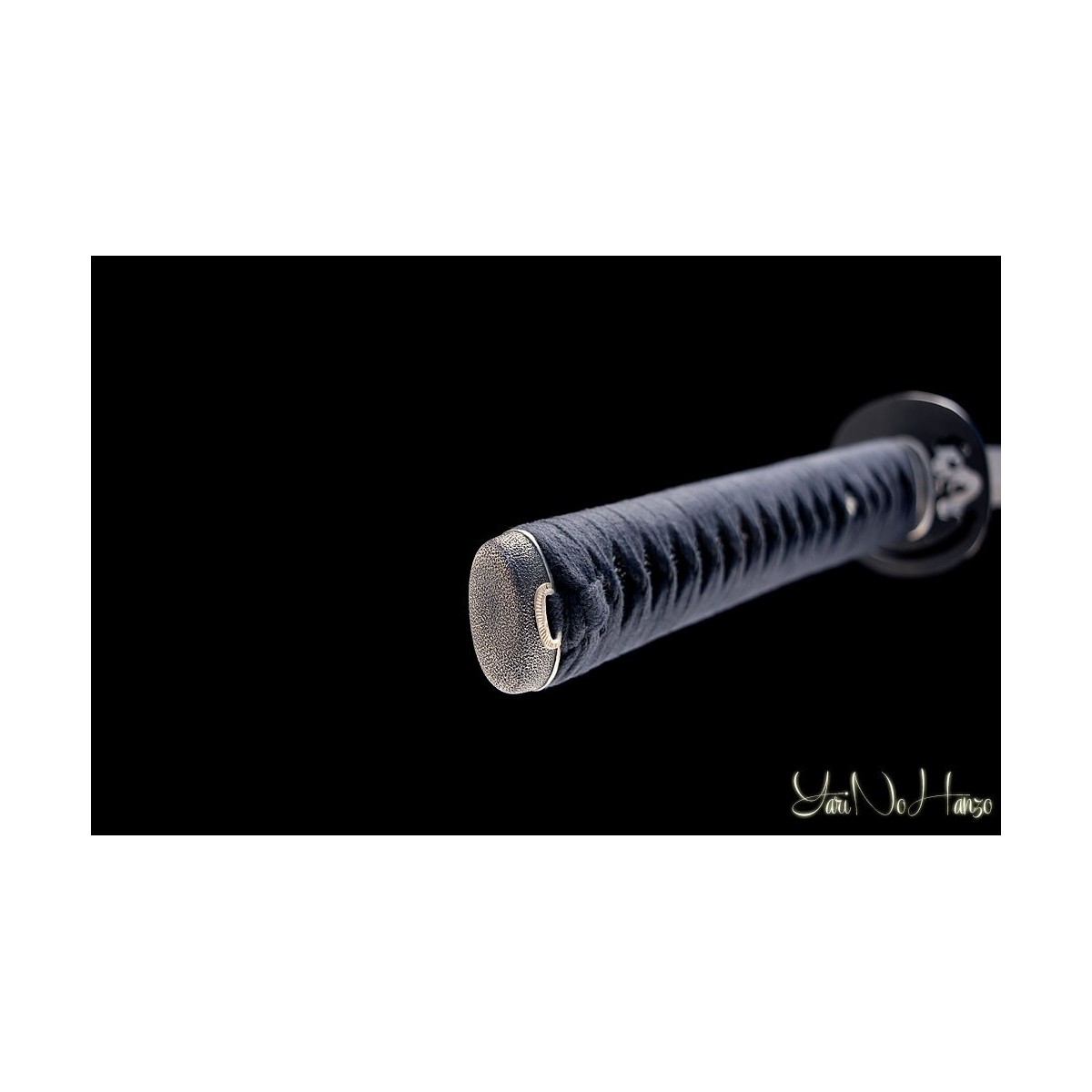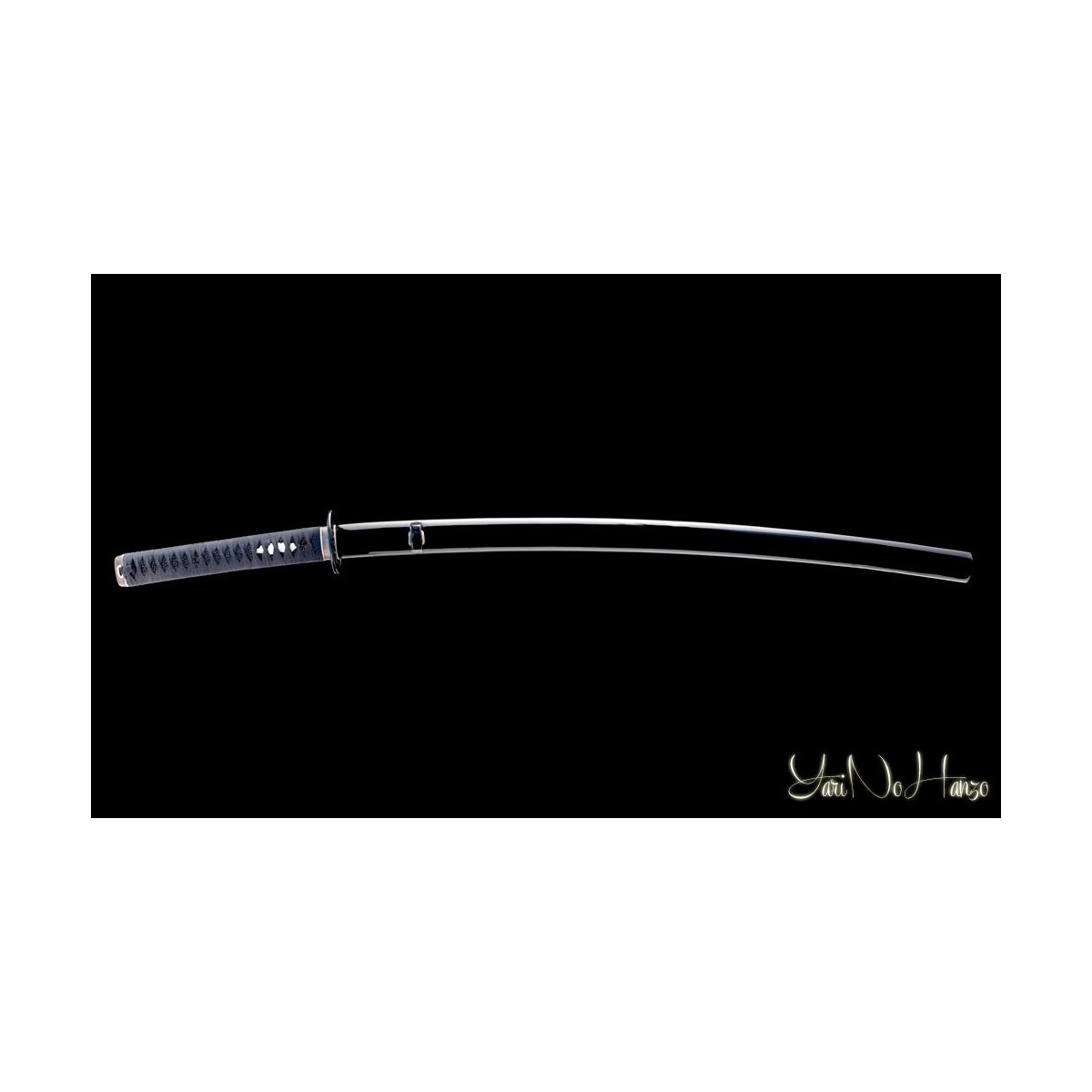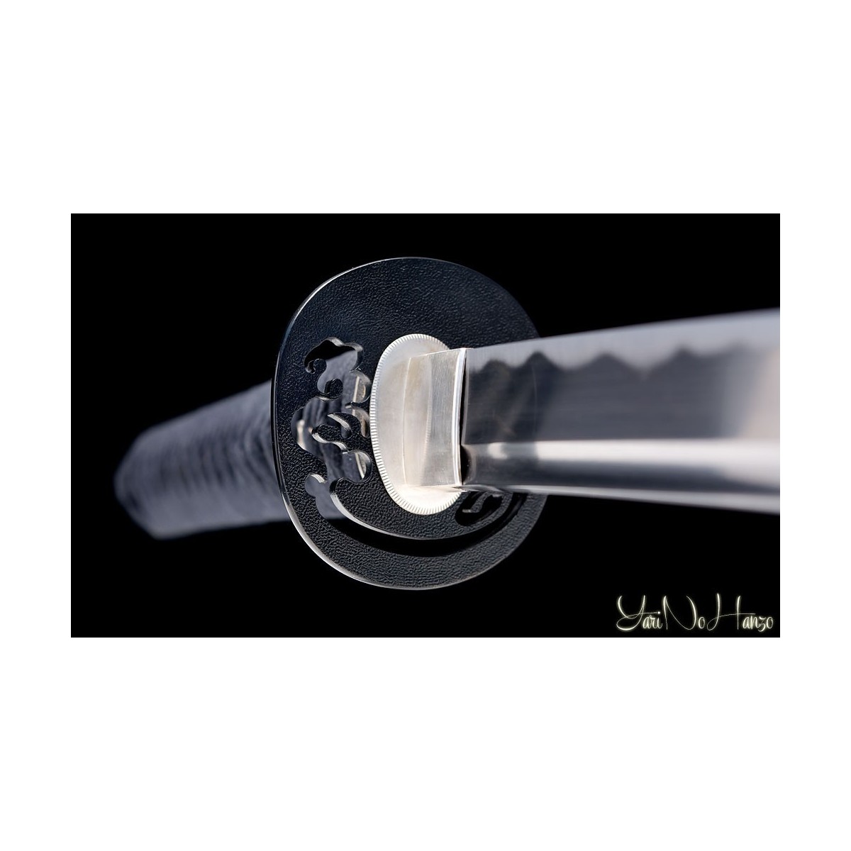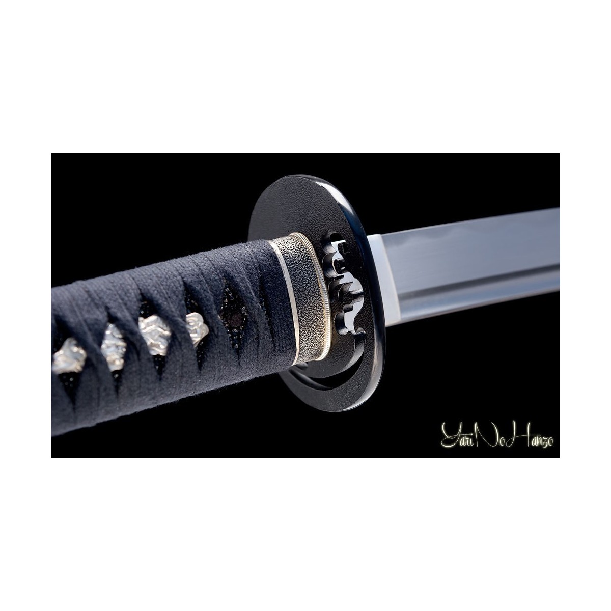 - Schwarzes Tsuka-Ito (Griffwicklung) aus 100% Baumwolle (hohe Qualität), schwarze echte Rochenhaut, traditionelle Kaku-Gata-Tsuba (Schwertstichblatt) und neues Koshirae (jap. 拵 gesamte Montur eines Schwertes) inspiriert von den japanischen Iaitos.