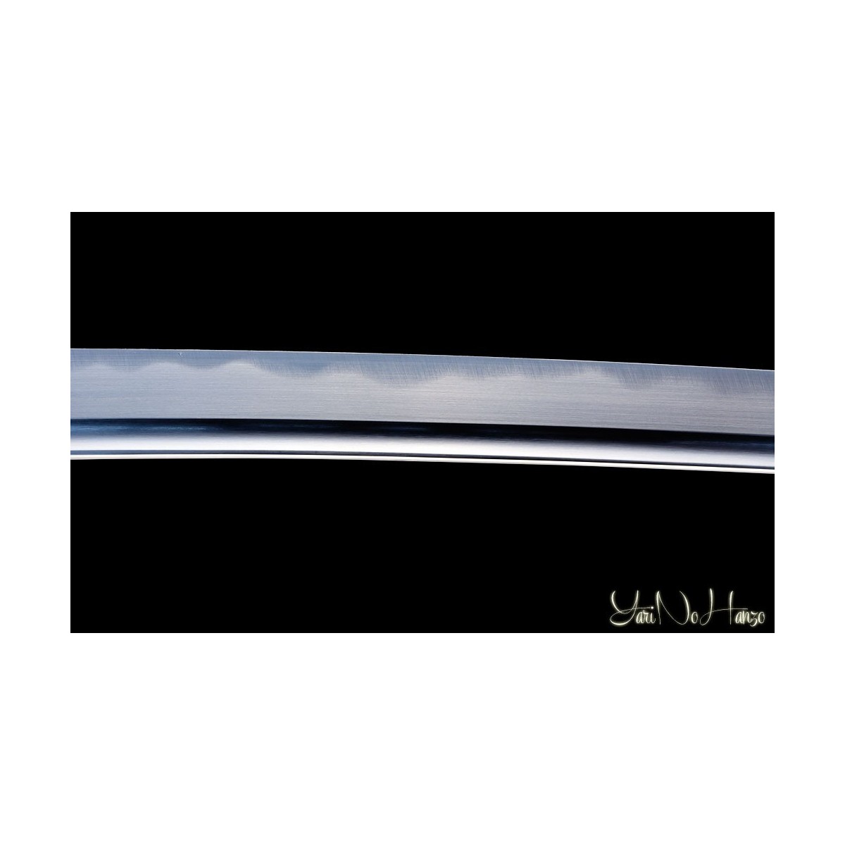 - Stumpfe Maru-Kitae-Klinge mit Bo-Hi (Kanal) handgeschmiedet aus 1060 hoch kohlenstoffhaltigem Stahl und Gunome-Choji-Hamon (Begriffsklärung (Ha = Schneide, Mon = Muster)) durch Ätzen erhalten.