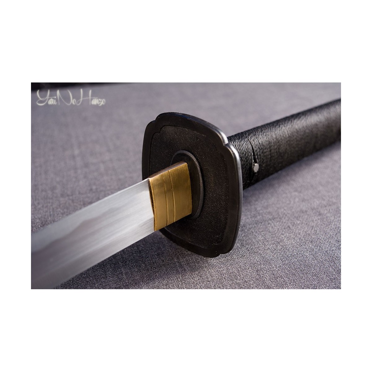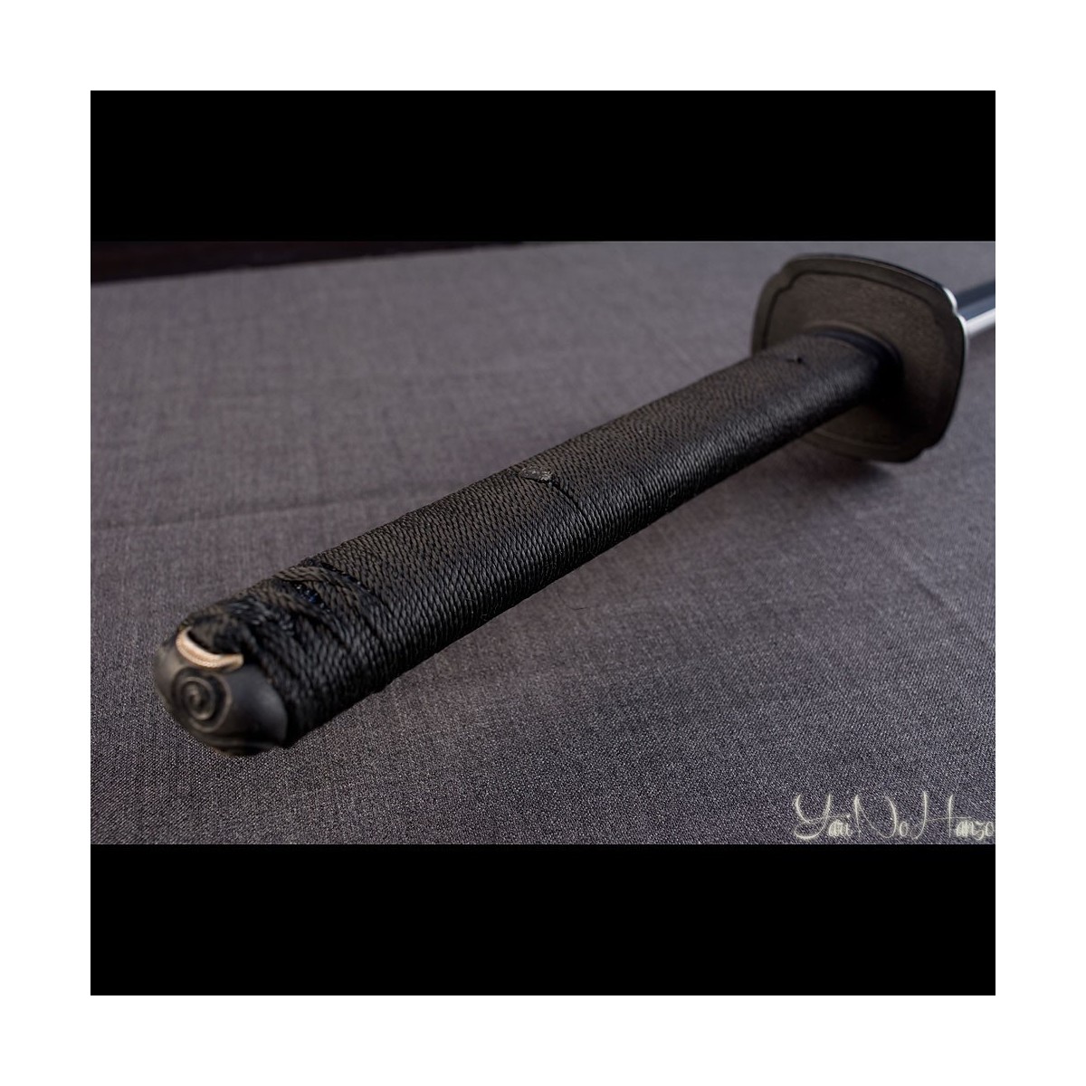 - Schwarzes Tsuka-Ito (Griffwicklung) aus Polyester, schwarze echte Samegawa Rochenhaut und traditionelle Mokko-Tsuba (Schwertstichblatt).