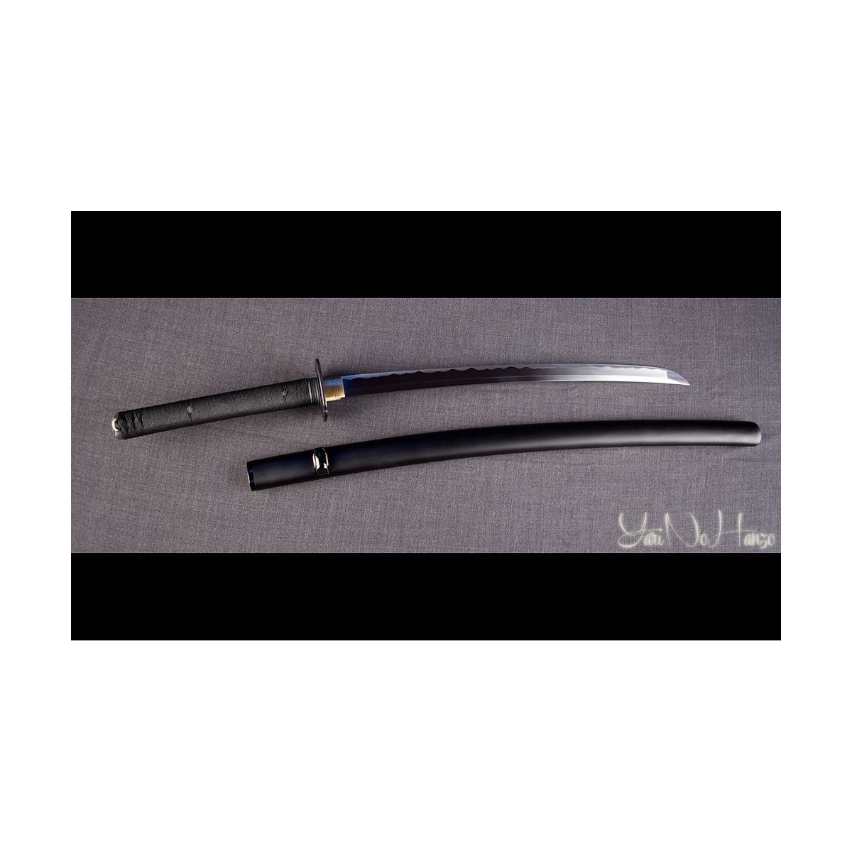 - Scharfe Maru-Kitae-Klinge ohne Bo-Hi (Kanal) handgeschmiedet aus 1060 hoch kohlenstoffhaltigem Stahl und Notare-Hamon (Begriffsklärung (Ha = Schneide, Mon = Muster)) durch Ätzen erhalten.