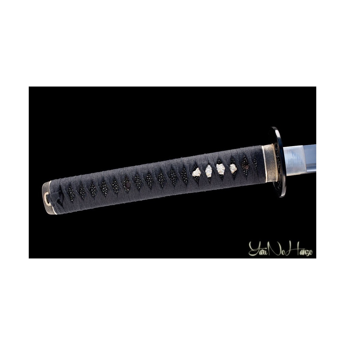 - Schwarzes Tsuka-Ito (Griffwicklung) aus 100% Baumwolle (hohe Qualität), schwarze echte Rochenhaut, traditionelle Kaku-Gata-Tsuba (Schwertstichblatt) und neues Koshirae (jap. 拵 gesamte Montur eines Schwertes) inspiriert von den japanischen Iaitos.