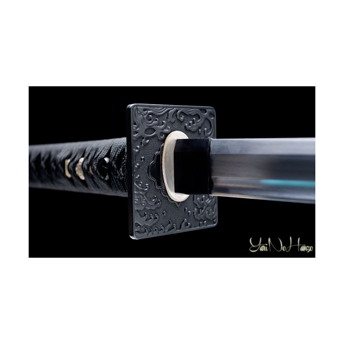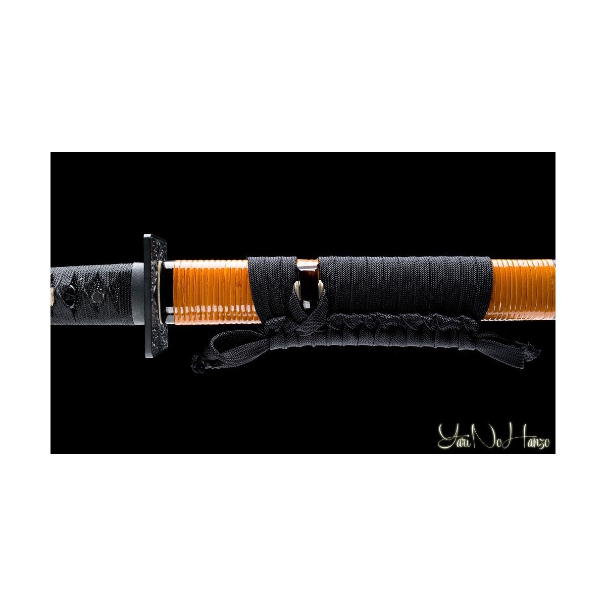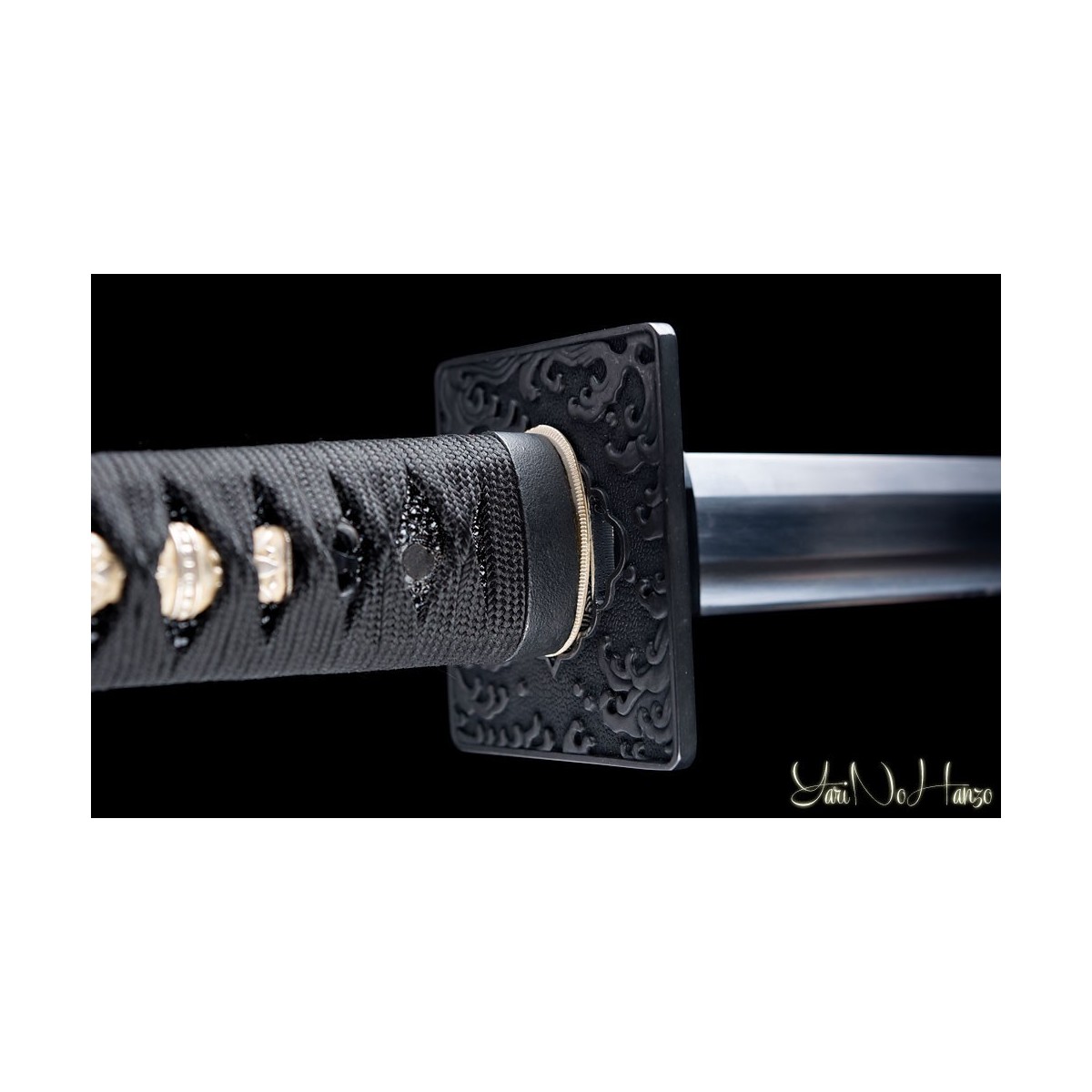 - Schwarzes Tsuka-Ito (Griffwicklung), echte schwarze Rochenhaut (Same) und Tsuba Hokei (Schwertstichblatt)