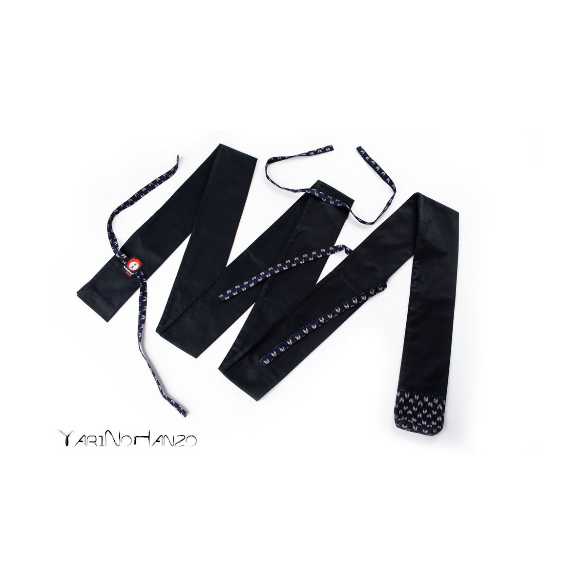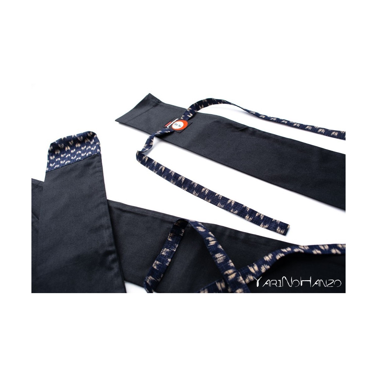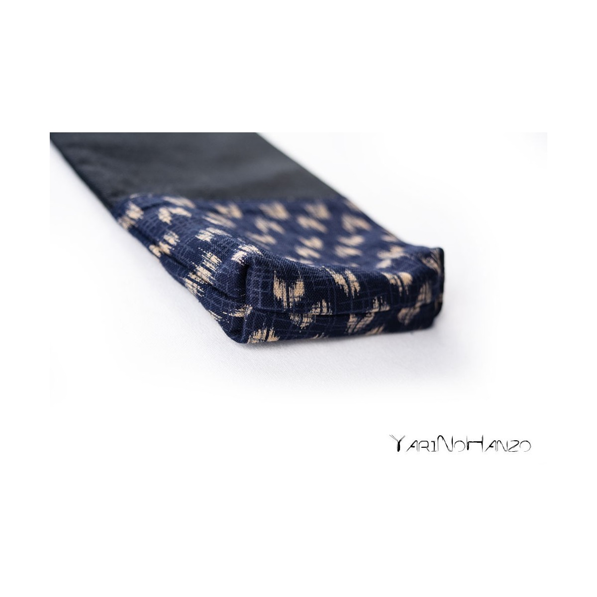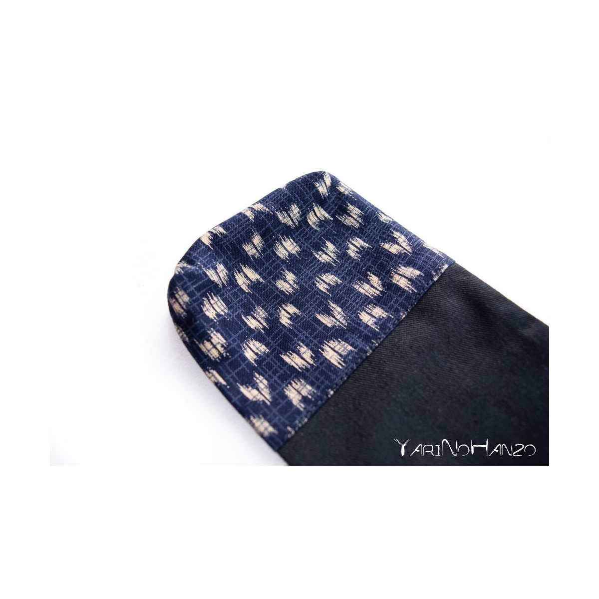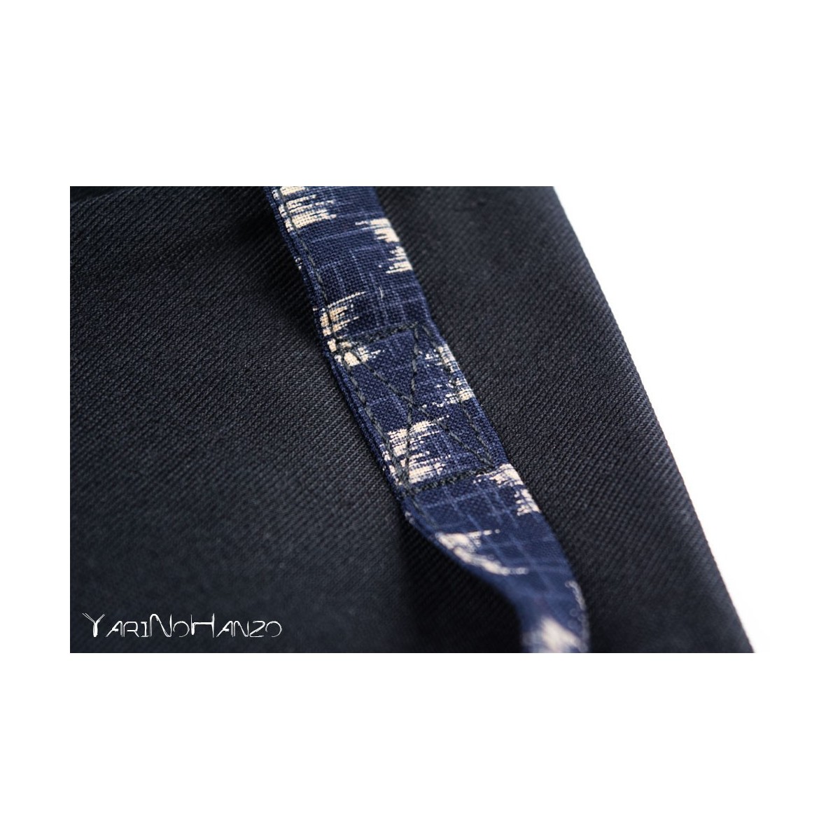 - Schwarzer Stoff aus 55% Baumwolle / 45% Polyester mit Einsätzen aus 100% japanischer Baumwolle im blauen "Yasuri" -Stil