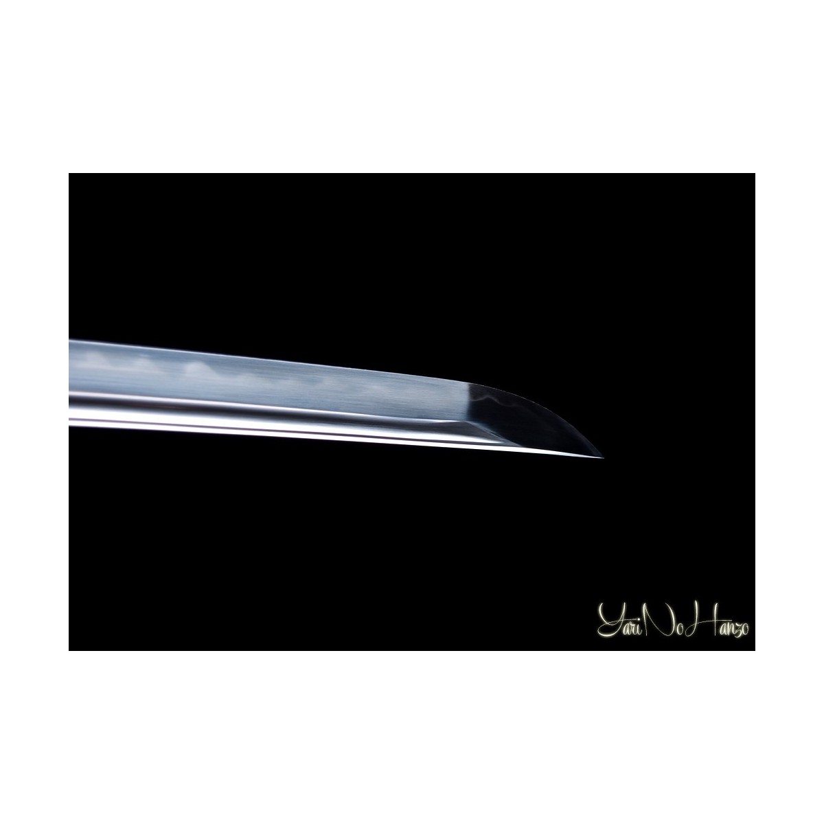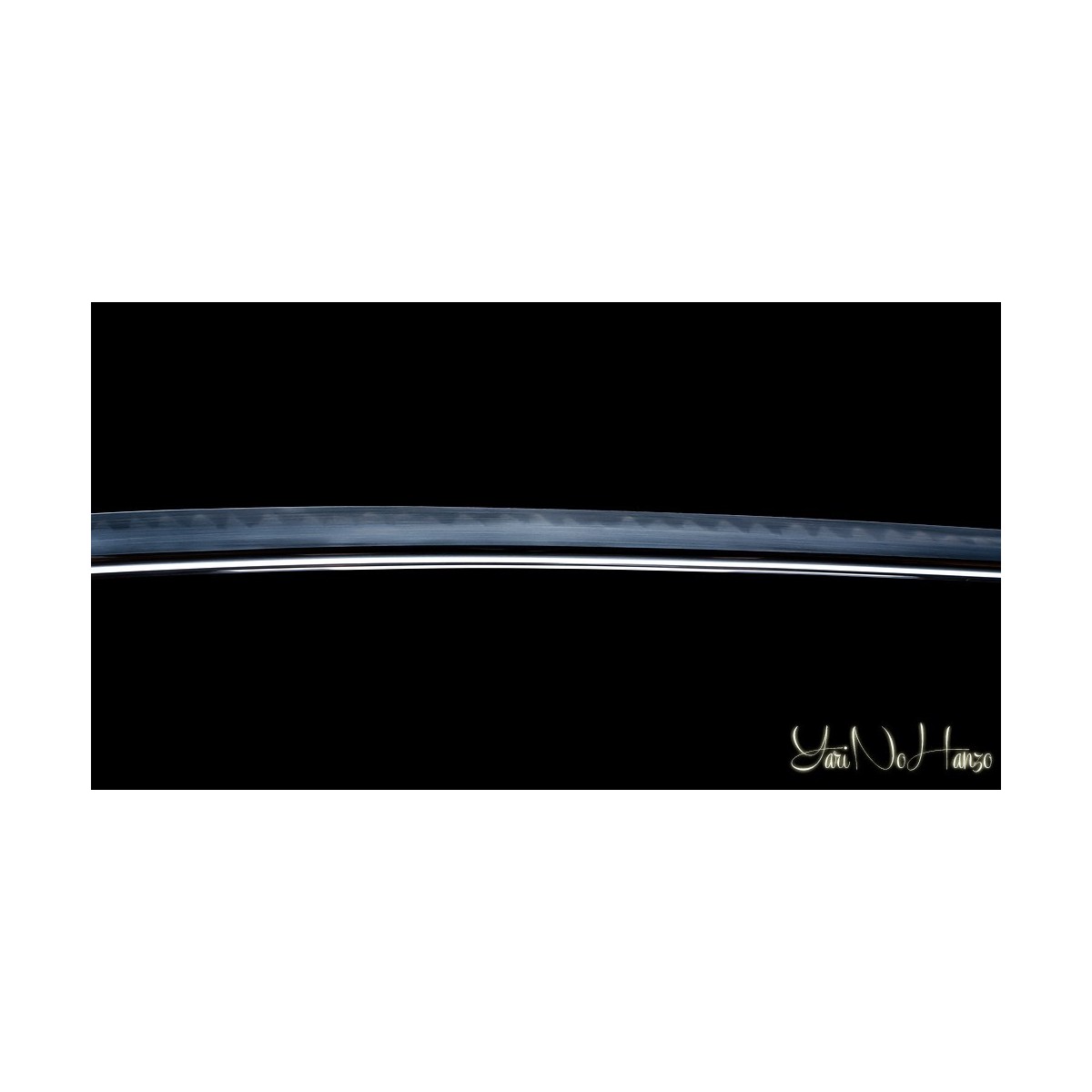 - Stumpfe Maru-Kitae-Klinge mit Bo-Hi (Kanal) handgeschmiedet aus 1095 hoch kohlenstoffhaltigem Stahl, selektiven Härtung Ton und echte Gunome-Choji-Hamon (Begriffsklärung (Ha = Schneide, Mon = Muster)). Verbesserte Nakago mit Katte-Agari-Yasurime