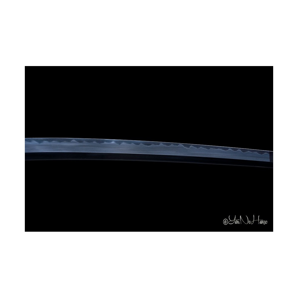 Stumpfe Maru-Kitae-Klinge ohne Bo-Hi (Kanal) mit Ō-Kissaki (大切先, „große Kissaki“) der Länge von 14 Cm., handgeschmiedet aus 1095 hoch kohlenstoffhaltigem Stahl, selektiven Härtung Ton und echte Gunome-Choji-Hamon (Begriffsklärung (Ha = Schneide, Mon = Muster)).