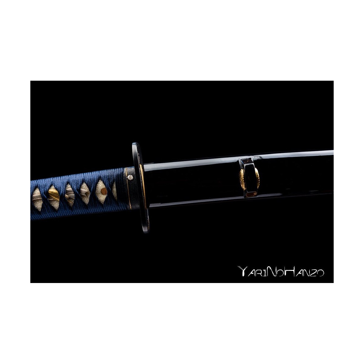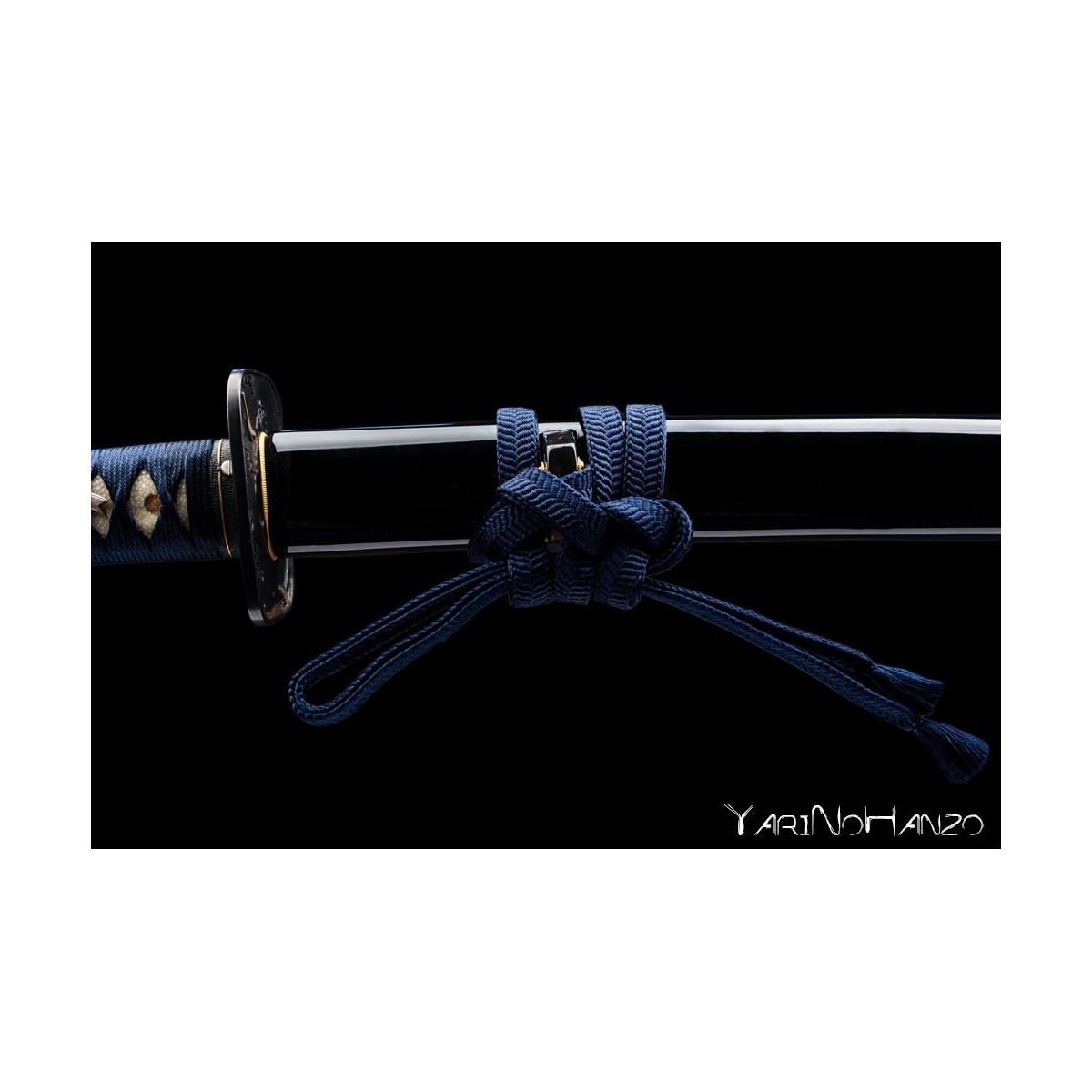 - Schwarze hochglanzlackierte Saya (Scheide) aus Holz mit traditionell angebrachter Griffumwicklung und Abschlüsse aus edlem Büffelhorn.