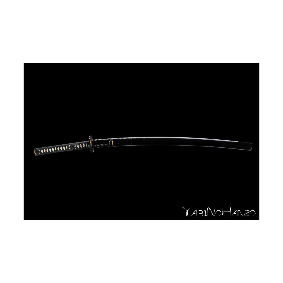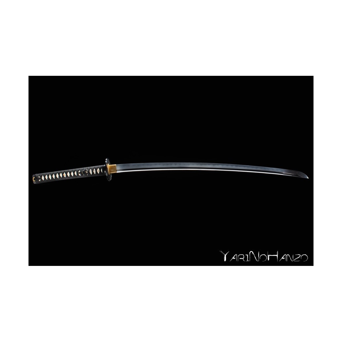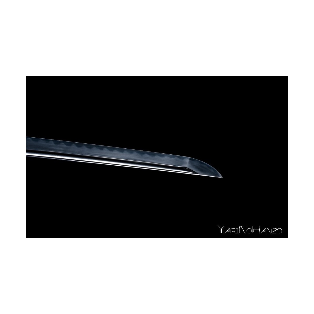 - Stumpfe Maru-Kitae-Klinge mit Bo-Hi (Kanal) handgeschmiedet aus 1095 hoch kohlenstoffhaltigem Stahl, selektiven Härtung Ton und echte Gunome-Choji-Hamon (Begriffsklärung (Ha = Schneide, Mon = Muster)). Verbesserte Nakago mit Katte-Agari-Yasurime