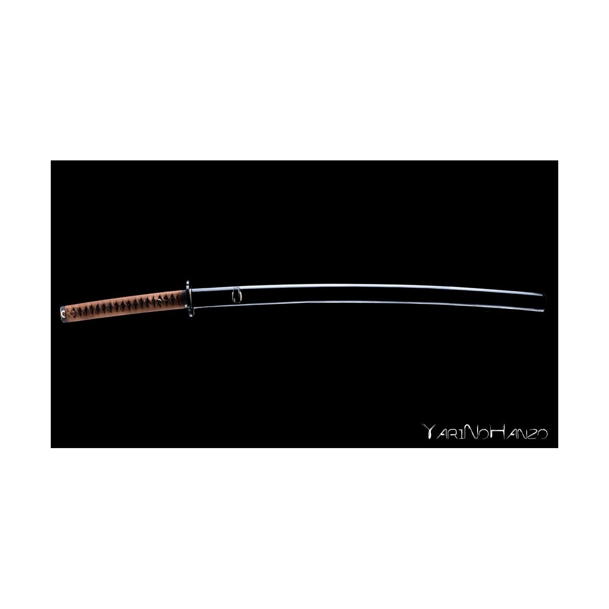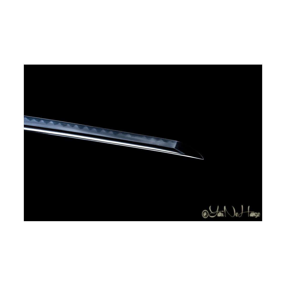 - Stumpfe Maru-Kitae-Klinge mit Bo-Hi (Kanal) handgeschmiedet aus 1095 hoch kohlenstoffhaltigem Stahl, selektiven Härtung Ton und echte Gunome-Choji-Hamon (Begriffsklärung (Ha = Schneide, Mon = Muster)). Verbesserte Nakago mit Katte-Agari-Yasurime