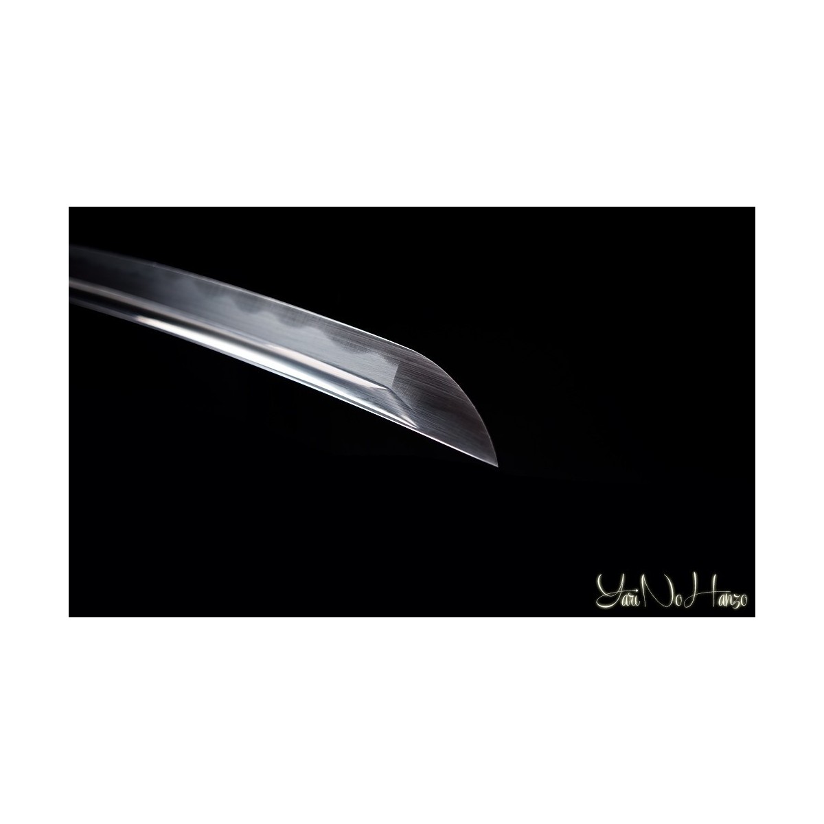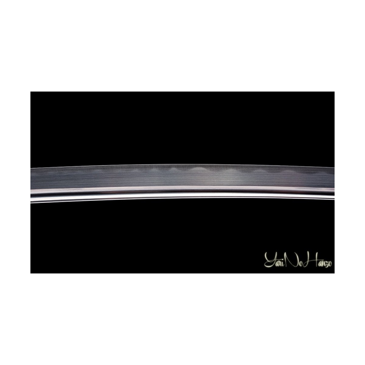 - 79 Cm. Stumpfe Maru-Kitae-Klinge mit Bo-Hi (Kanal) handgeschmiedet aus 1060 hoch kohlenstoffhaltigem Stahl und Notare-Hamon (Begriffsklärung (Ha = Schneide, Mon = Muster)) durch Ätzen erhalten.