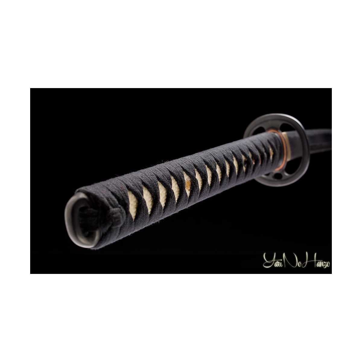 - Schwarzes Tsuka-Ito (Griffwicklung) aus 100% Baumwolle, weisse echte Rochenhaut, traditionelle Tsuba (Schwertstichblatt) und Higo-Koshirae.