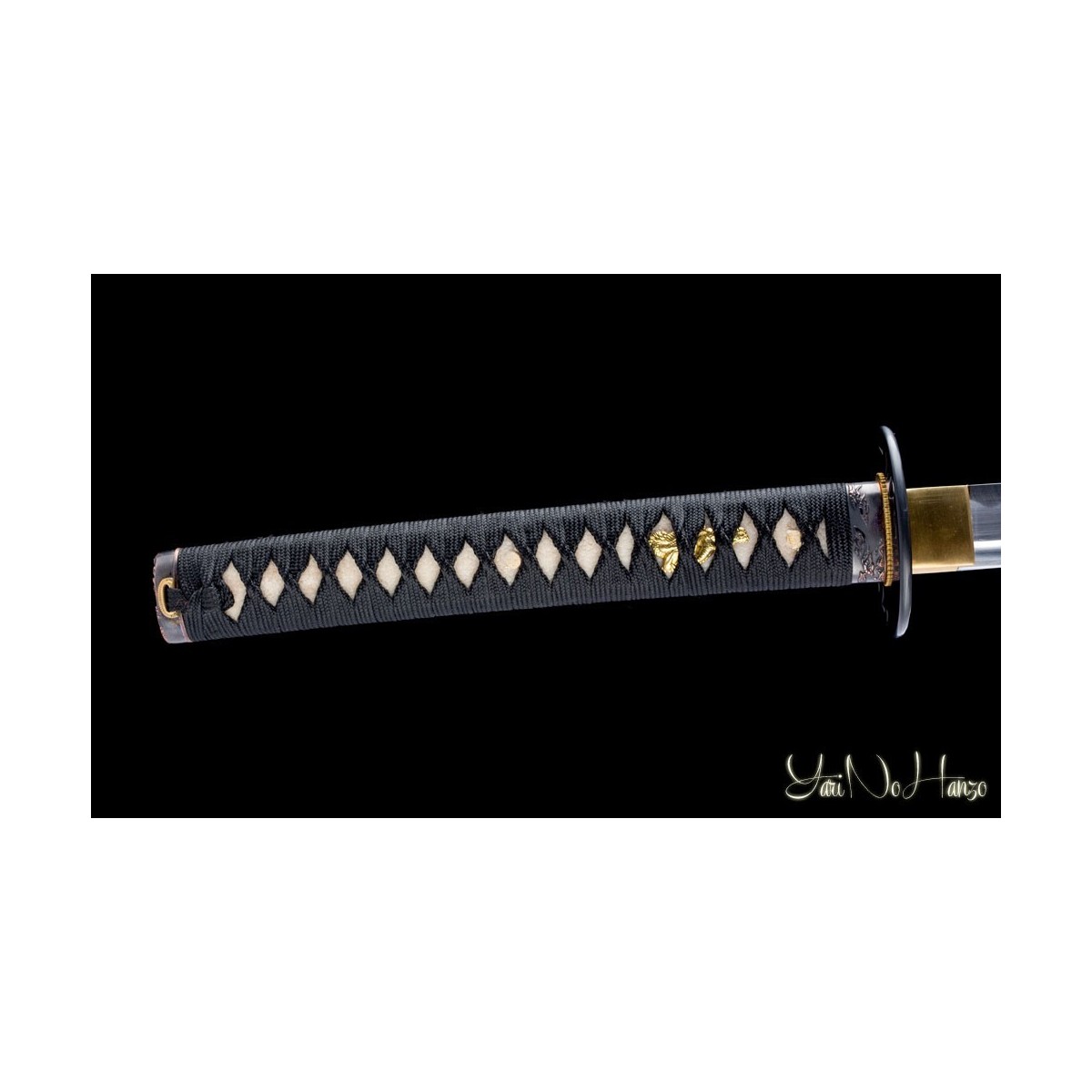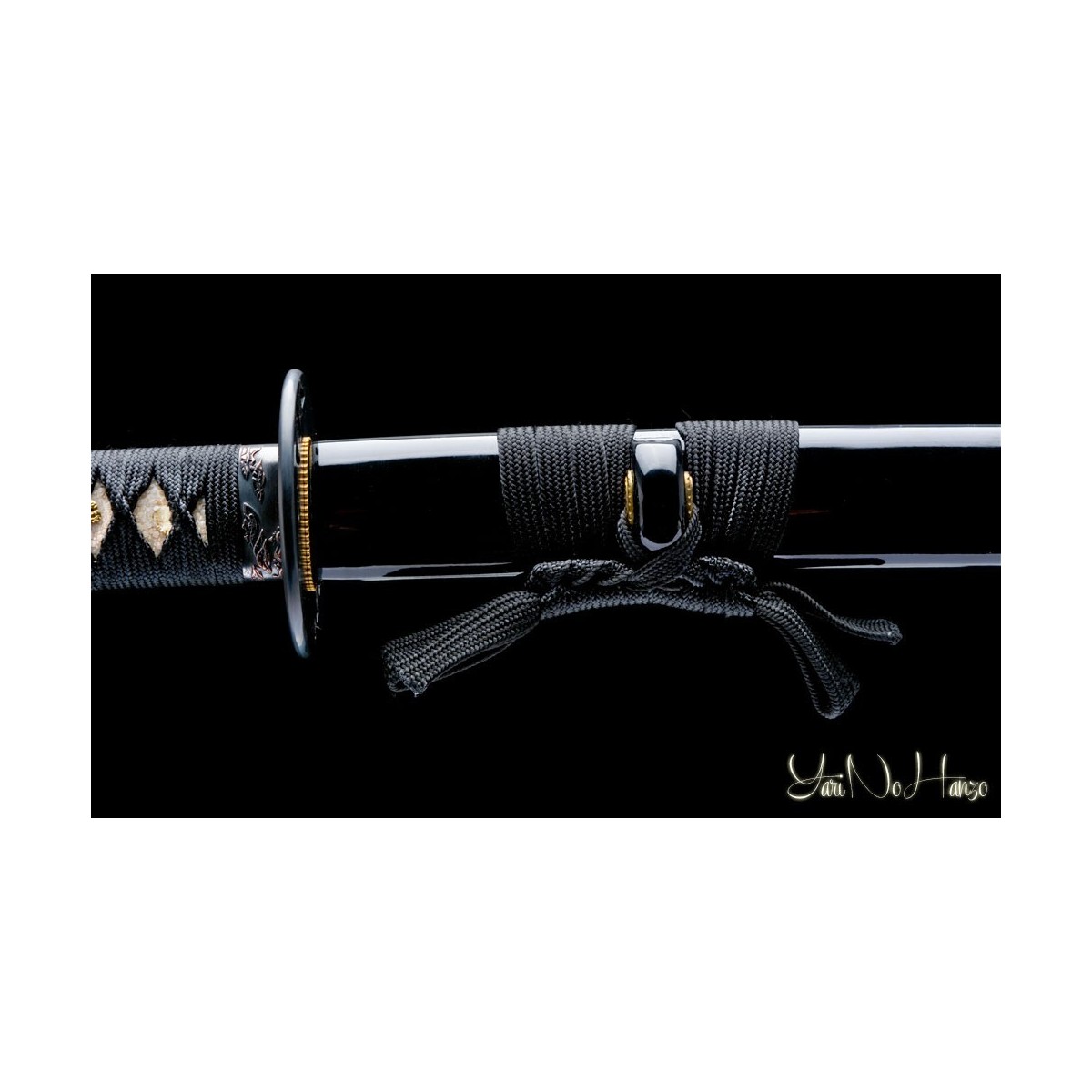 - Schwarze hochglanzlackierte Saya (Scheide) aus Holz, schwarzes Tsuka-Ito (Griffwicklung) und Tsuba aus Eisen.