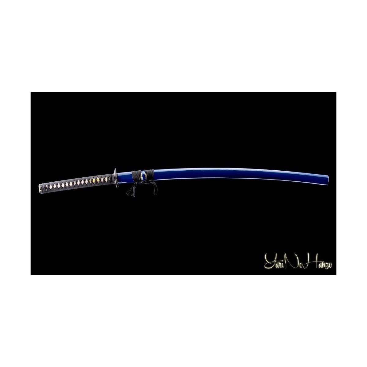 - Blaue hochglanzlackierte Saya (Scheide) aus Holz, schwarzes Tsuka-Ito (Griffwicklung) und Tsuba aus Eisen.