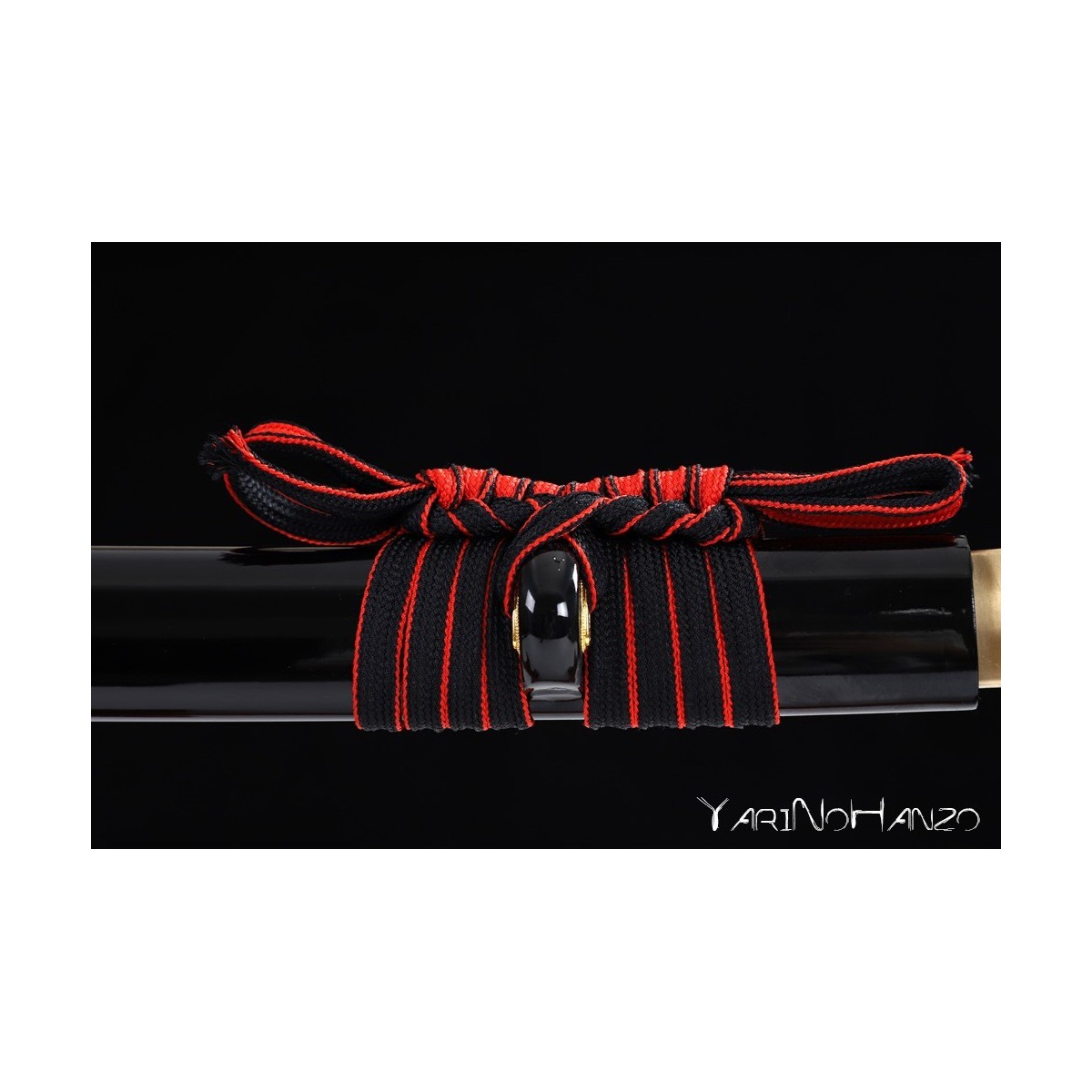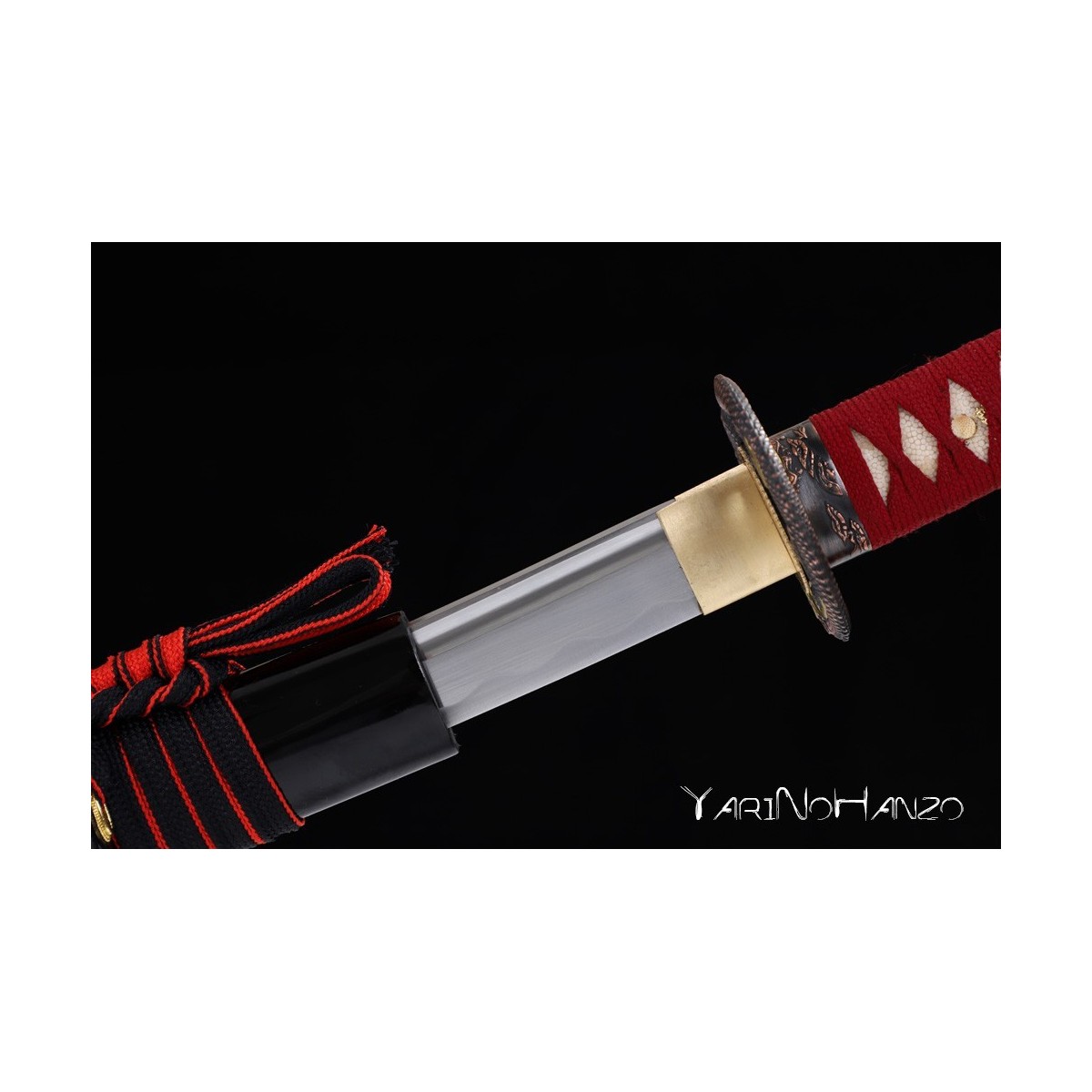 - Schwarze hochglanzlackierte Saya (Scheide) aus Holz, rotes Tsuka-Ito (Griffwicklung).