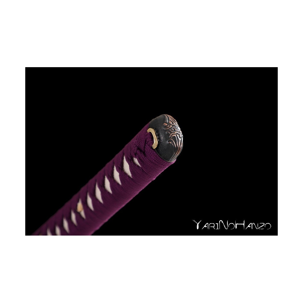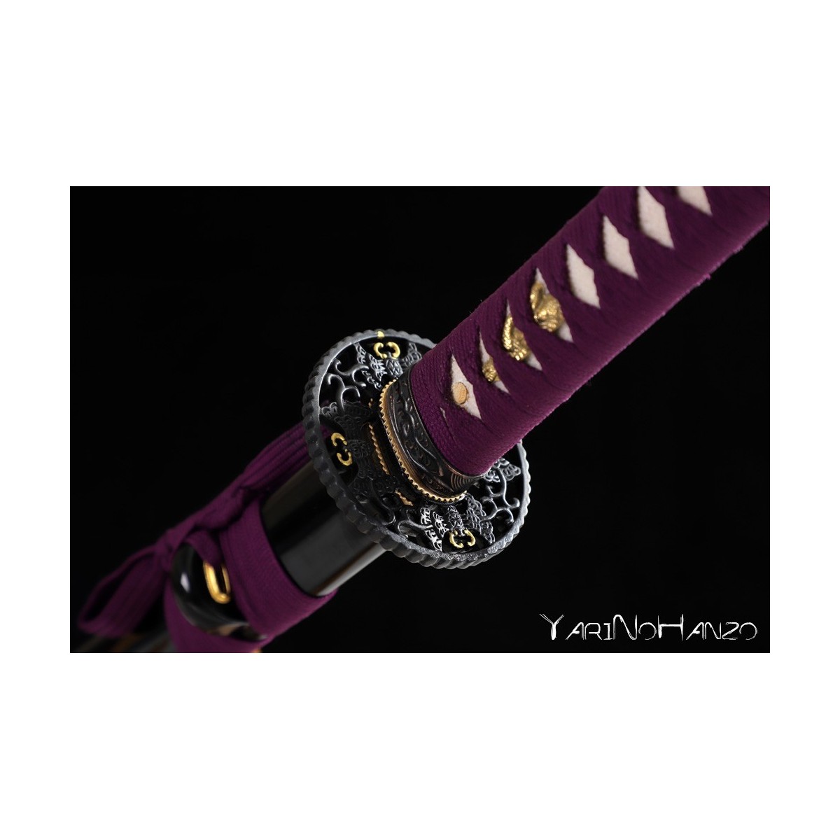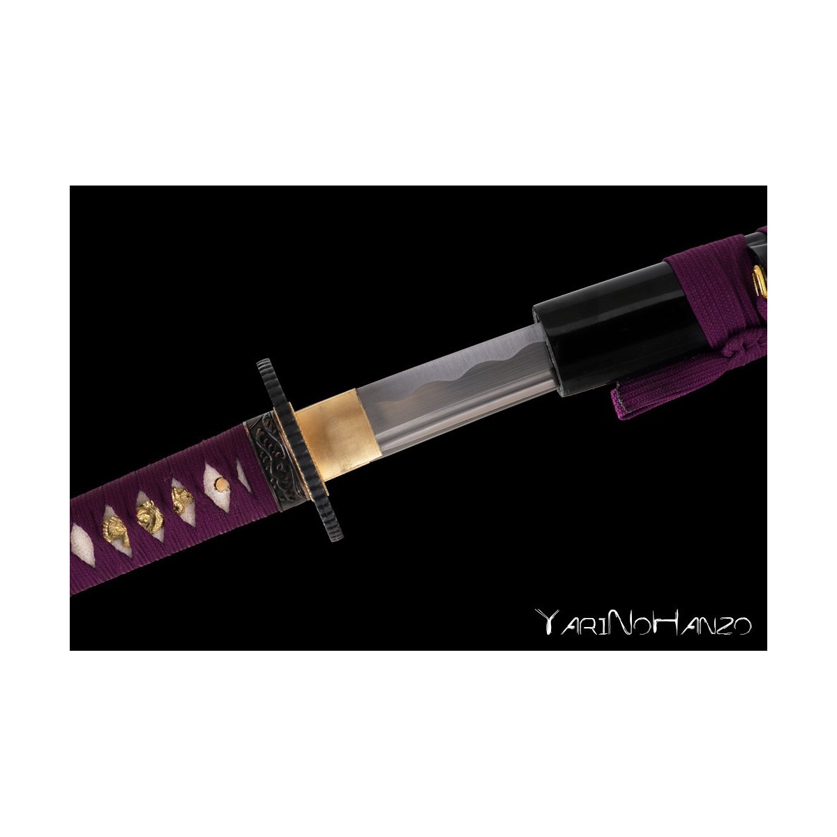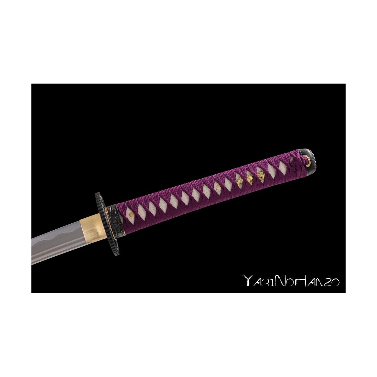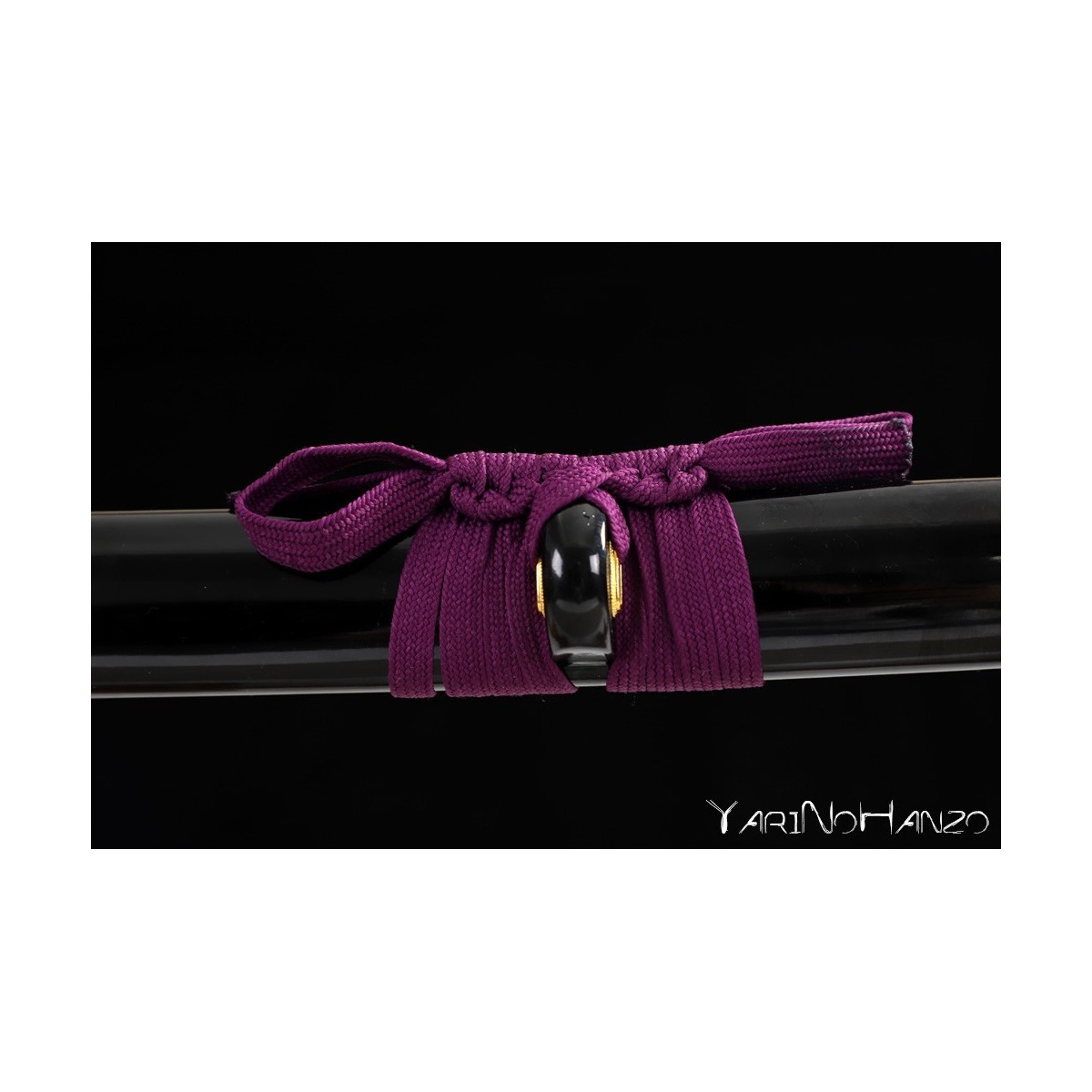 - Schwarze hochglanzlackierte Saya (Scheide) aus Holz, lilas Tsuka-Ito (Griffwicklung).
