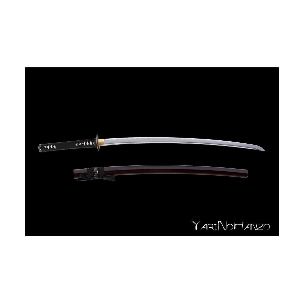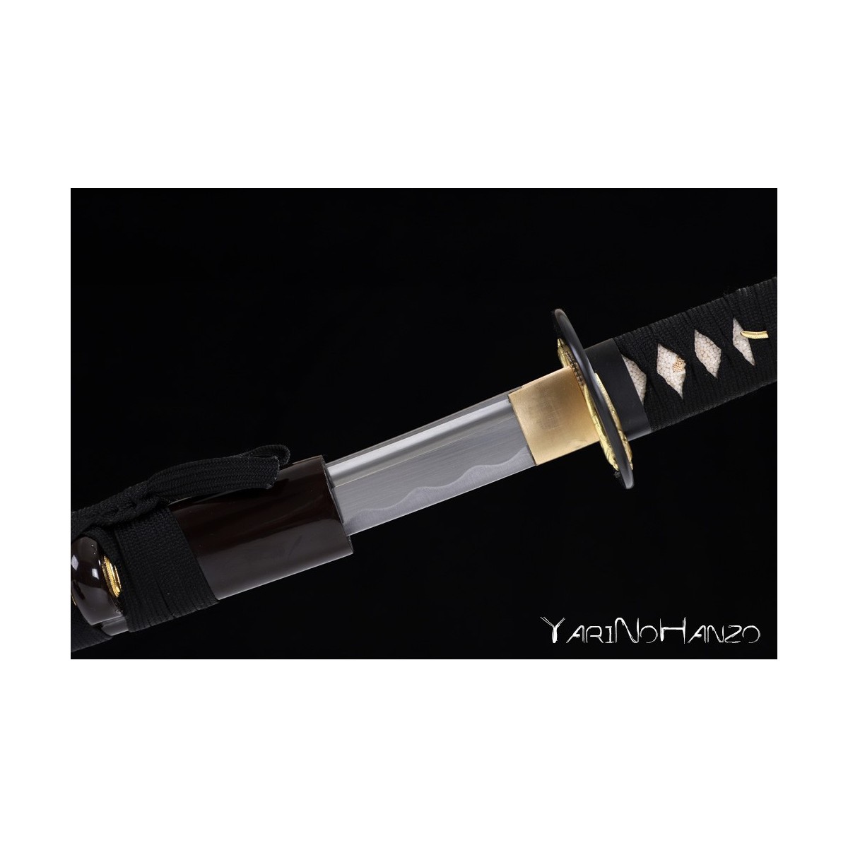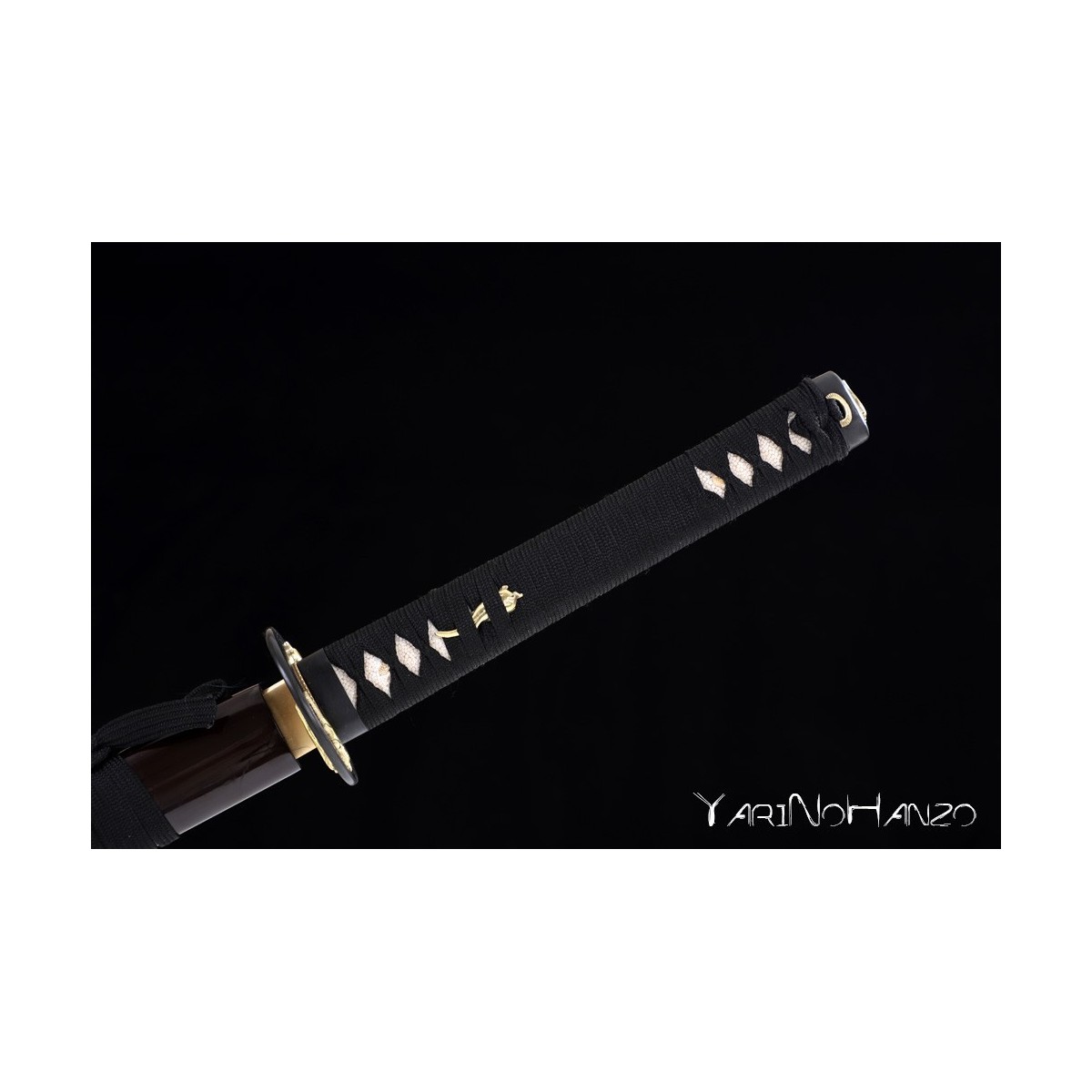 - Dunkelbraune hochglanzlackierte Saya (Scheide) aus Holz und schwarzes Tsuka-Ito (Griffwicklung) Katate Maki.