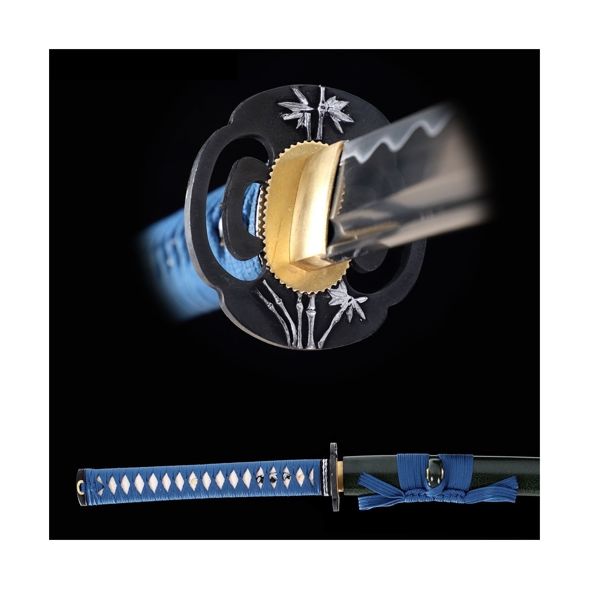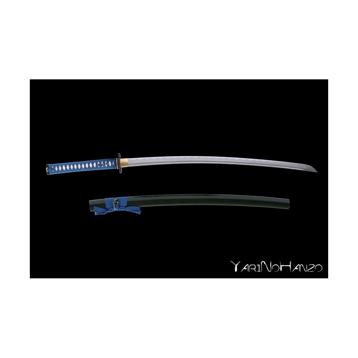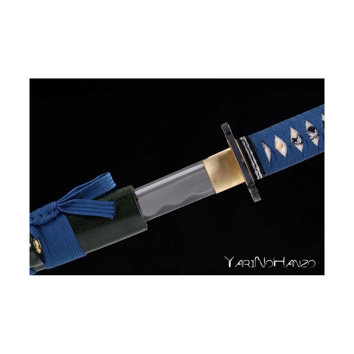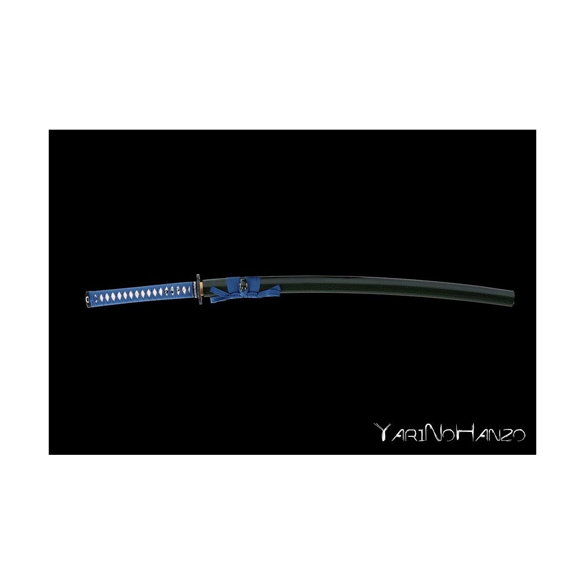 - Schwarz-Grüne hochglanzlackierte Saya (Scheide) aus Holz, hellblauesTsuka-Ito (Griffwicklung).