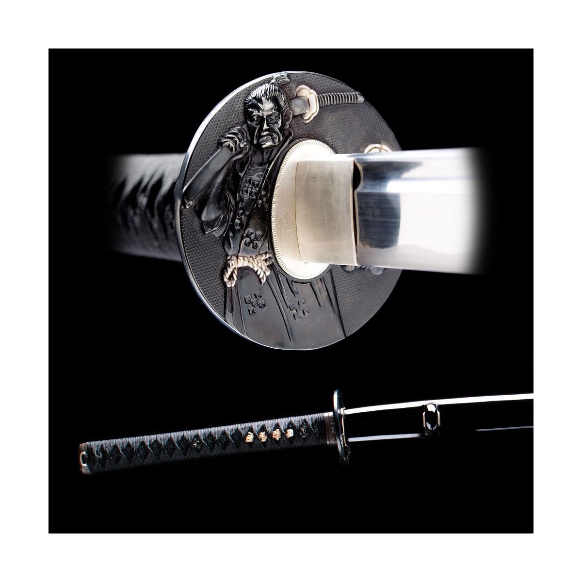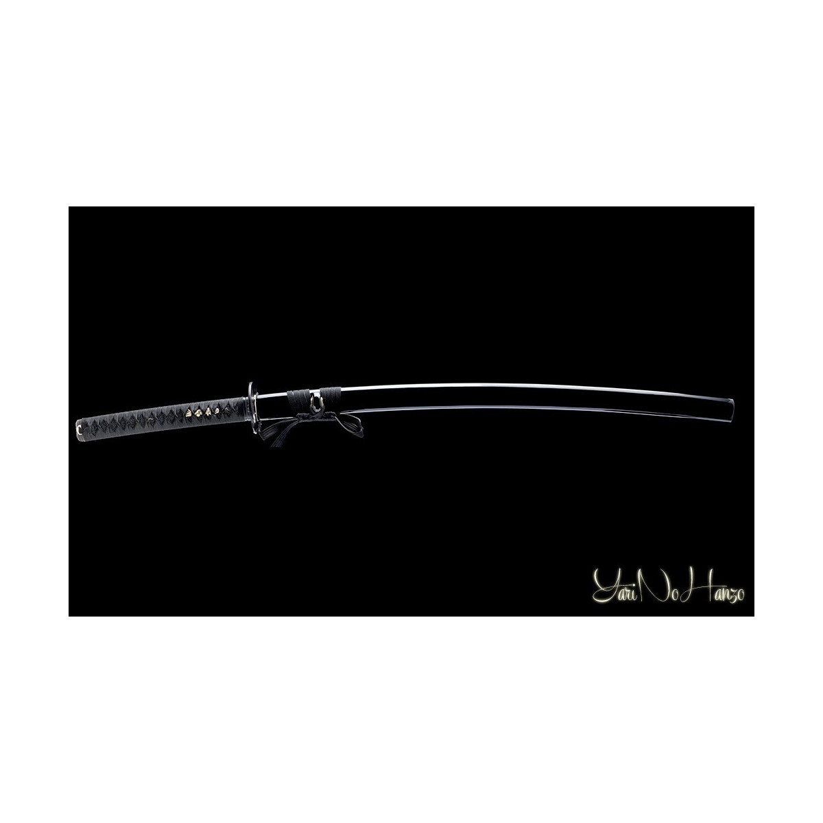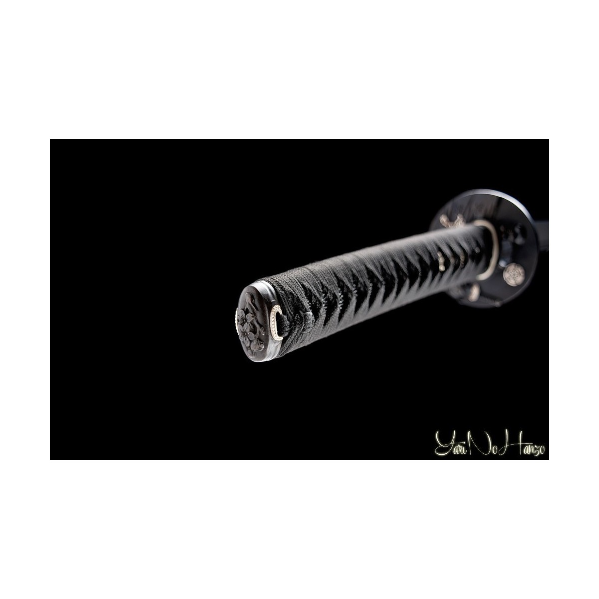 - Schwarze hochglanzlackierte Saya (Scheide) aus Holz und schwarzes Tsuka-Ito (Griffwicklung).
