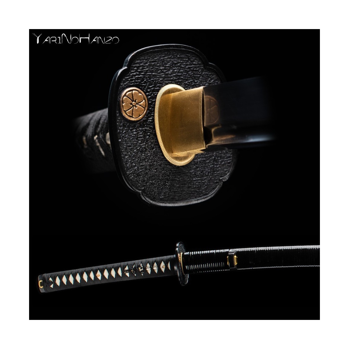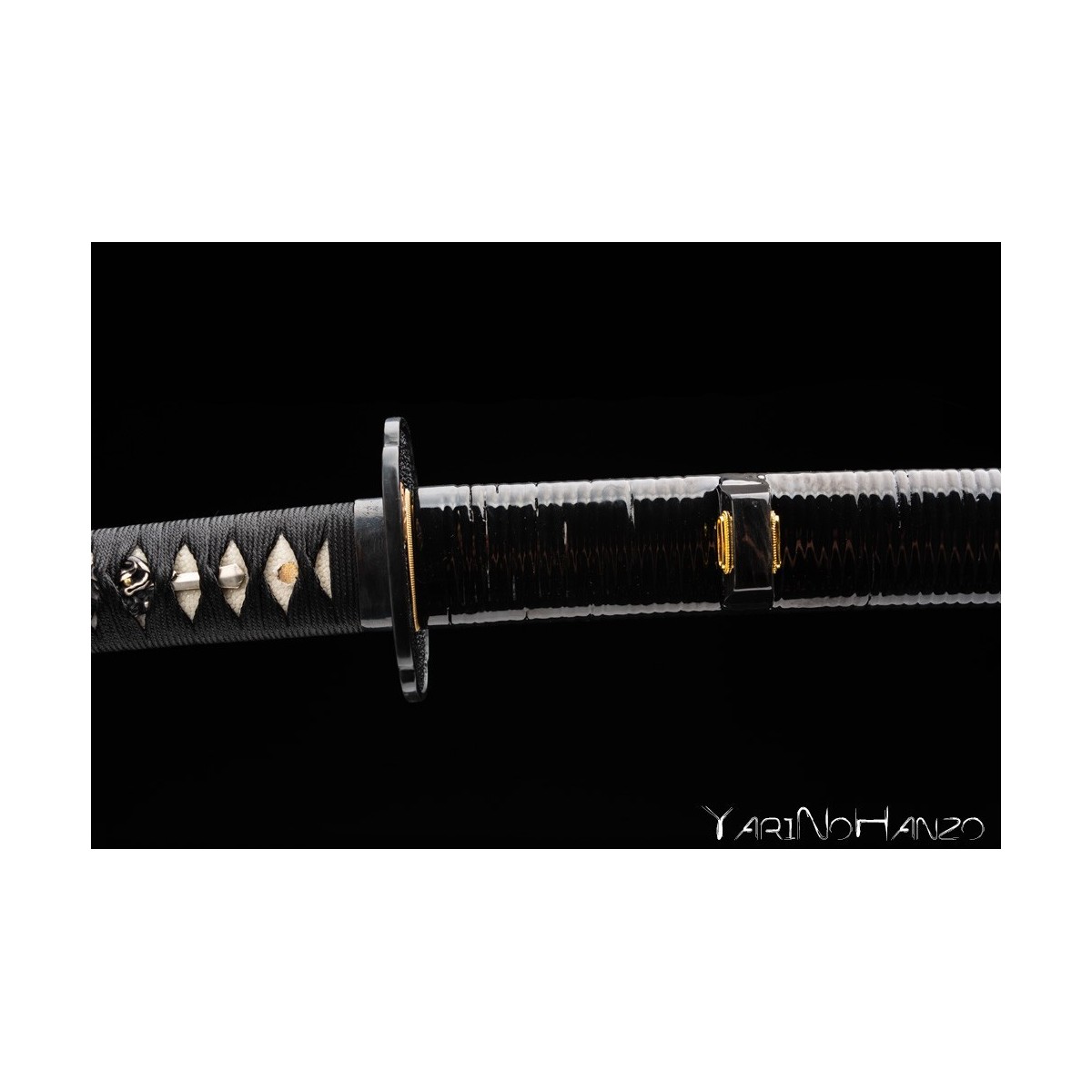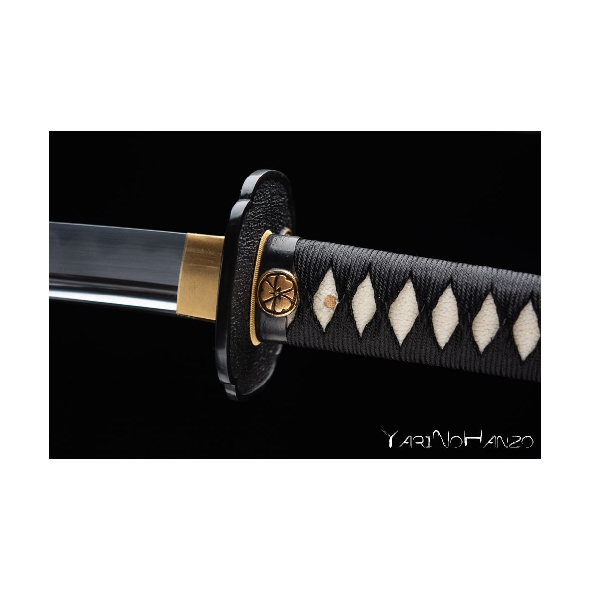 - Schwarzes Tsuka-Ito (Griffwicklung) aus Seide und traditionelle Mokko-Tsuba (Schwertstichblatt).