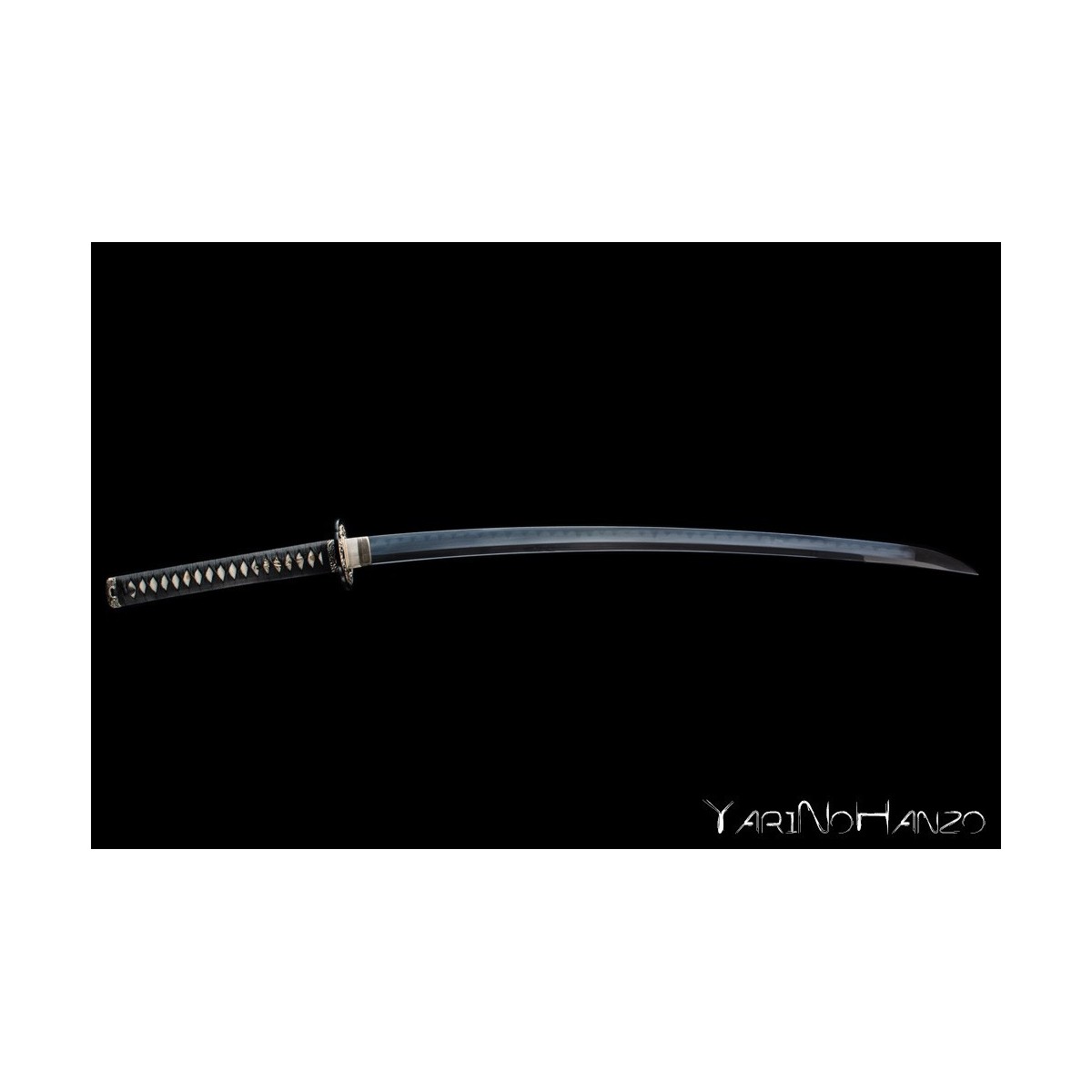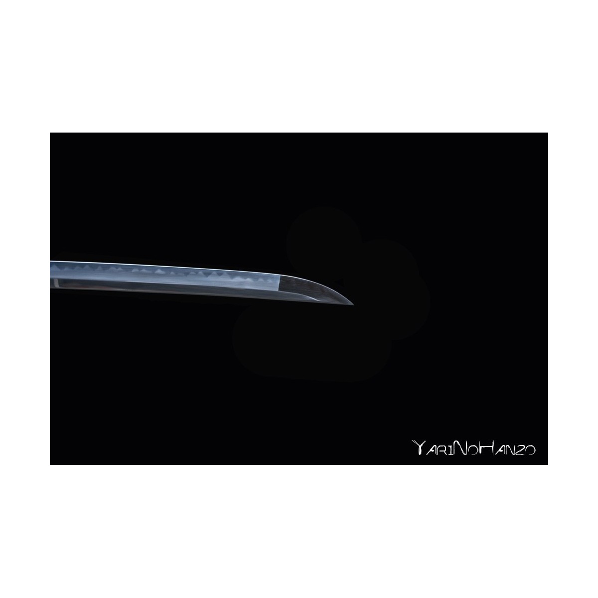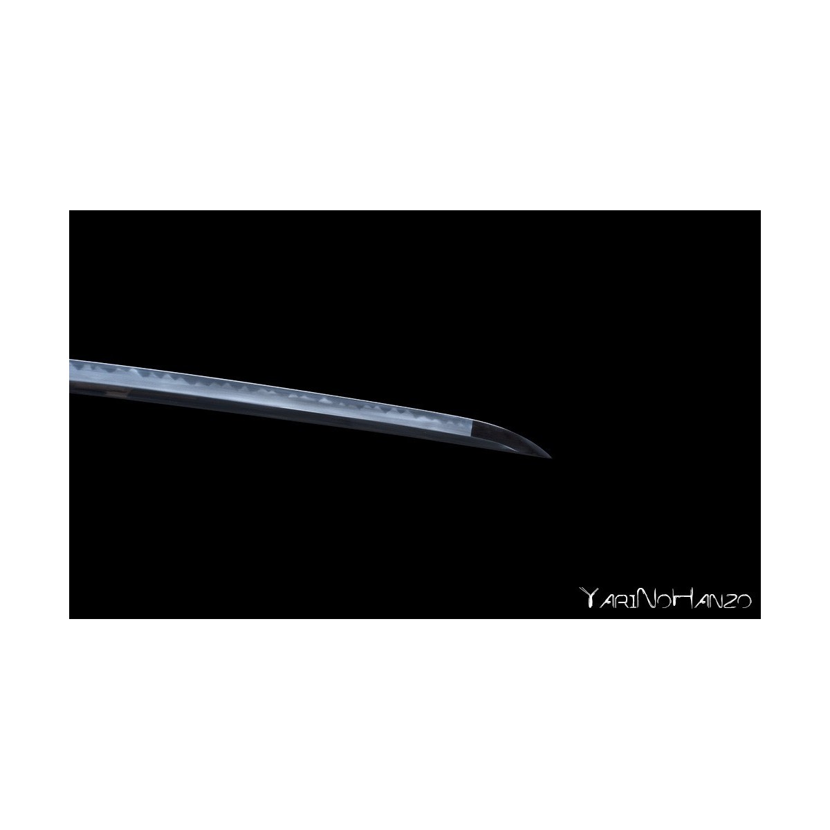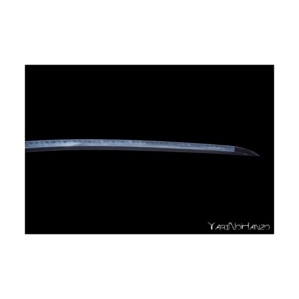 - Scharfe und breite Maru-Kitae-Klinge ohne Bo-Hi (Kanal) mit Ō-Kissaki (大切先, „große Kissaki“), handgeschmiedet aus 1095 hoch kohlenstoffhaltigem Stahl, selektiven Härtung Ton und echte Notare-Hamon (Begriffsklärung (Ha = Schneide, Mon = Muster)). Verbesserte Nakago mit Katte-Agari-Yasurime