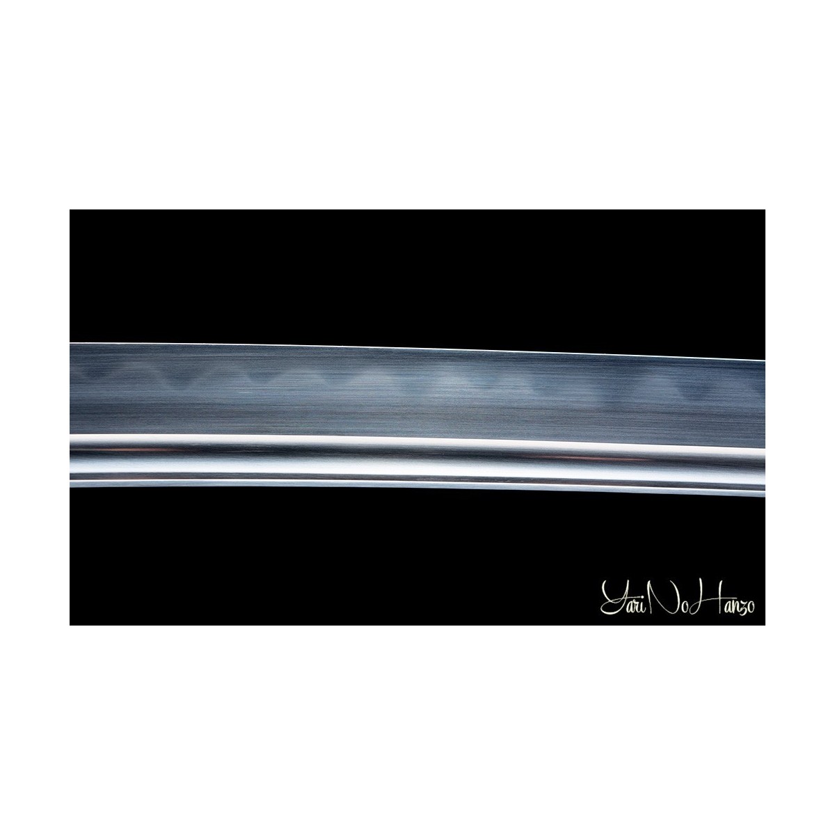 - Maru-Kitae-Klinge mit Bo-Hi (Kanal) handgeschmiedet aus 1095 hoch kohlenstoffhaltigem Stahl, selektiven Härtung Ton und echte Gunome-Choji-Hamon (Begriffsklärung (Ha = Schneide, Mon = Muster)). Verbesserte Nakago mit Katte-Agari-Yasurime